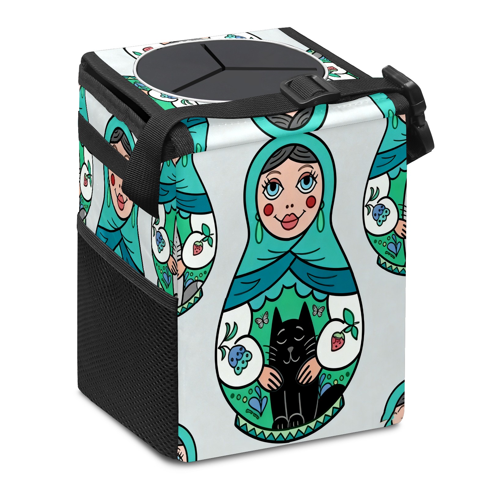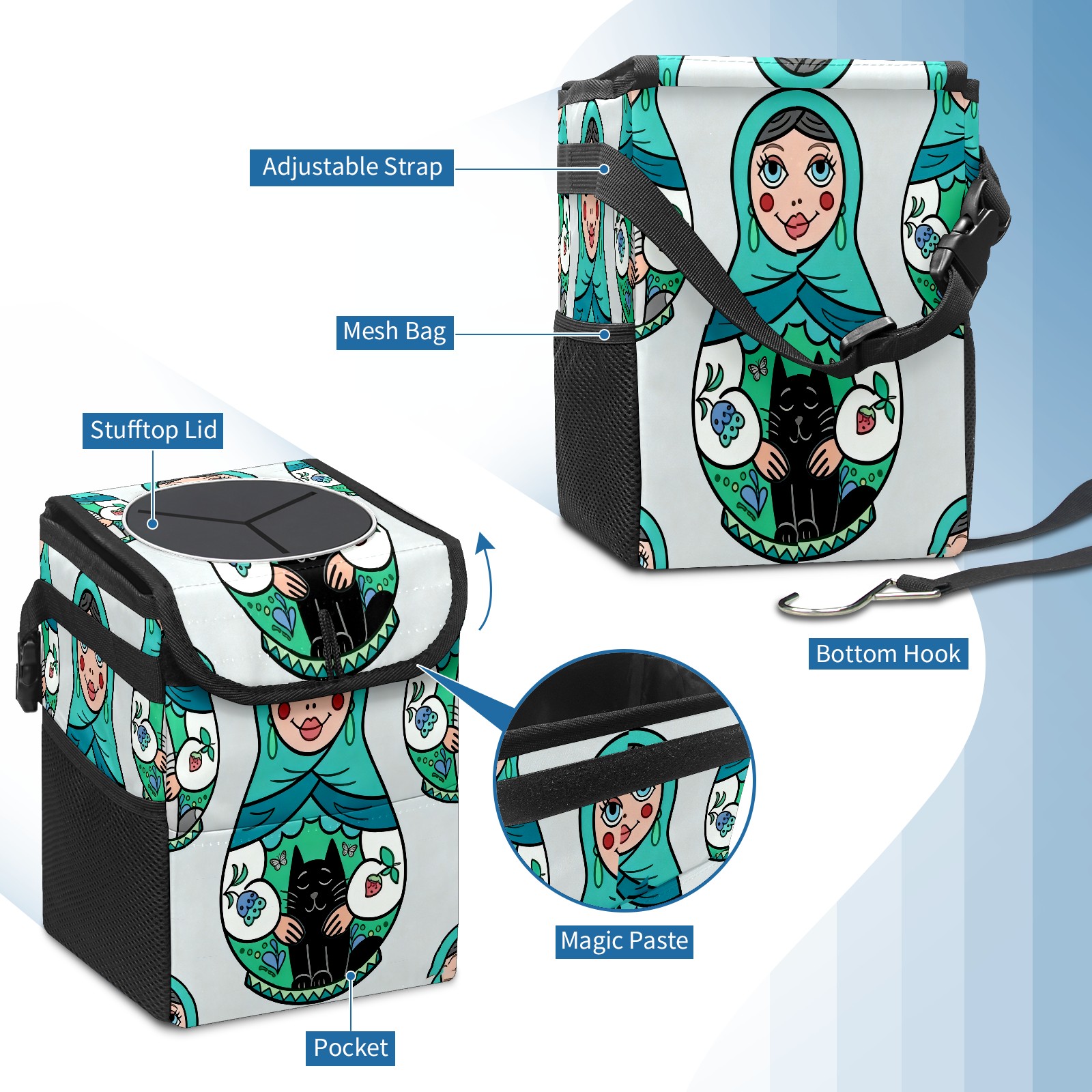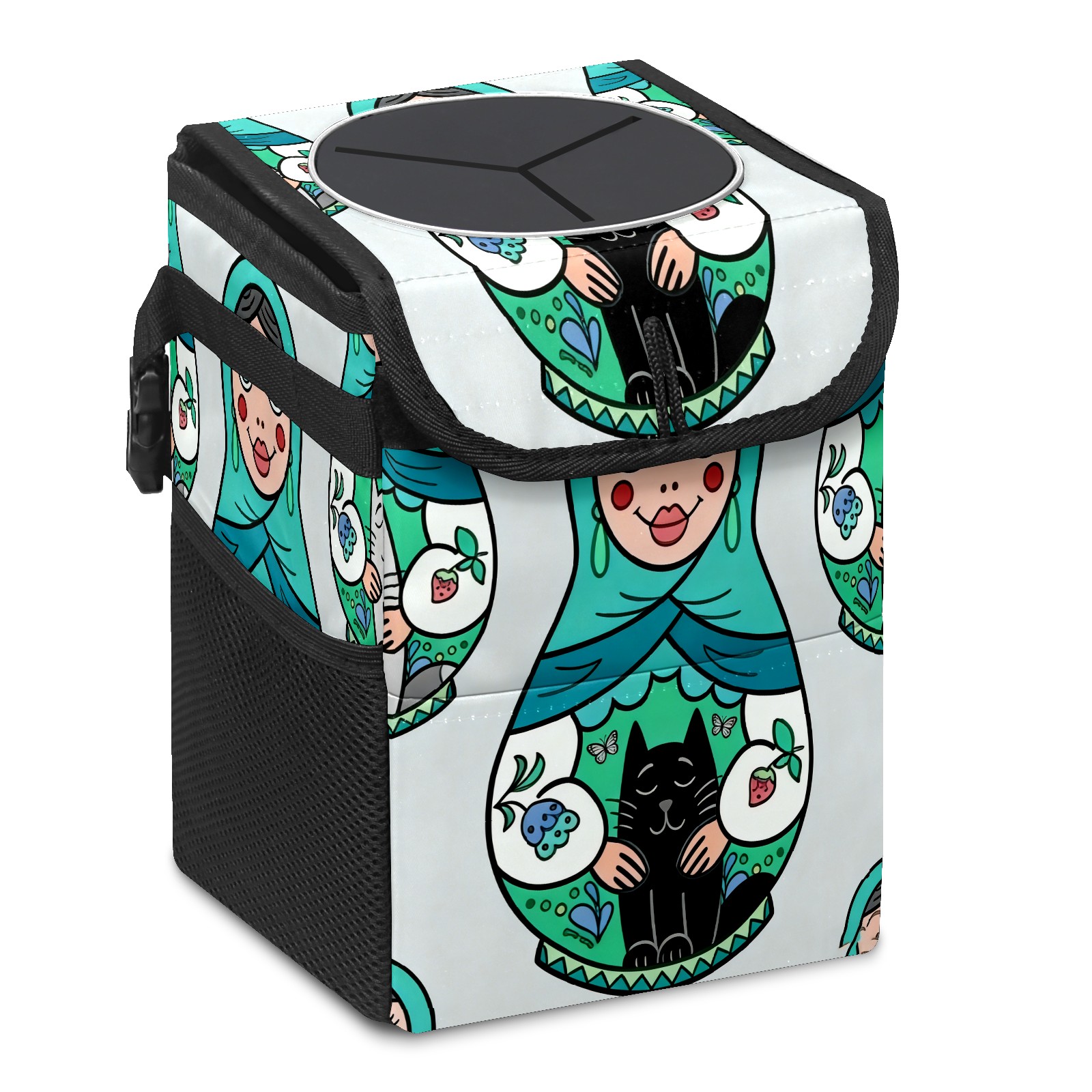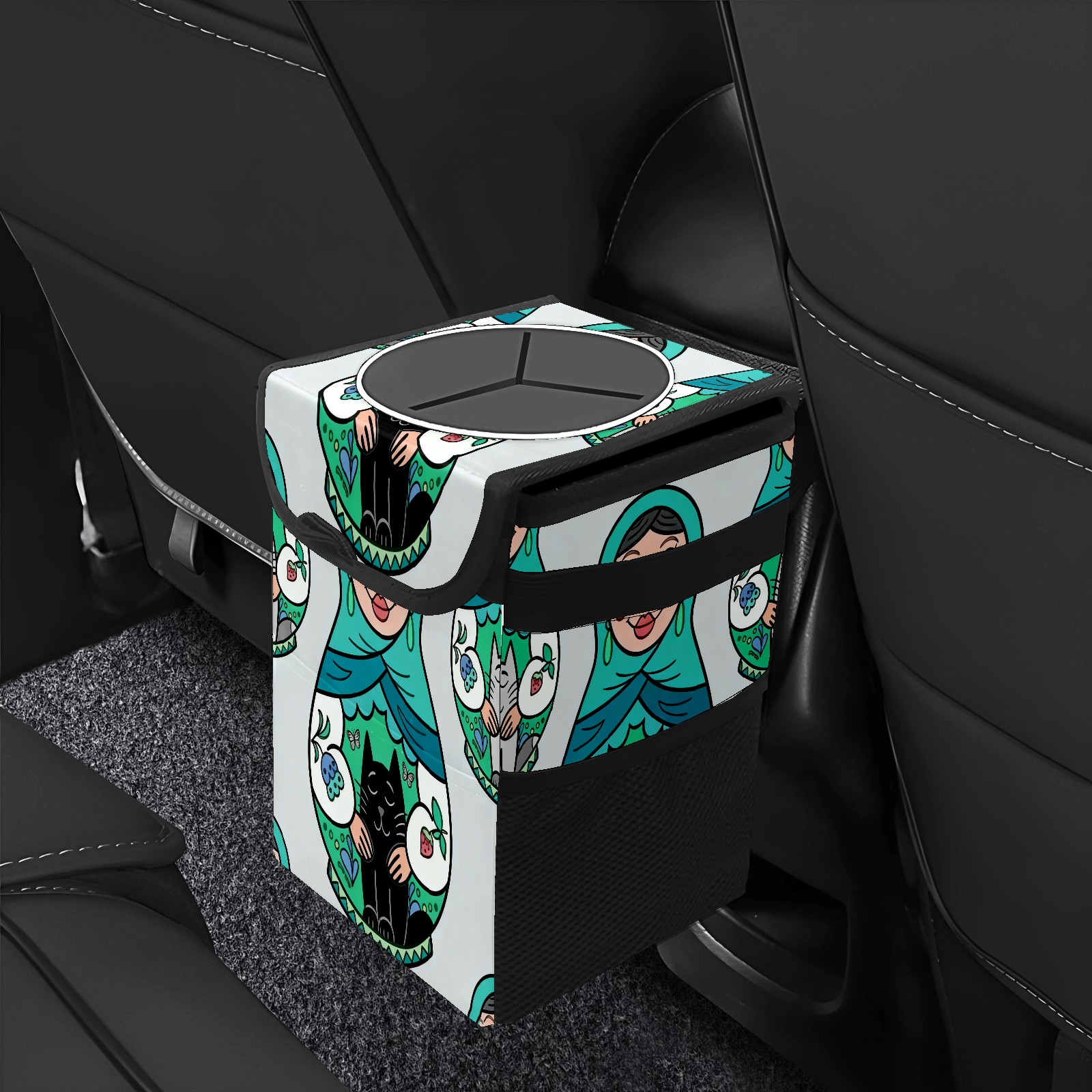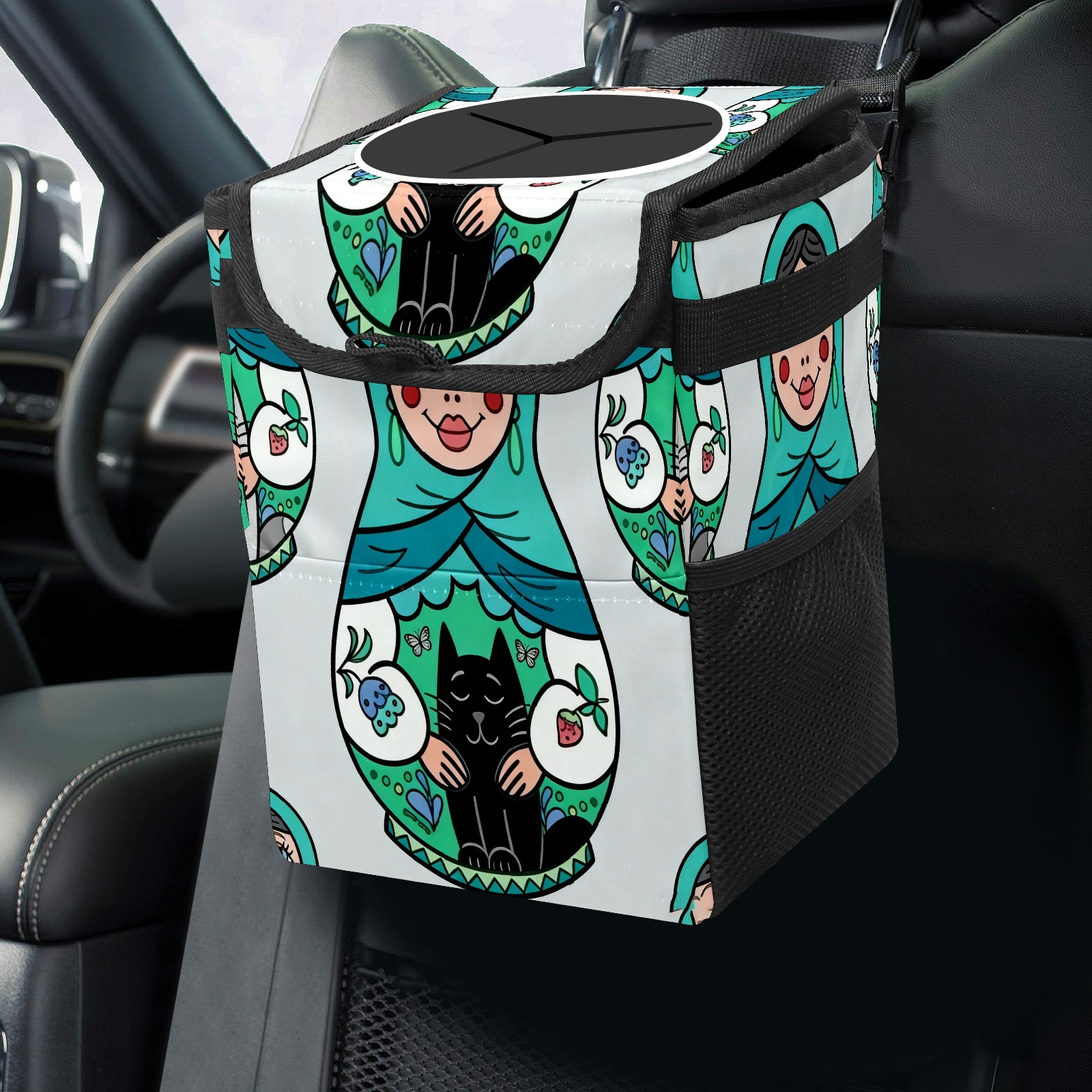 Small Collapsible Car Trash Can with Lid, Hanging Garbage Bin with Storage Pockets, Cool Dolls Green for Front/Back Seat, Car Interior Organizer Accessory