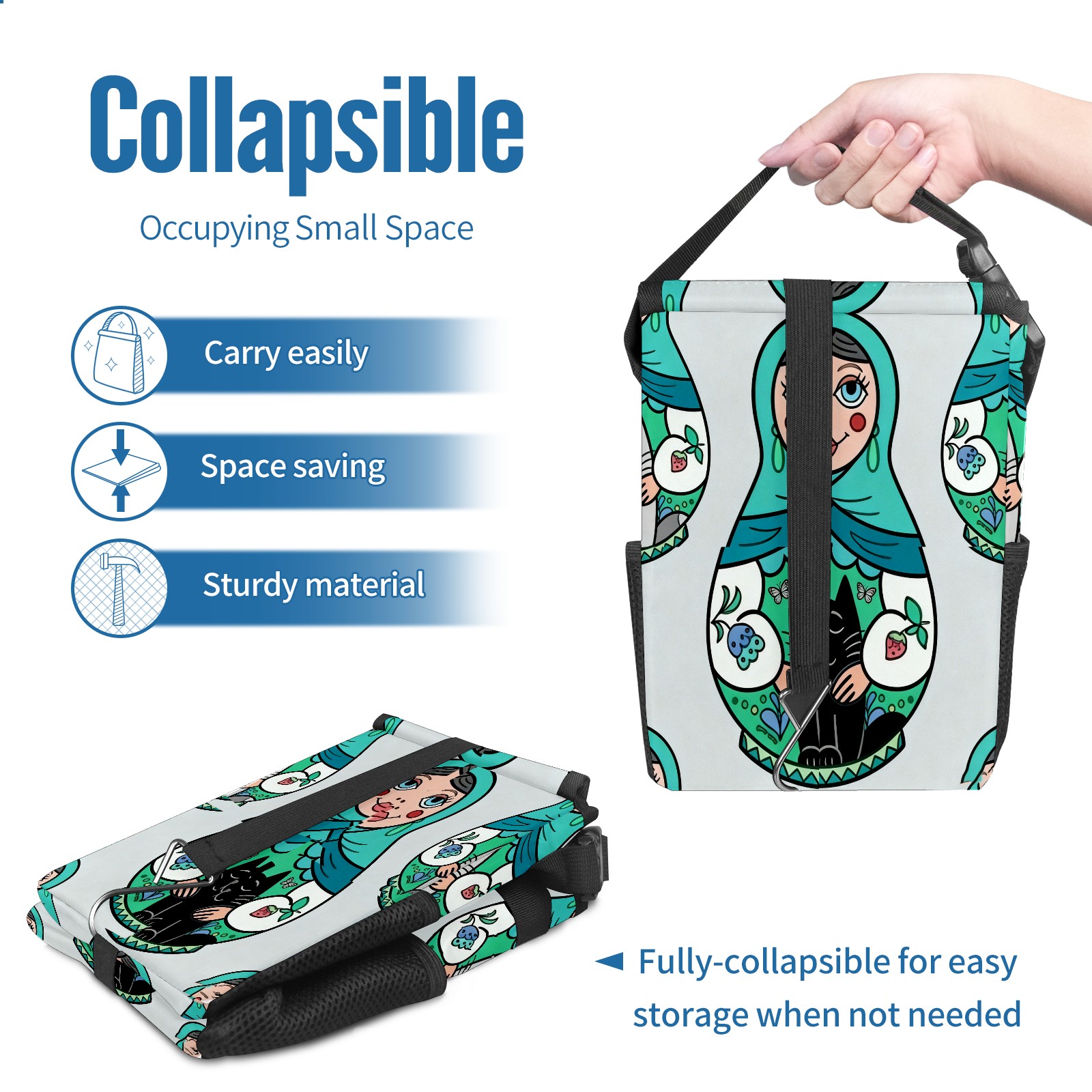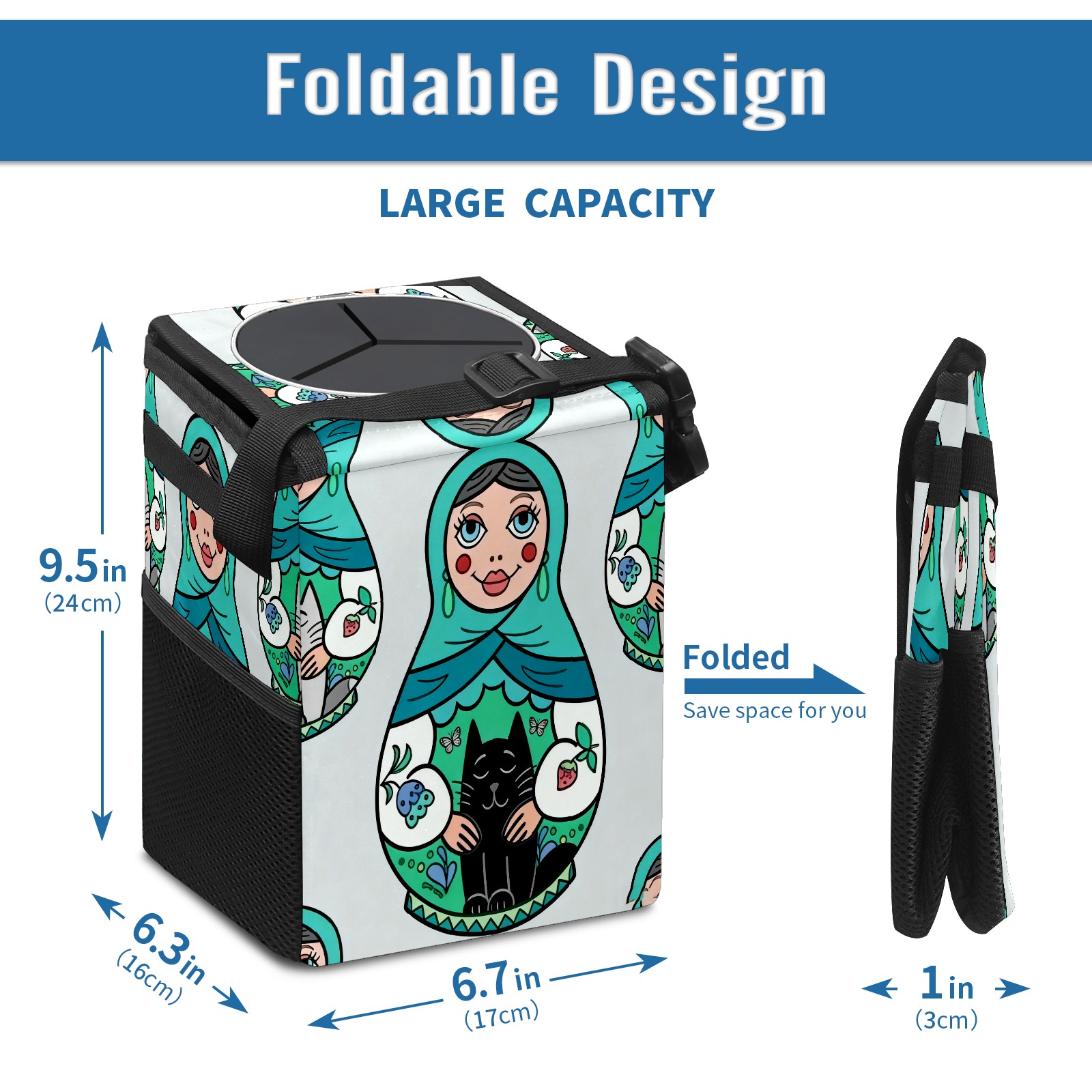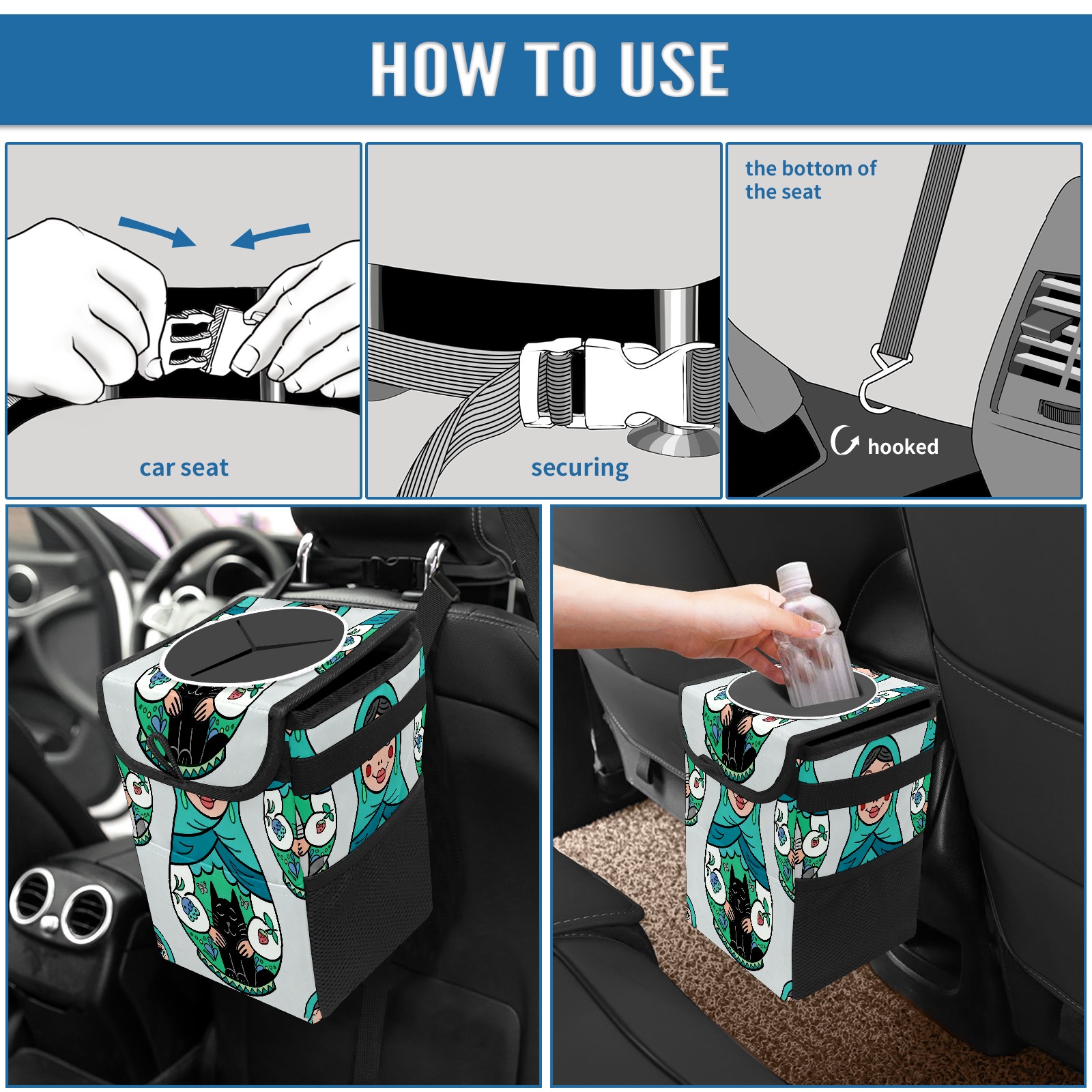 <p><strong> Keep Your Car Spotless!</strong></p><p>Our small, collapsible car trash can is the ultimate solution for a clutter-free ride. With a secure lid, multiple pockets, and stable hanging design, it's a must-have accessory.</p><p><strong>Key Features</strong></p><ul><li><strong>Odor Control:</strong> Rubber-sealed lid traps smells; works with standard trash bags.</li><li><strong>Extra Storage:</strong> Mesh pockets and front pouch keep essentials handy.</li><li><strong>Secure Fit:</strong> Strap and hooks ensure it stays in place on any surface.</li><li><strong>Space-Saving:</strong> Fold flat when not in use to maximize storage.</li><li><strong>Stylish &amp; Durable:</strong> Full-print twill fabric is built to last.</li></ul><p><strong>Specs</strong></p><p>Size: 24*17*16cm | Material: Twill Weave + Webbing | Care: Hand wash, avoid sun exposure.</p>