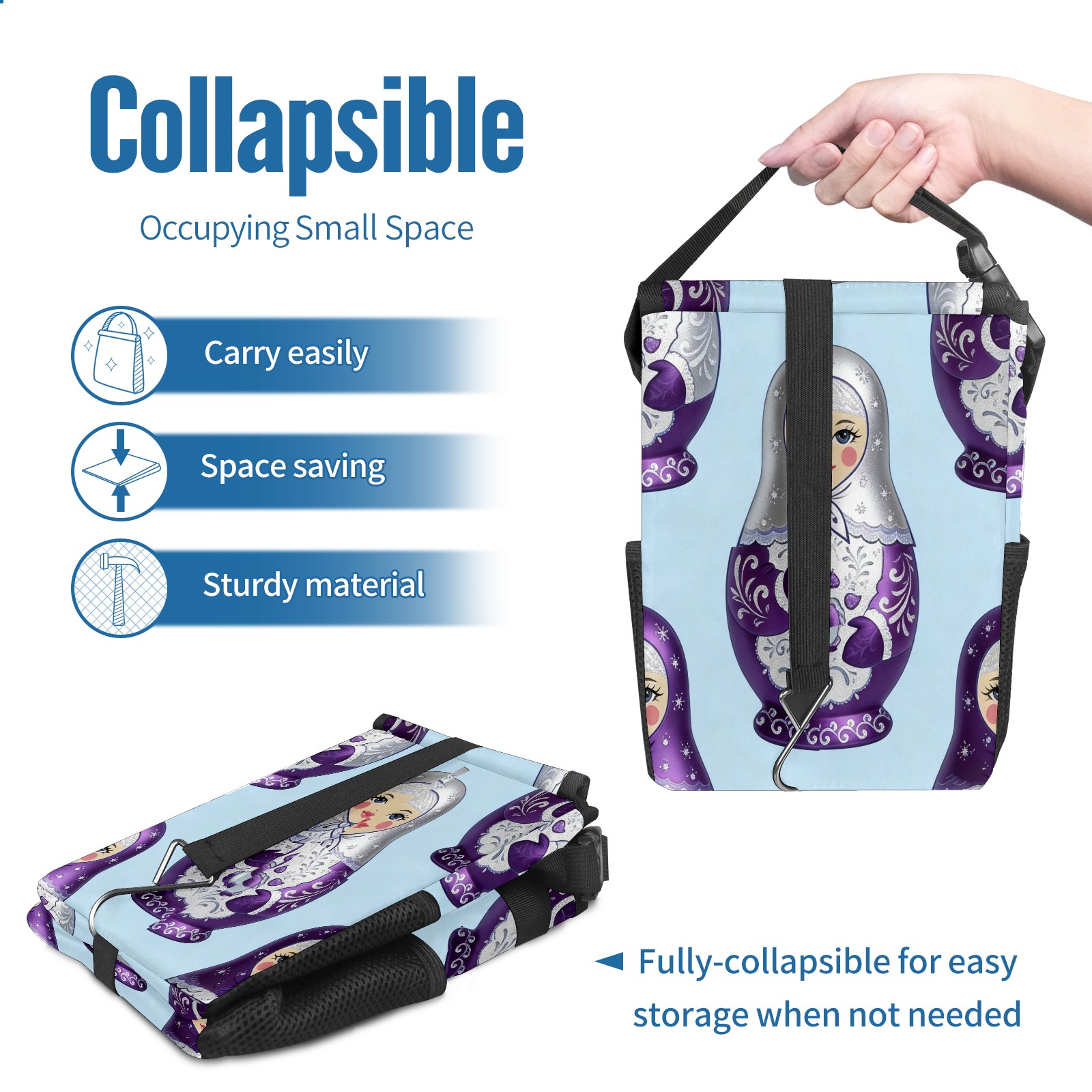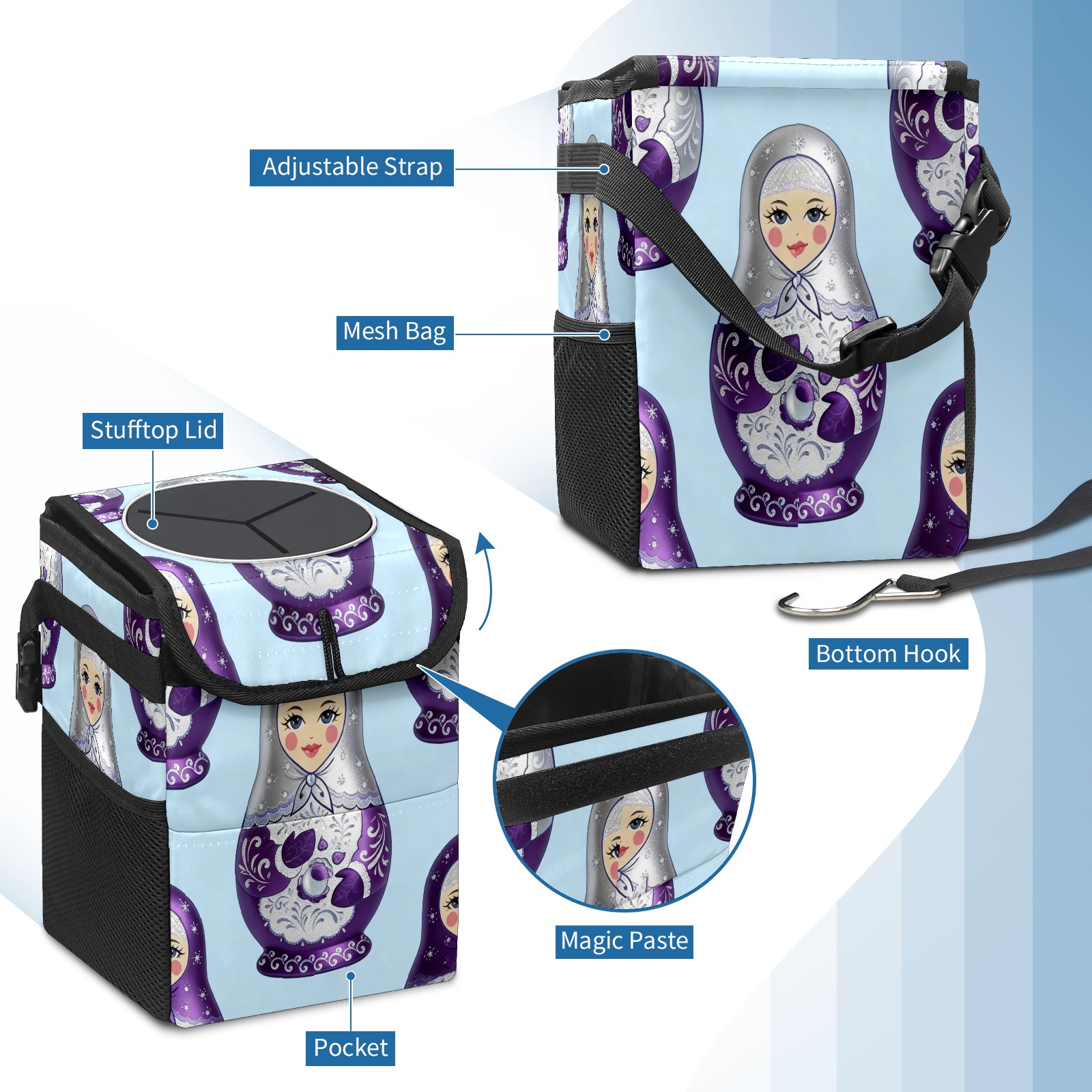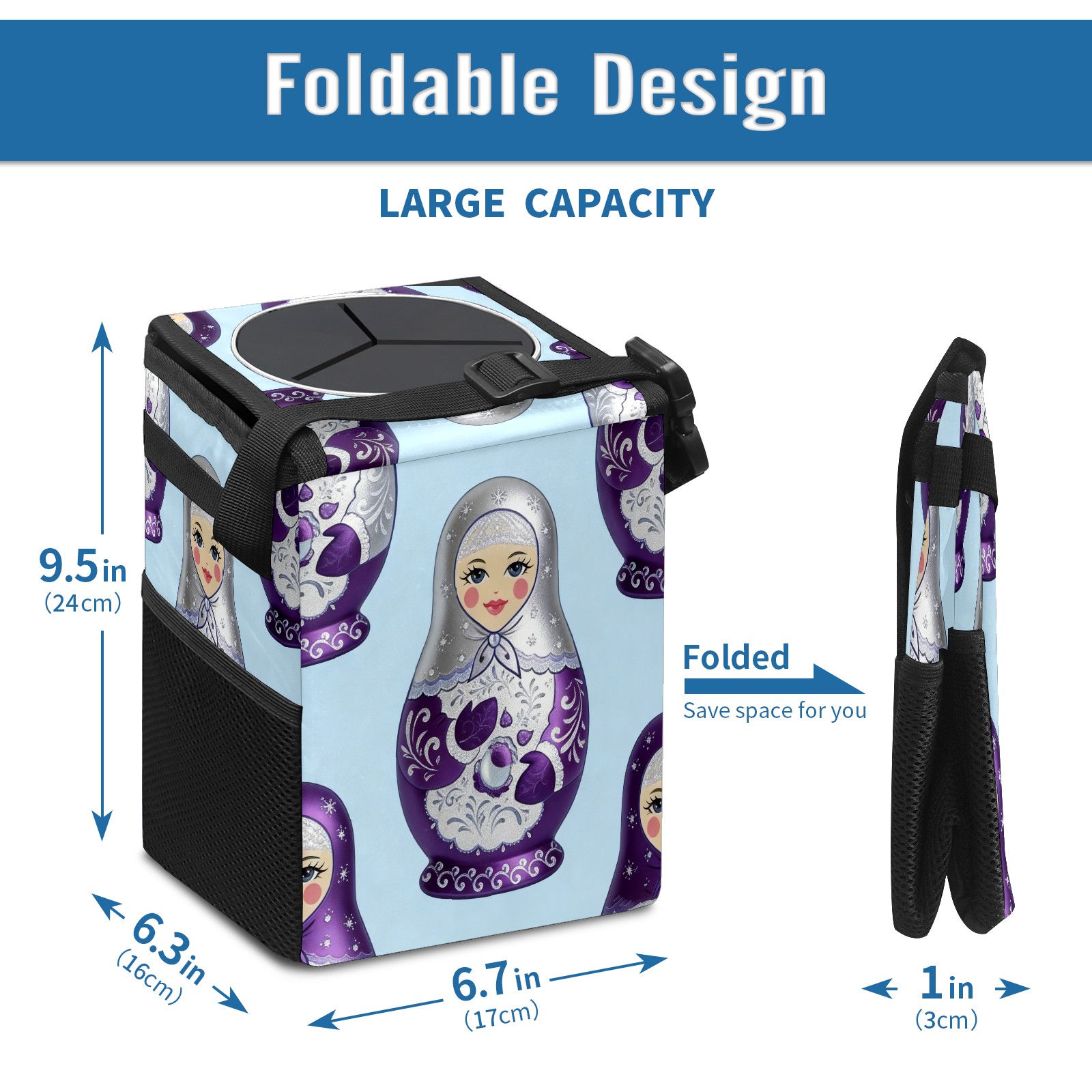 <p><strong> Keep Your Car Spotless!</strong></p><p>Our small, collapsible car trash can is the ultimate solution for a clutter-free ride. With a secure lid, multiple pockets, and stable hanging design, it's a must-have accessory.</p><p><strong>Key Features</strong></p><ul><li><strong>Odor Control:</strong> Rubber-sealed lid traps smells; works with standard trash bags.</li><li><strong>Extra Storage:</strong> Mesh pockets and front pouch keep essentials handy.</li><li><strong>Secure Fit:</strong> Strap and hooks ensure it stays in place on any surface.</li><li><strong>Space-Saving:</strong> Fold flat when not in use to maximize storage.</li><li><strong>Stylish &amp; Durable:</strong> Full-print twill fabric is built to last.</li></ul><p><strong>Specs</strong></p><p>Size: 24*17*16cm | Material: Twill Weave + Webbing | Care: Hand wash, avoid sun exposure.</p>