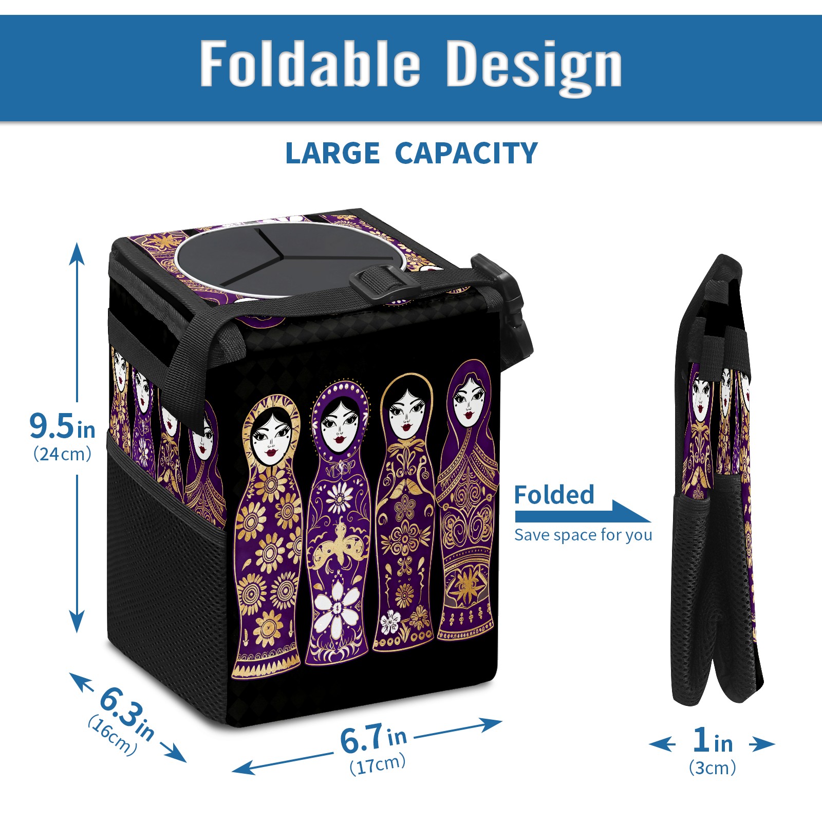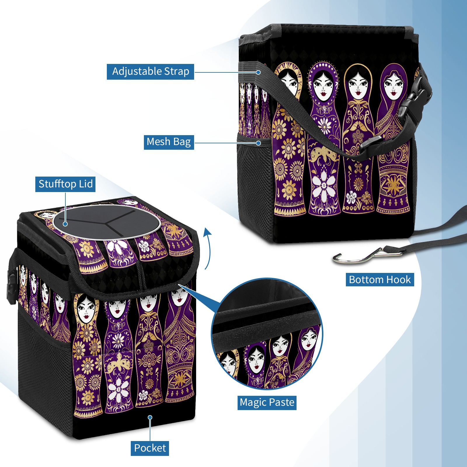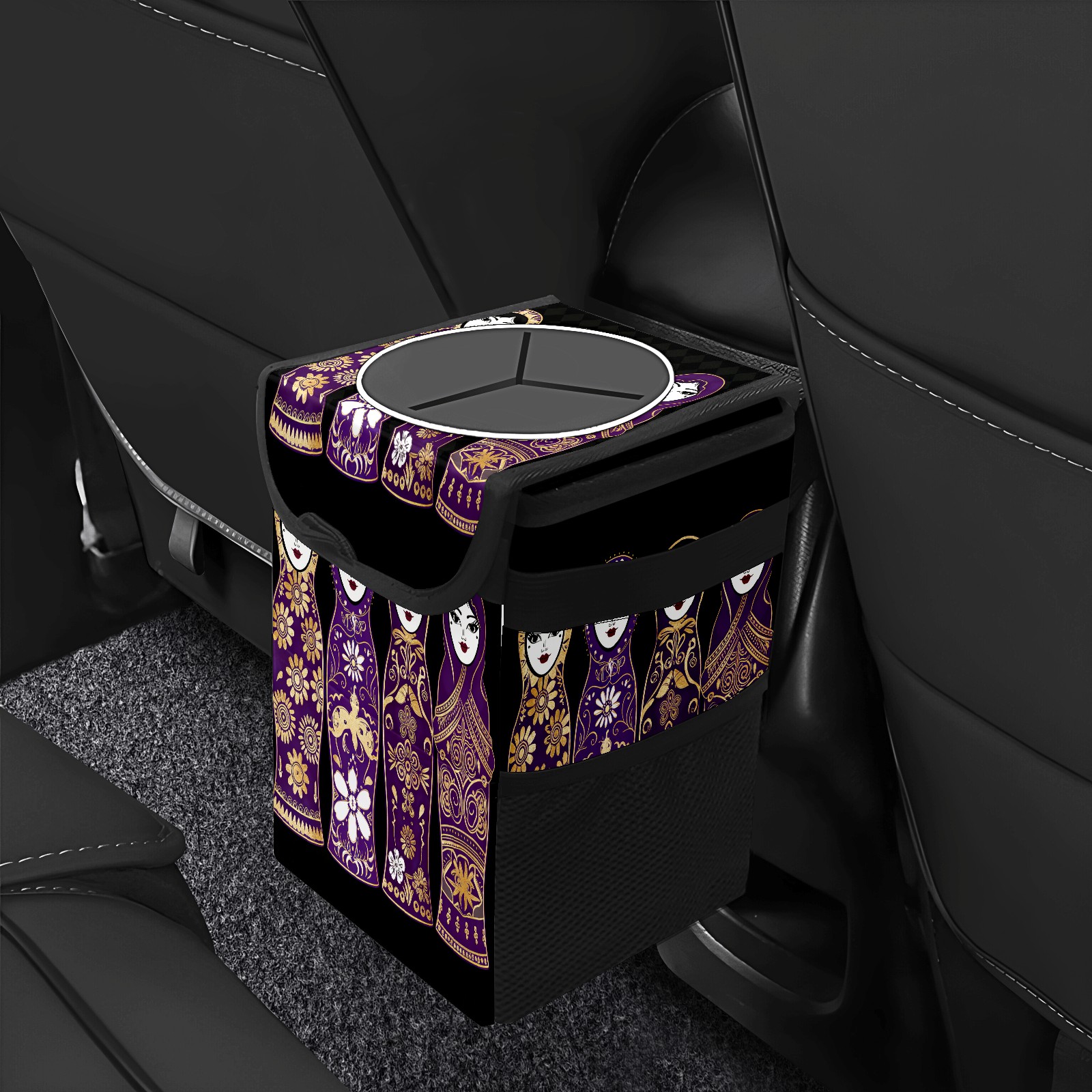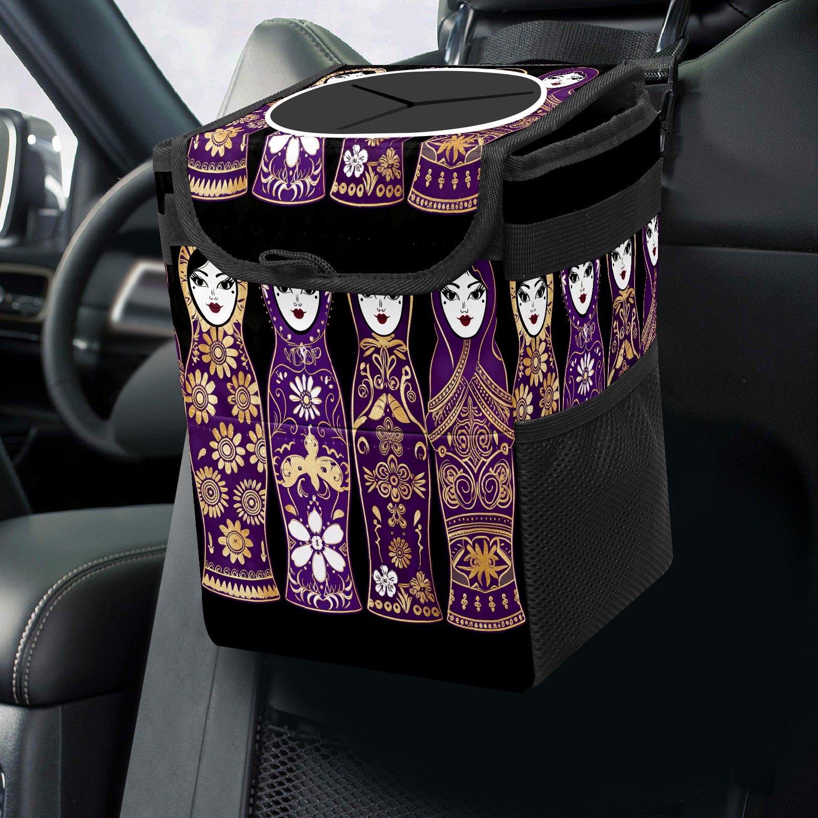 Small Collapsible Car Trash Can with Lid, Hanging Garbage Bin with Storage Pockets, Mysterious Dolls Purple for Front/Back Seat, Car Interior Organizer Accessory