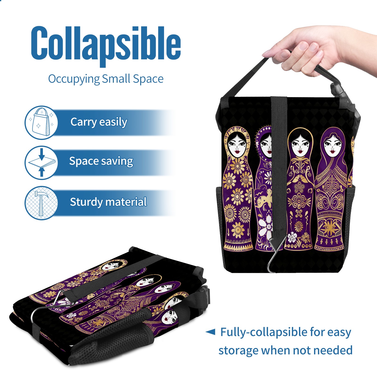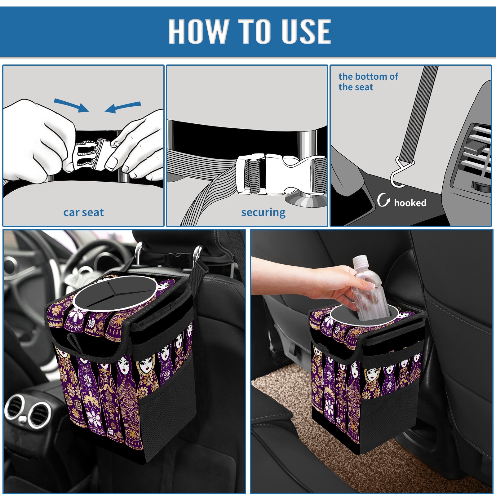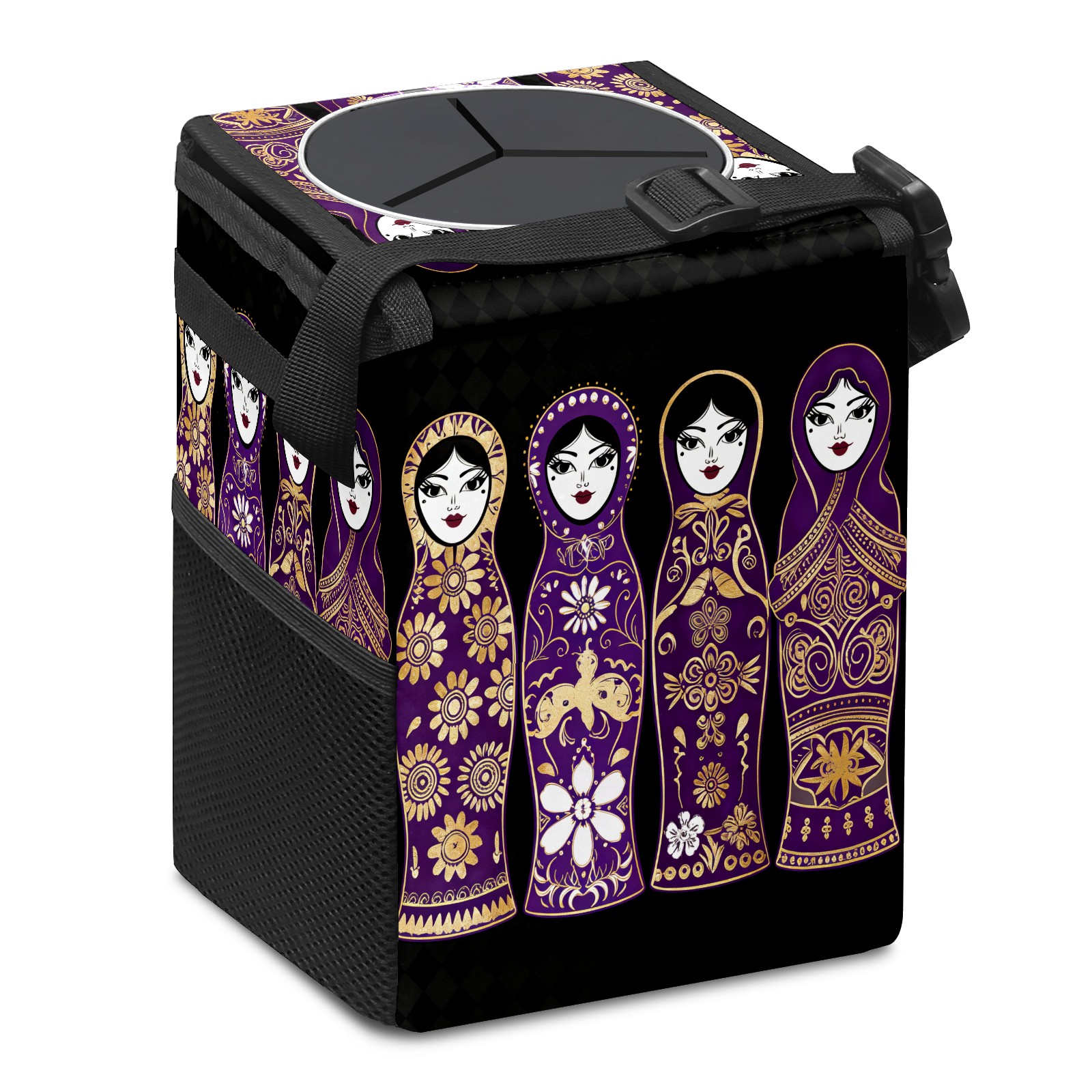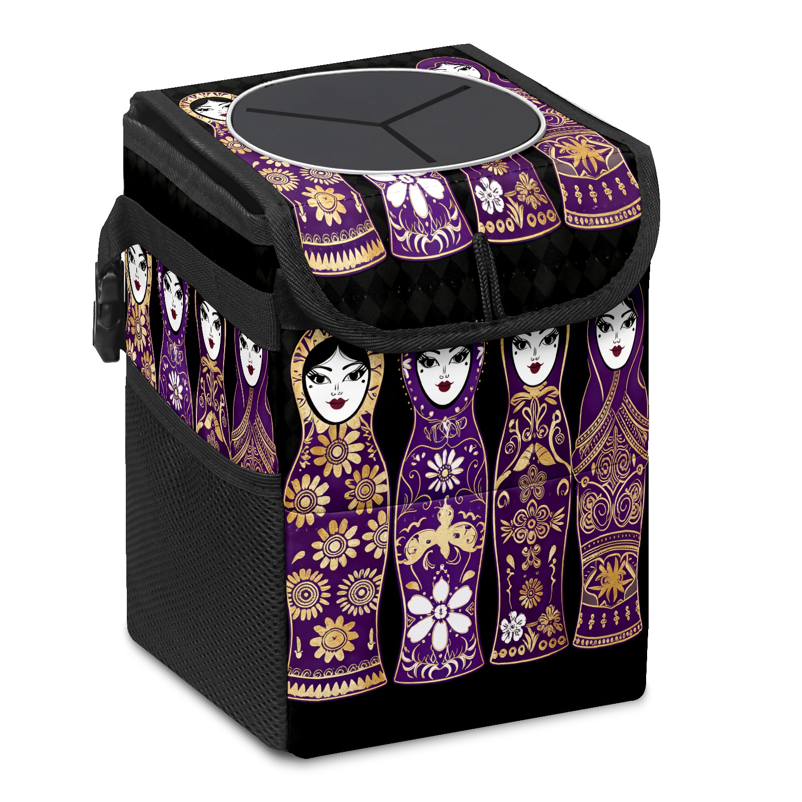 Small Collapsible Car Trash Can with Lid, Hanging Garbage Bin with Storage Pockets, Mysterious Dolls Purple for Front/Back Seat, Car Interior Organizer Accessory