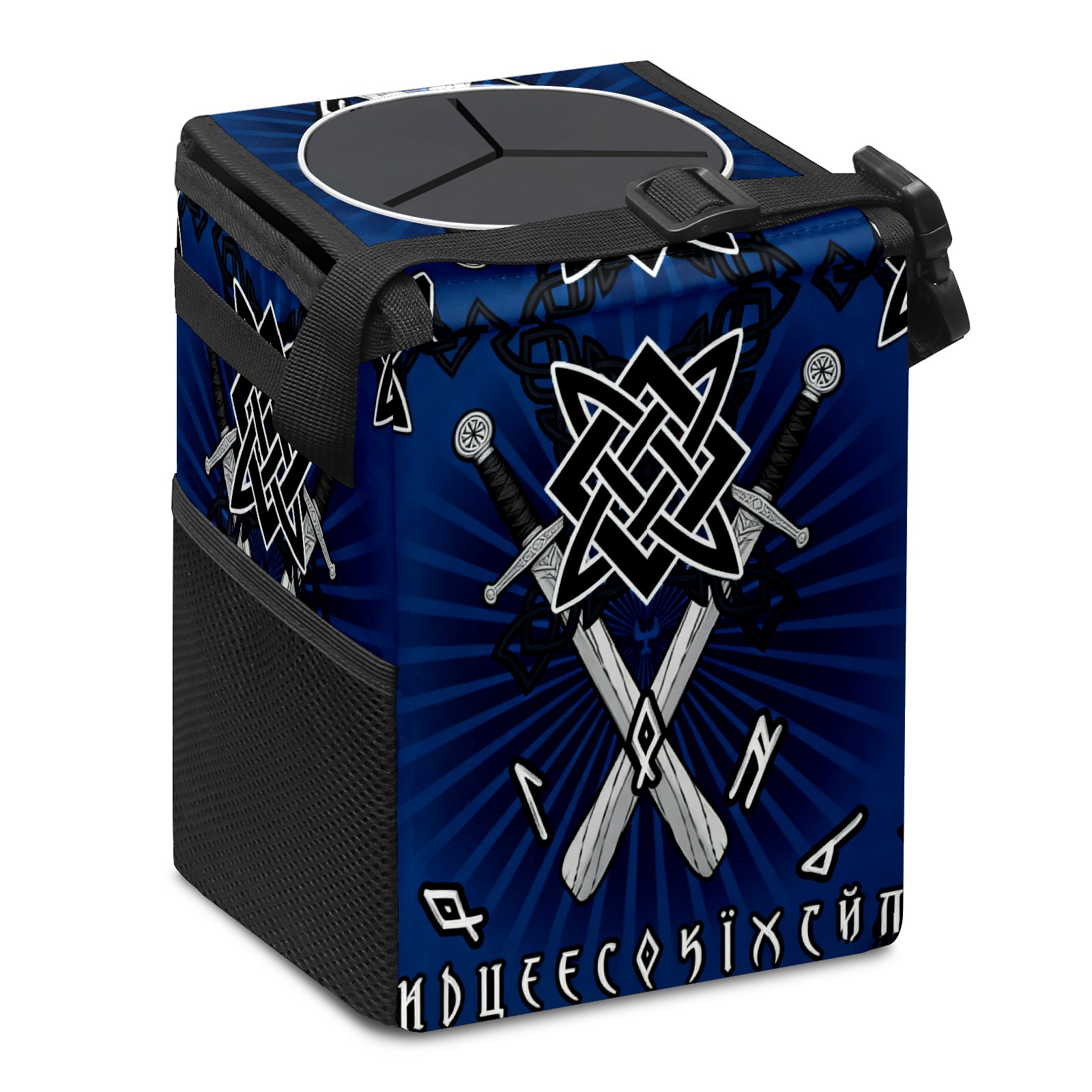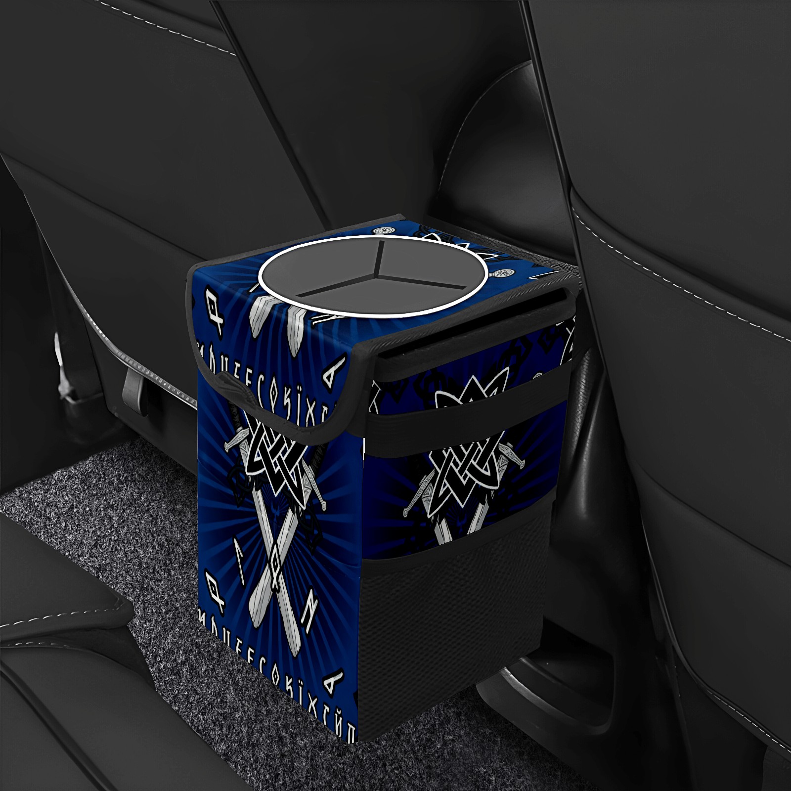Small Collapsible Car Trash Can with Lid, Hanging Garbage Bin with Storage Pockets, Classic Patterns Blue for Front/Back Seat, Car Interior Organizer Accessory