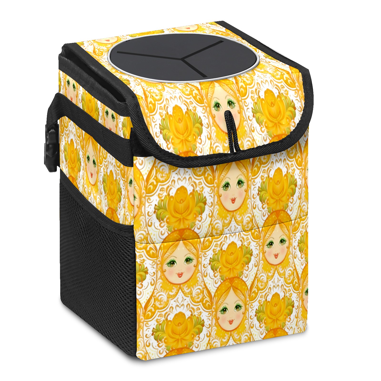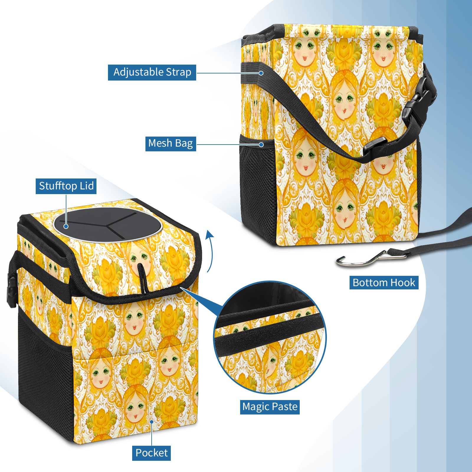 Small Collapsible Car Trash Can with Lid, Hanging Garbage Bin with Storage Pockets, Warm Dolls Yellow for Front/Back Seat, Car Interior Organizer Accessory