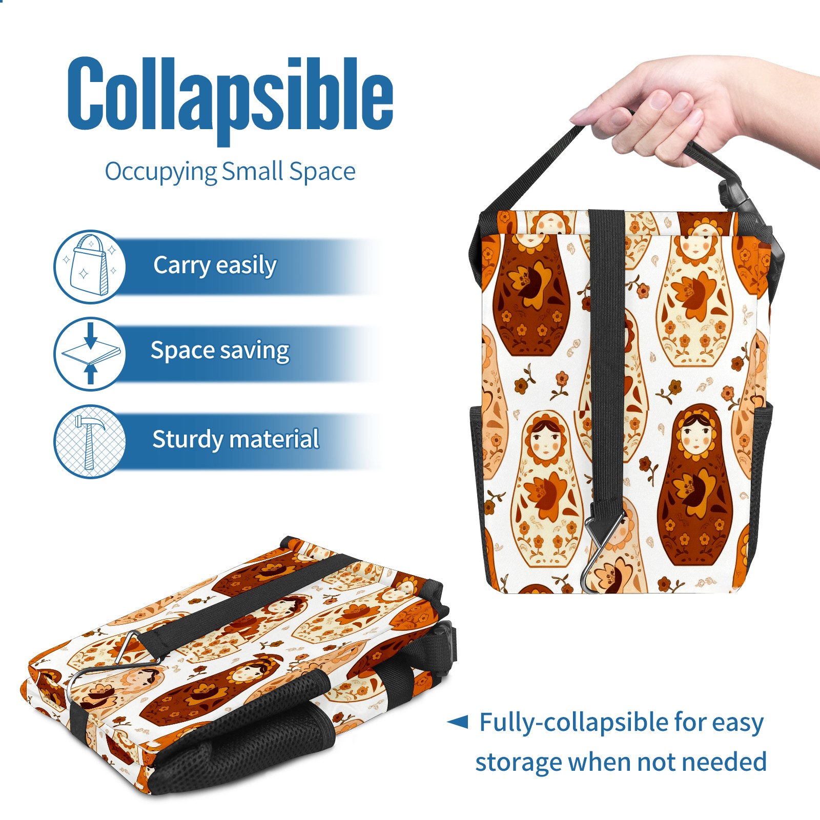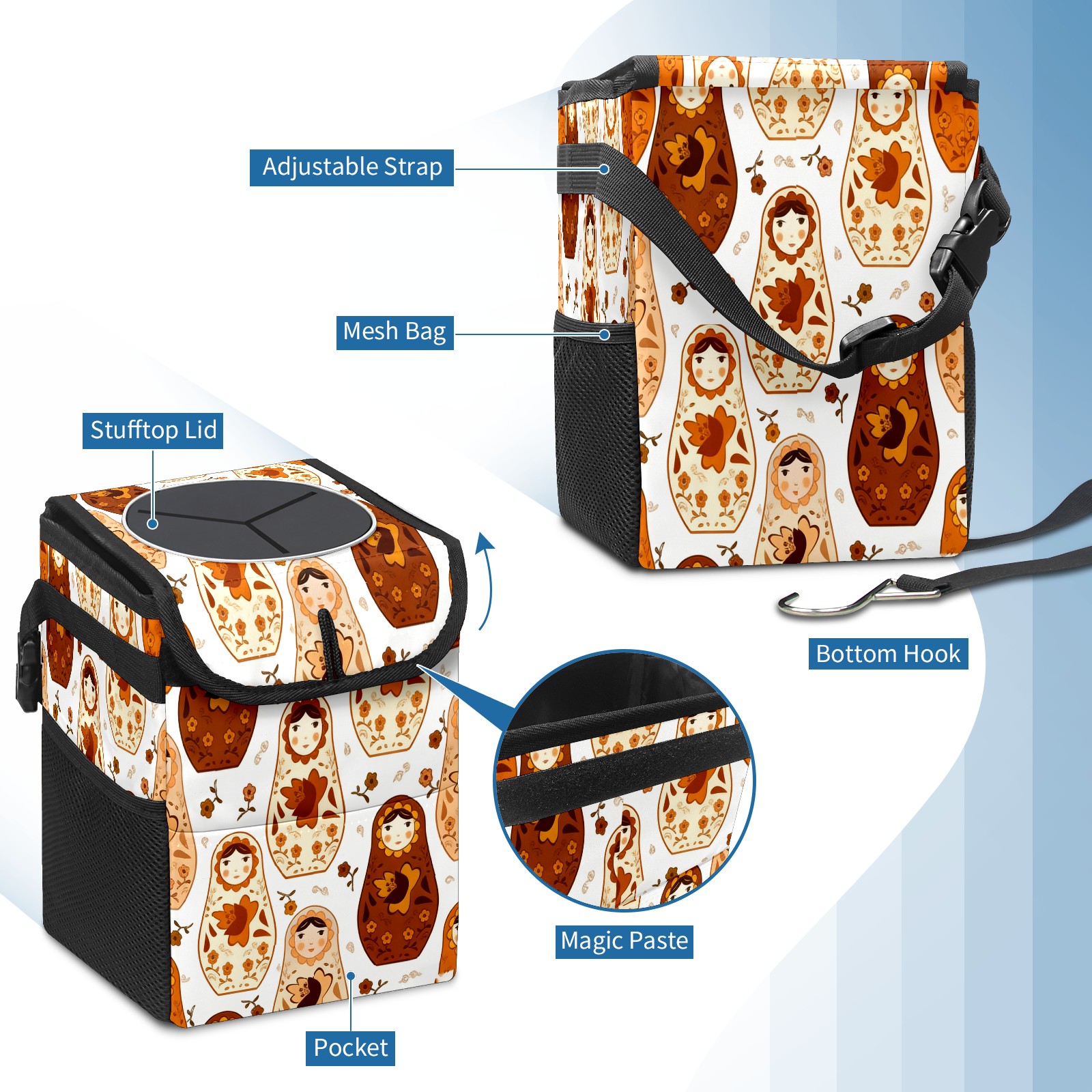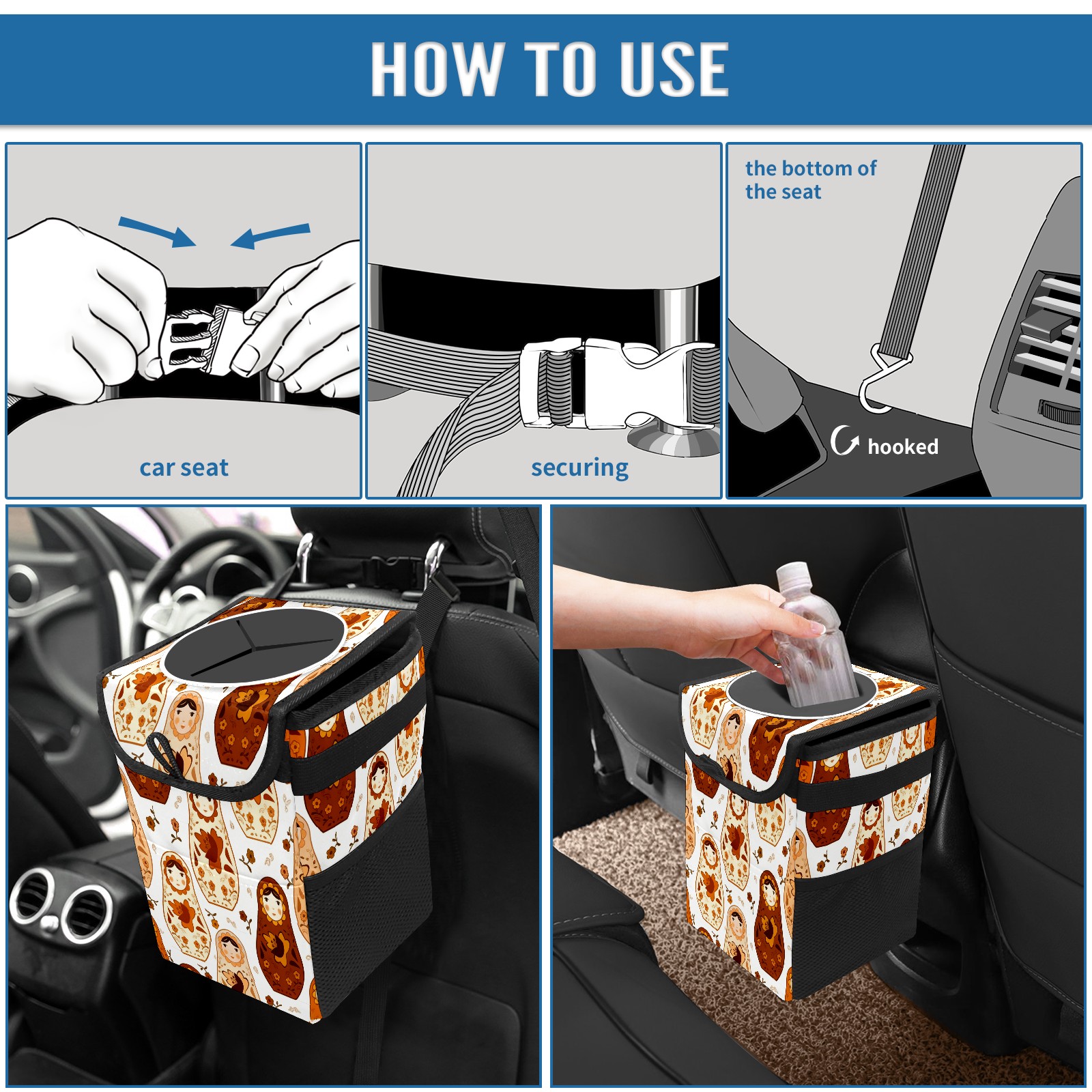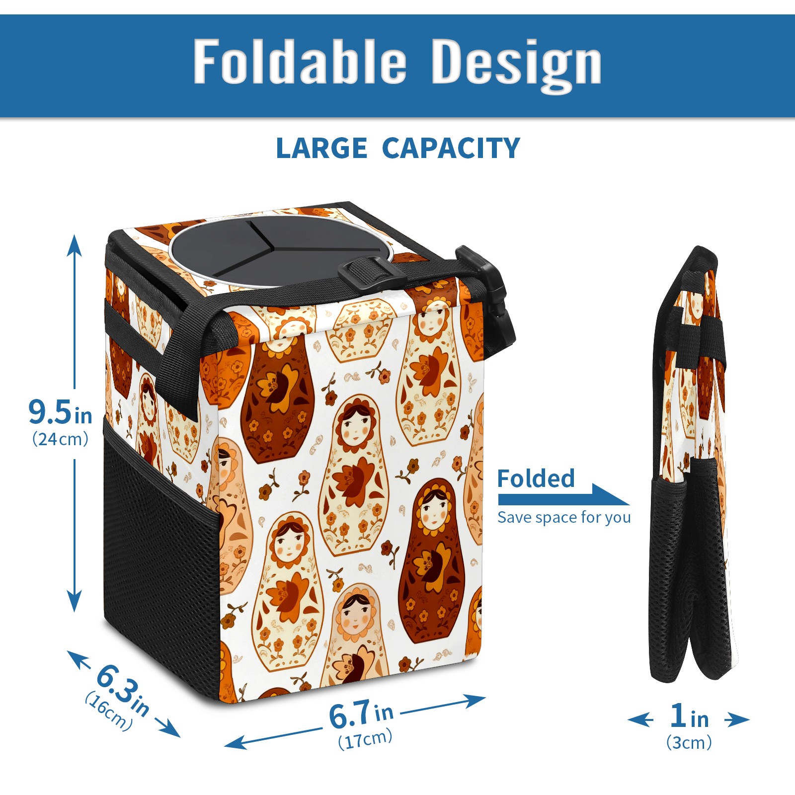 <p><strong> Keep Your Car Spotless!</strong></p><p>Our small, collapsible car trash can is the ultimate solution for a clutter-free ride. With a secure lid, multiple pockets, and stable hanging design, it's a must-have accessory.</p><p><strong>Key Features</strong></p><ul><li><strong>Odor Control:</strong> Rubber-sealed lid traps smells; works with standard trash bags.</li><li><strong>Extra Storage:</strong> Mesh pockets and front pouch keep essentials handy.</li><li><strong>Secure Fit:</strong> Strap and hooks ensure it stays in place on any surface.</li><li><strong>Space-Saving:</strong> Fold flat when not in use to maximize storage.</li><li><strong>Stylish &amp; Durable:</strong> Full-print twill fabric is built to last.</li></ul><p><strong>Specs</strong></p><p>Size: 24*17*16cm | Material: Twill Weave + Webbing | Care: Hand wash, avoid sun exposure.</p>