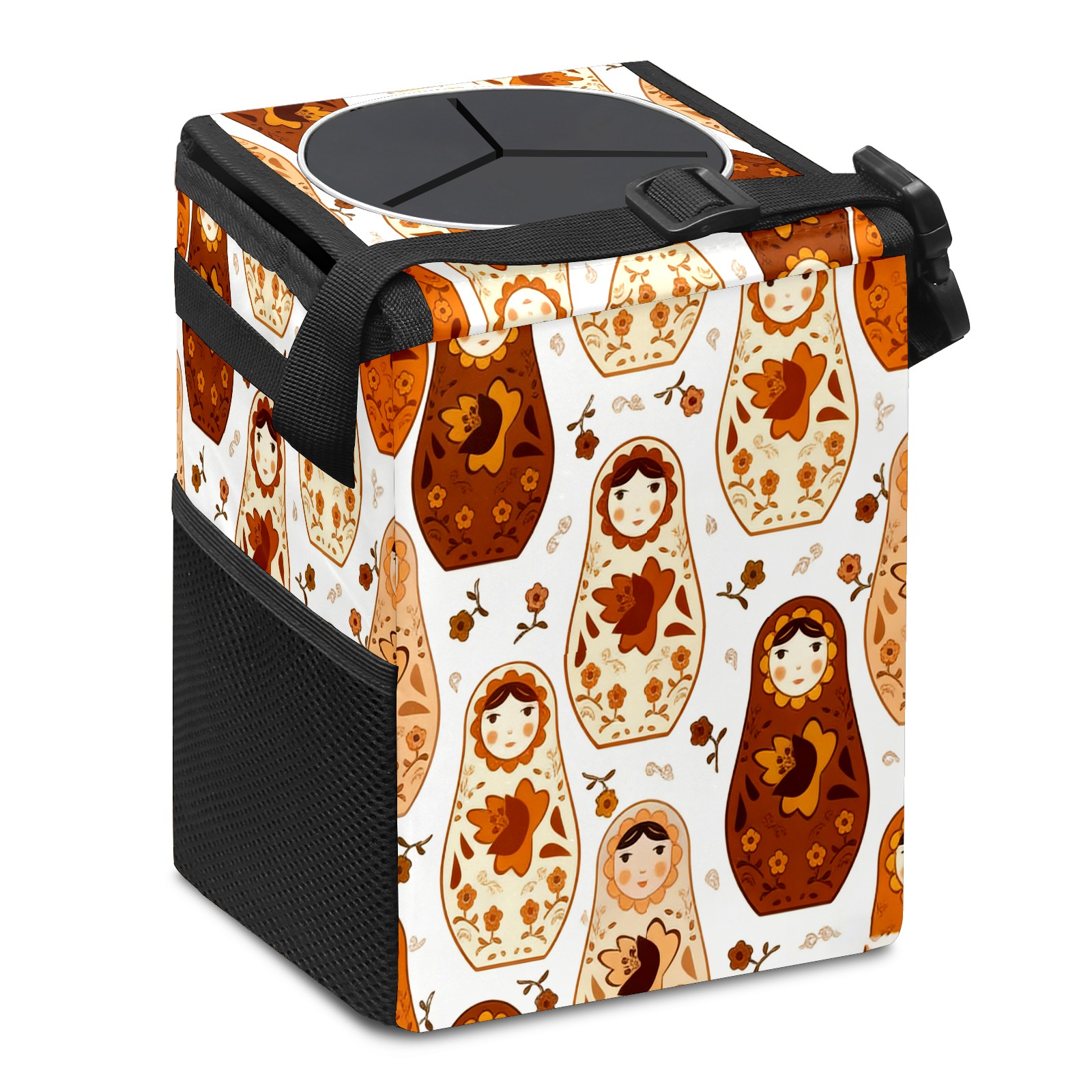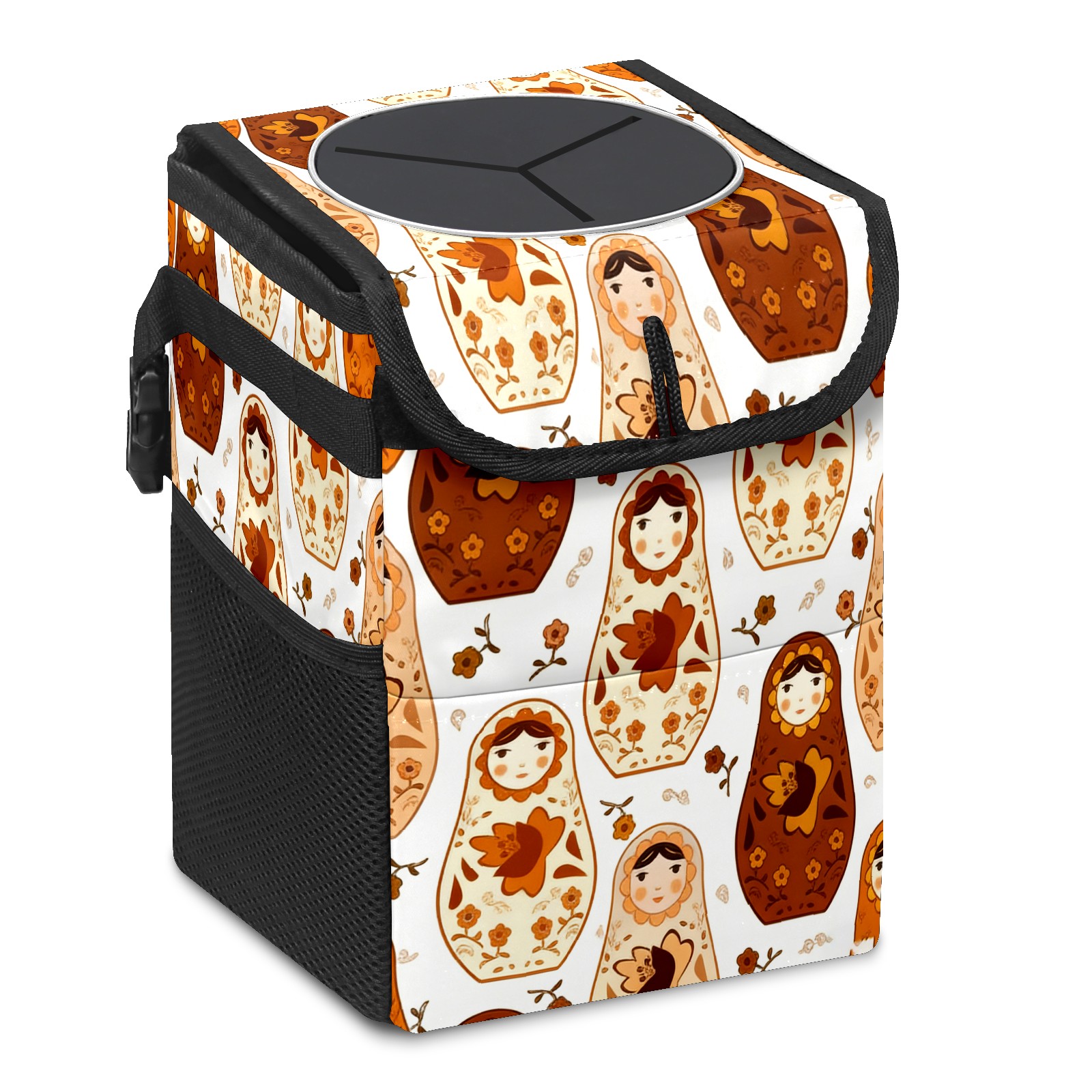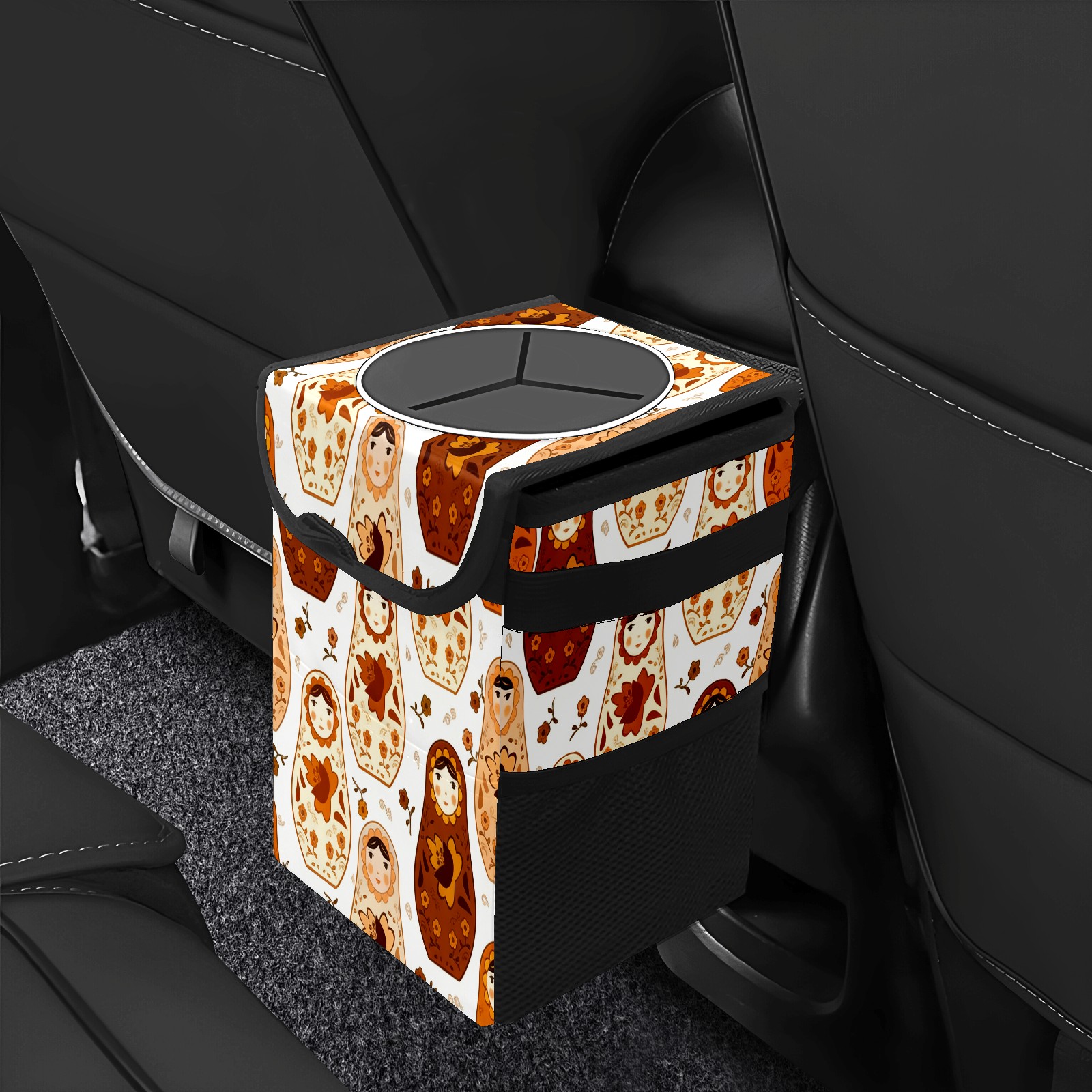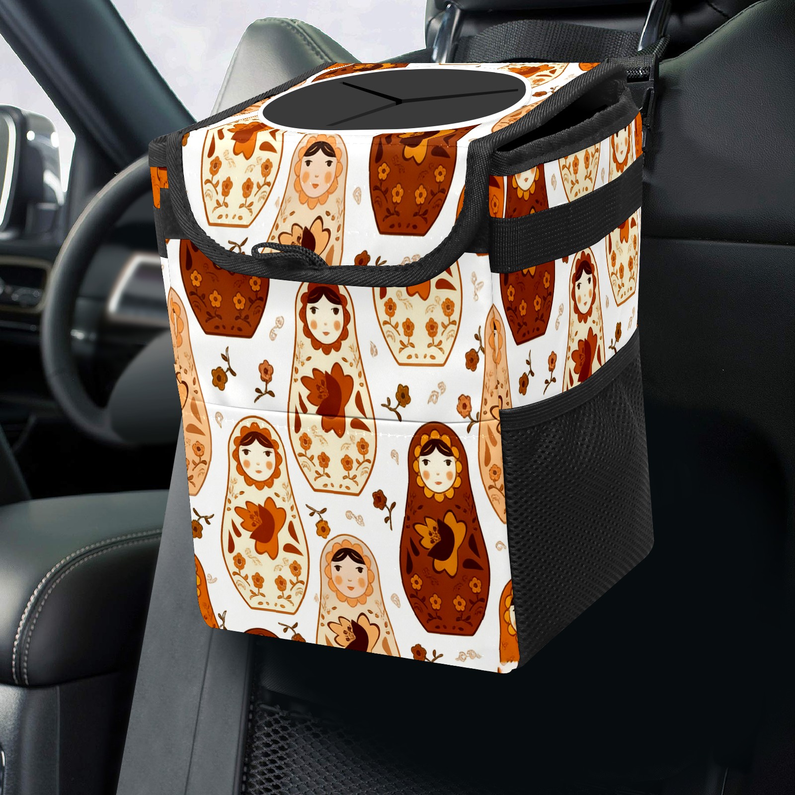 Small Collapsible Car Trash Can with Lid, Hanging Garbage Bin with Storage Pockets, Calm Dolls Brown for Front/Back Seat, Car Interior Organizer Accessory