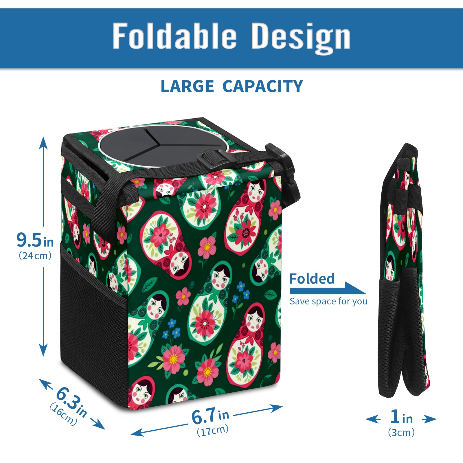 <p><strong> Keep Your Car Spotless!</strong></p><p>Our small, collapsible car trash can is the ultimate solution for a clutter-free ride. With a secure lid, multiple pockets, and stable hanging design, it's a must-have accessory.</p><p><strong>Key Features</strong></p><ul><li><strong>Odor Control:</strong> Rubber-sealed lid traps smells; works with standard trash bags.</li><li><strong>Extra Storage:</strong> Mesh pockets and front pouch keep essentials handy.</li><li><strong>Secure Fit:</strong> Strap and hooks ensure it stays in place on any surface.</li><li><strong>Space-Saving:</strong> Fold flat when not in use to maximize storage.</li><li><strong>Stylish &amp; Durable:</strong> Full-print twill fabric is built to last.</li></ul><p><strong>Specs</strong></p><p>Size: 24*17*16cm | Material: Twill Weave + Webbing | Care: Hand wash, avoid sun exposure.</p>