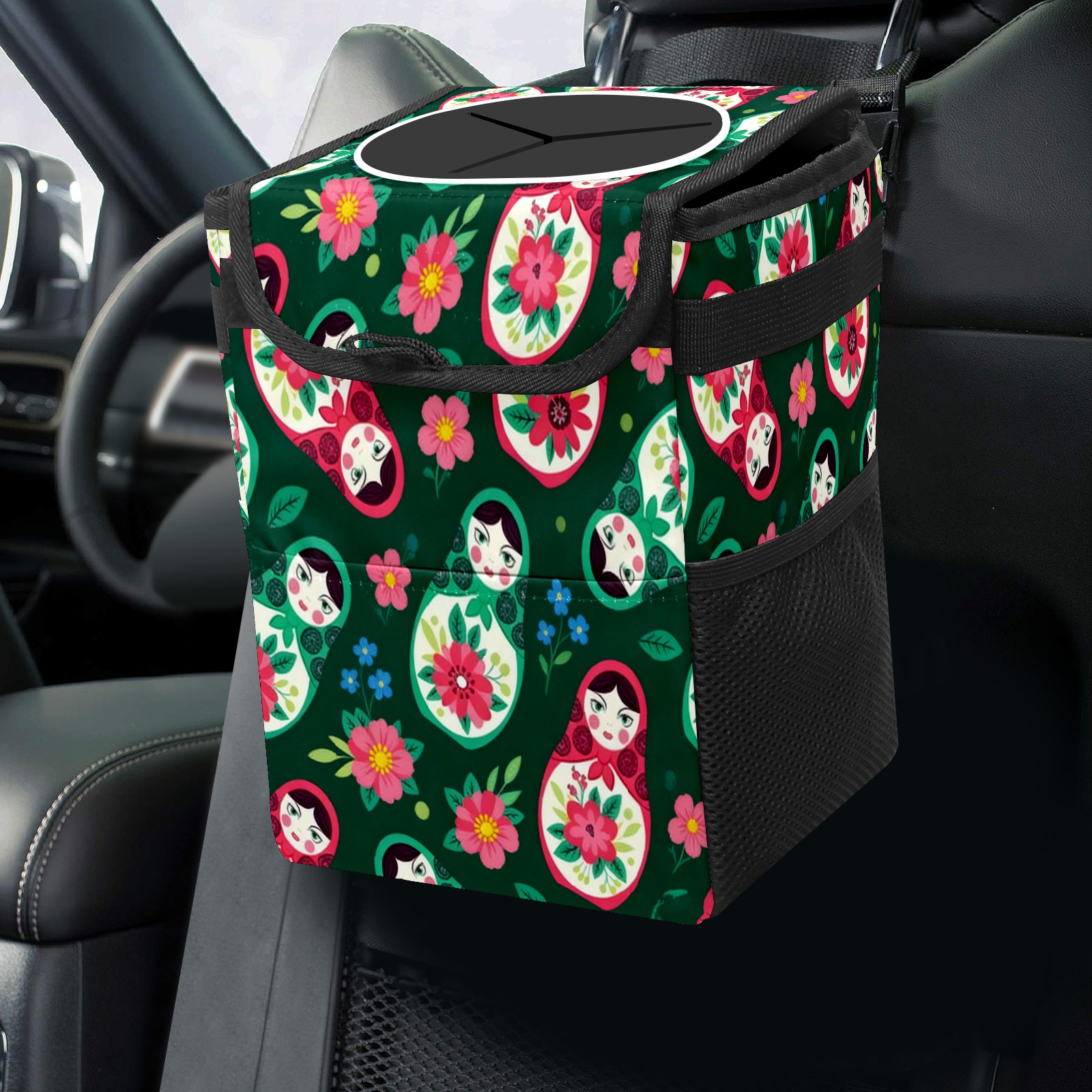 Small Collapsible Car Trash Can with Lid, Hanging Garbage Bin with Storage Pockets, Fresh Dolls Green for Front/Back Seat, Car Interior Organizer Accessory