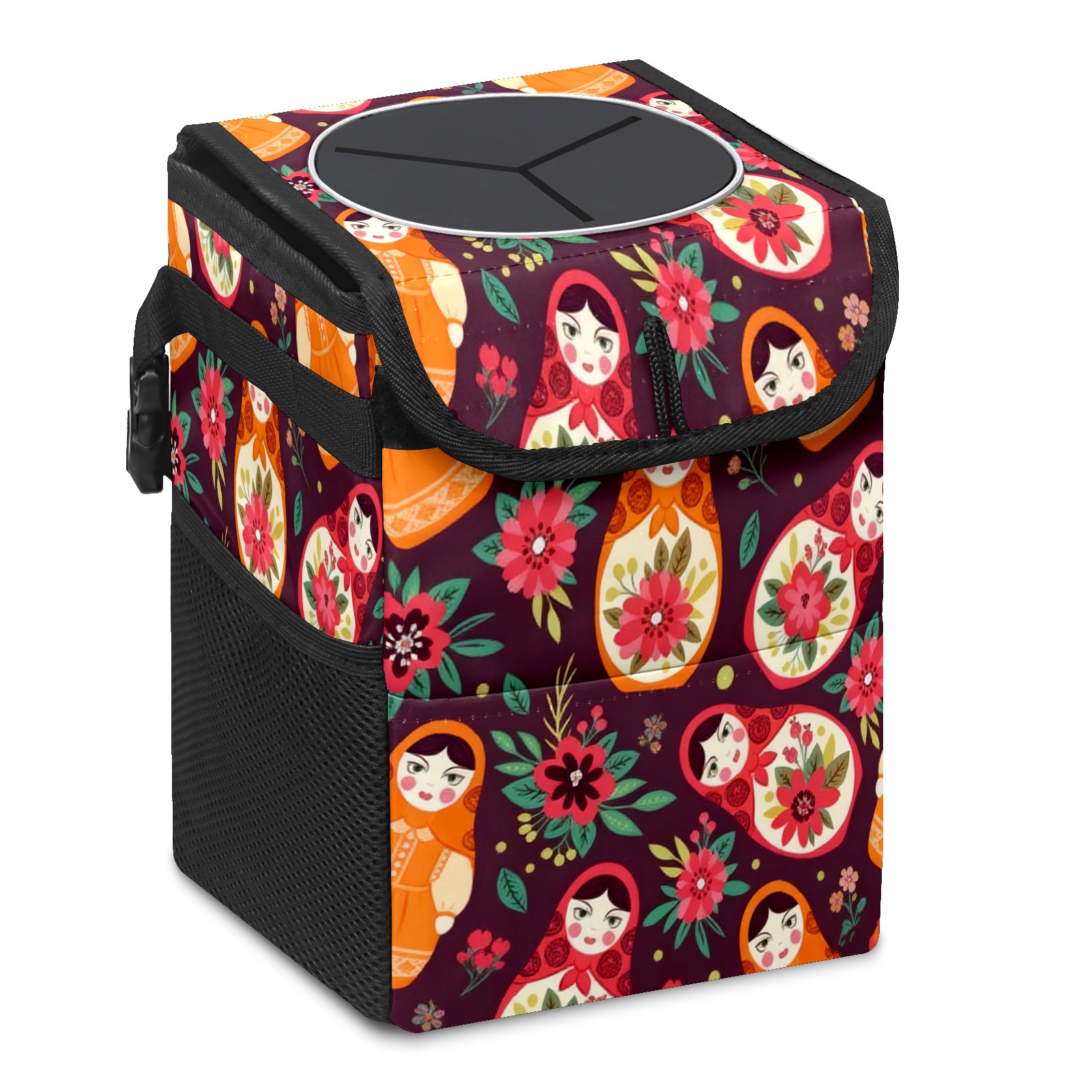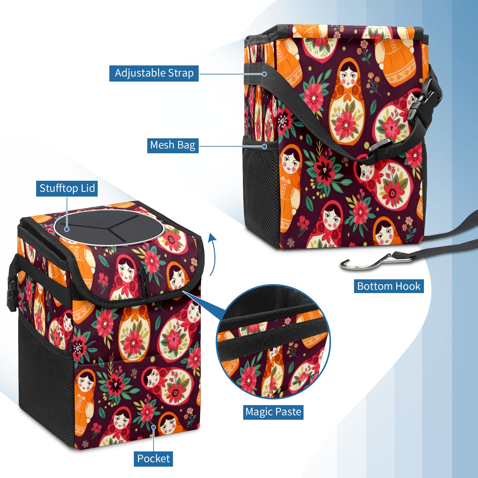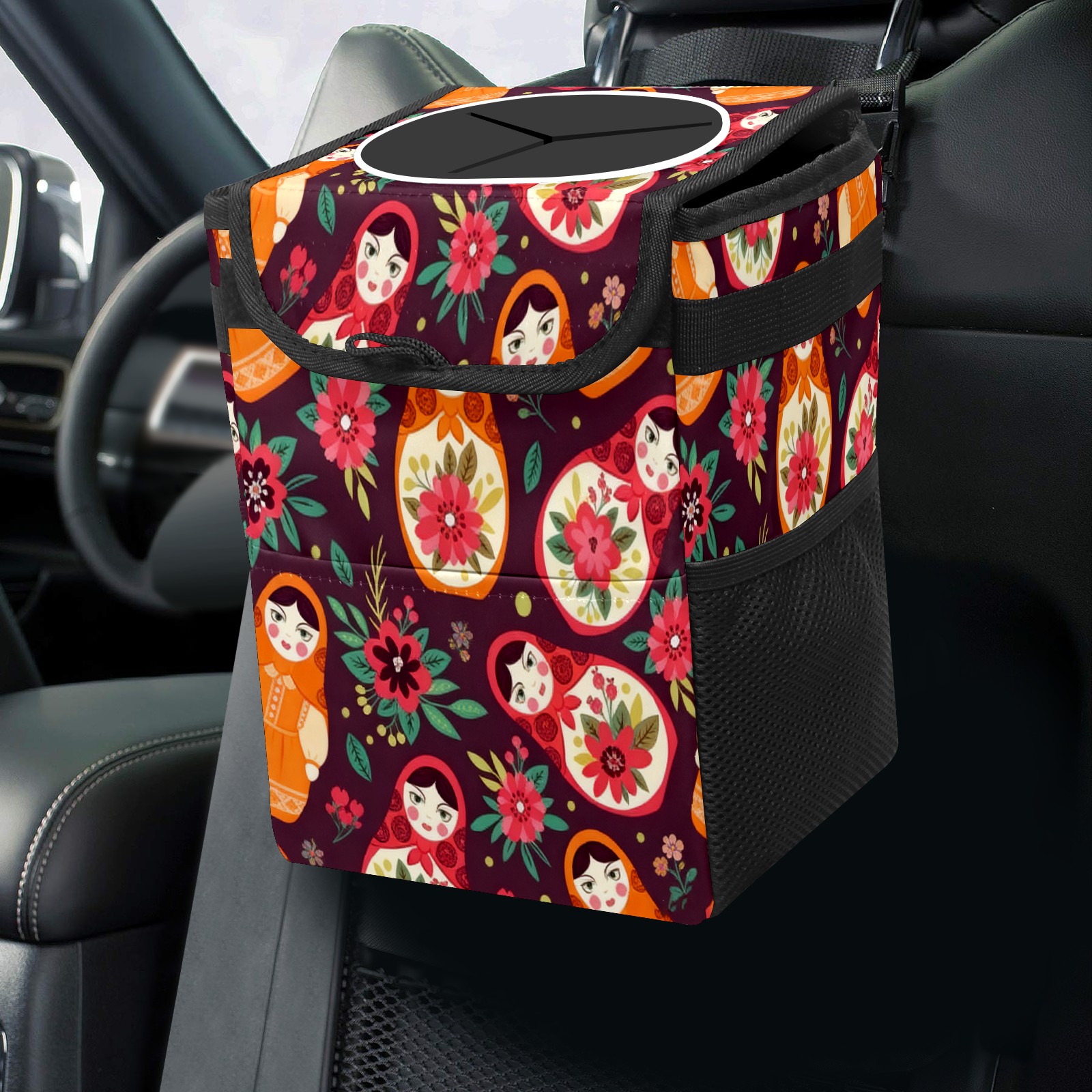 Small Collapsible Car Trash Can with Lid, Hanging Garbage Bin with Storage Pockets, Fiery Dolls Red for Front/Back Seat, Car Interior Organizer Accessory