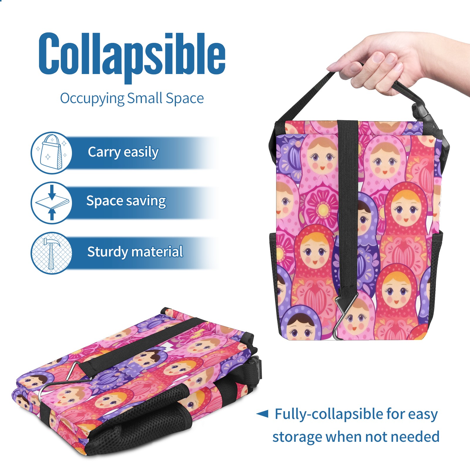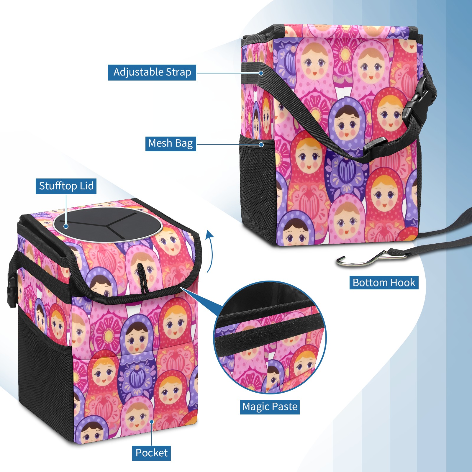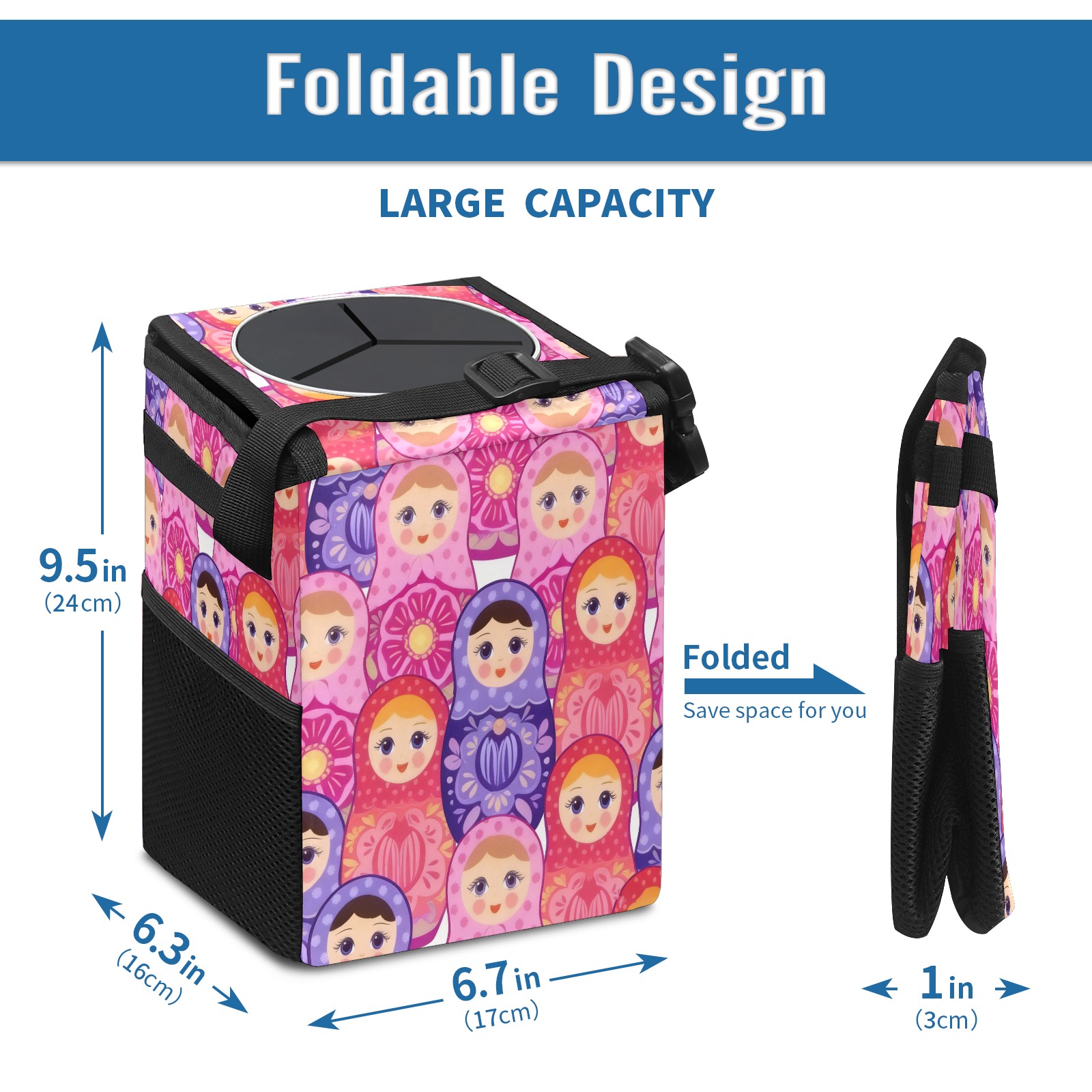 <p><strong> Keep Your Car Spotless!</strong></p><p>Our small, collapsible car trash can is the ultimate solution for a clutter-free ride. With a secure lid, multiple pockets, and stable hanging design, it's a must-have accessory.</p><p><strong>Key Features</strong></p><ul><li><strong>Odor Control:</strong> Rubber-sealed lid traps smells; works with standard trash bags.</li><li><strong>Extra Storage:</strong> Mesh pockets and front pouch keep essentials handy.</li><li><strong>Secure Fit:</strong> Strap and hooks ensure it stays in place on any surface.</li><li><strong>Space-Saving:</strong> Fold flat when not in use to maximize storage.</li><li><strong>Stylish &amp; Durable:</strong> Full-print twill fabric is built to last.</li></ul><p><strong>Specs</strong></p><p>Size: 24*17*16cm | Material: Twill Weave + Webbing | Care: Hand wash, avoid sun exposure.</p>