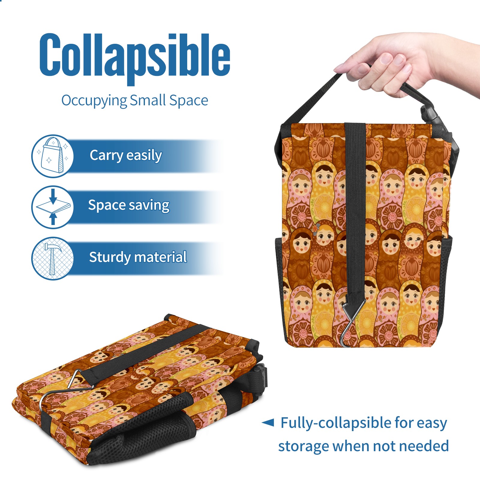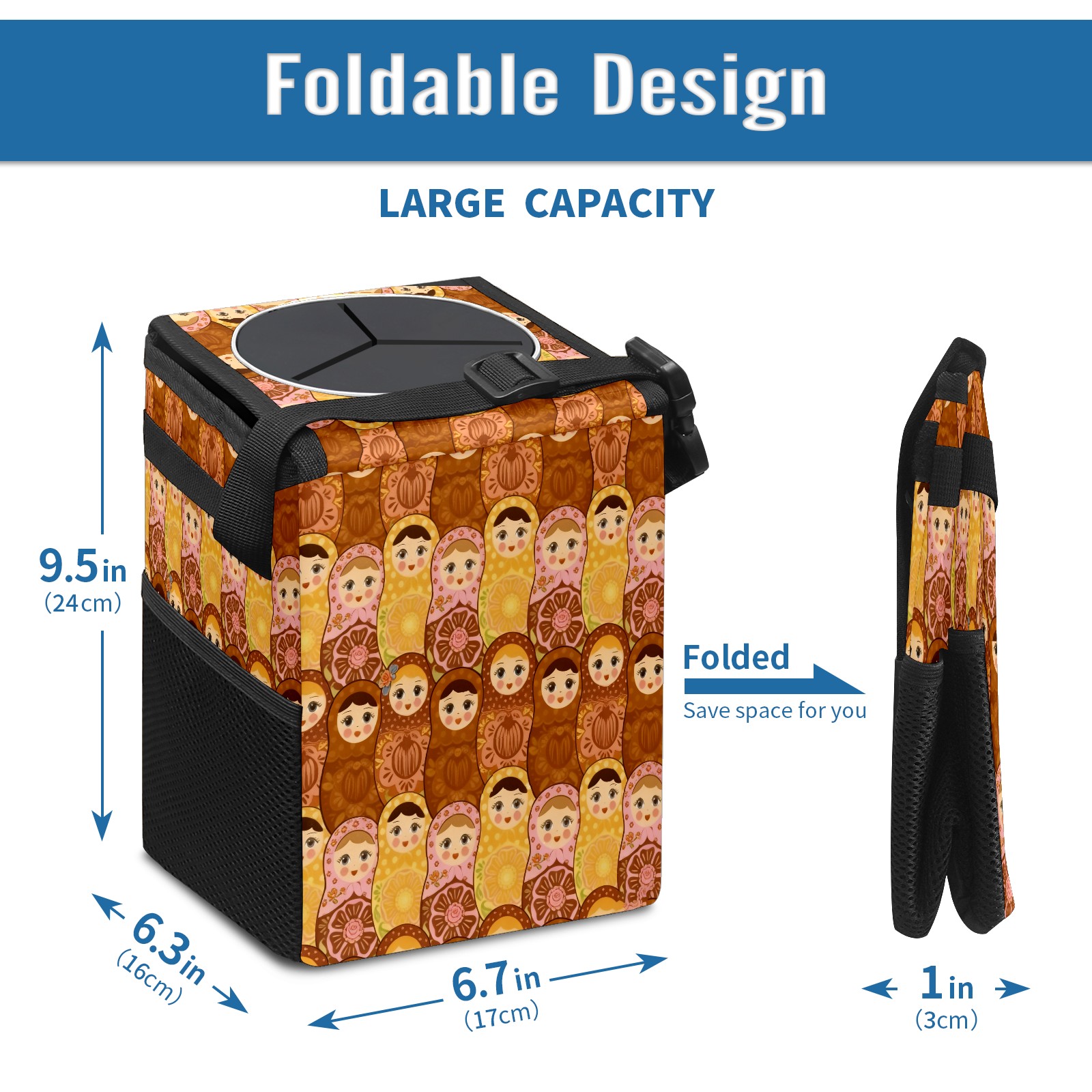 <p><strong> Keep Your Car Spotless!</strong></p><p>Our small, collapsible car trash can is the ultimate solution for a clutter-free ride. With a secure lid, multiple pockets, and stable hanging design, it's a must-have accessory.</p><p><strong>Key Features</strong></p><ul><li><strong>Odor Control:</strong> Rubber-sealed lid traps smells; works with standard trash bags.</li><li><strong>Extra Storage:</strong> Mesh pockets and front pouch keep essentials handy.</li><li><strong>Secure Fit:</strong> Strap and hooks ensure it stays in place on any surface.</li><li><strong>Space-Saving:</strong> Fold flat when not in use to maximize storage.</li><li><strong>Stylish &amp; Durable:</strong> Full-print twill fabric is built to last.</li></ul><p><strong>Specs</strong></p><p>Size: 24*17*16cm | Material: Twill Weave + Webbing | Care: Hand wash, avoid sun exposure.</p>