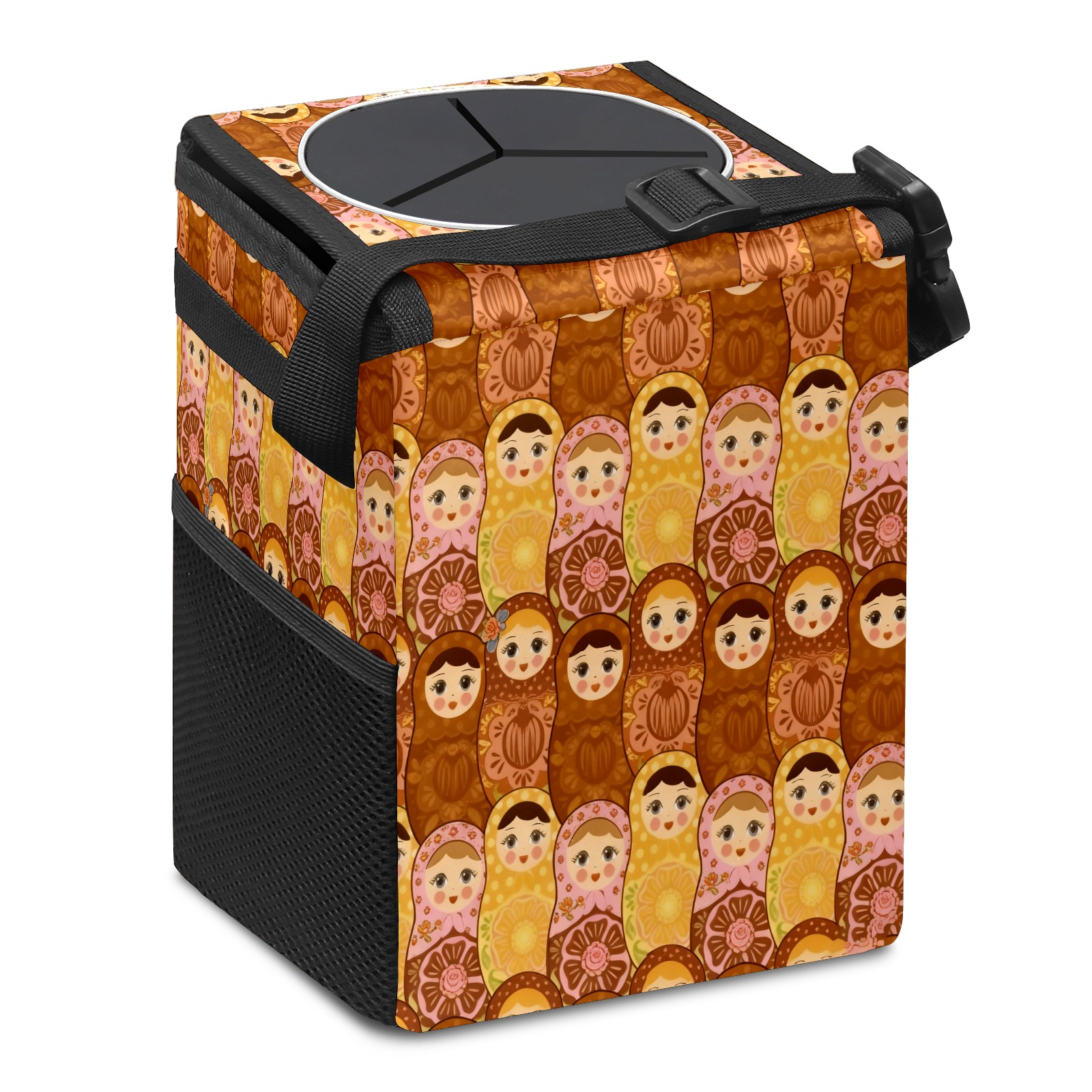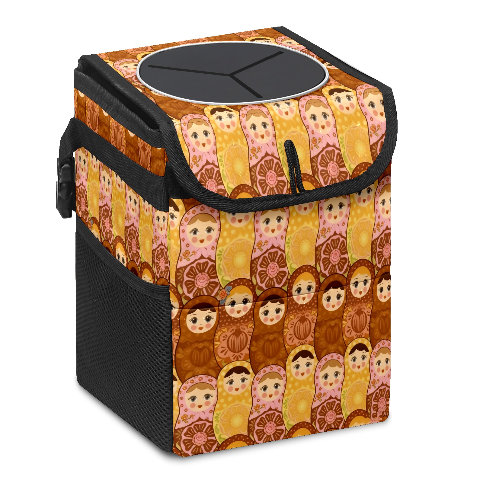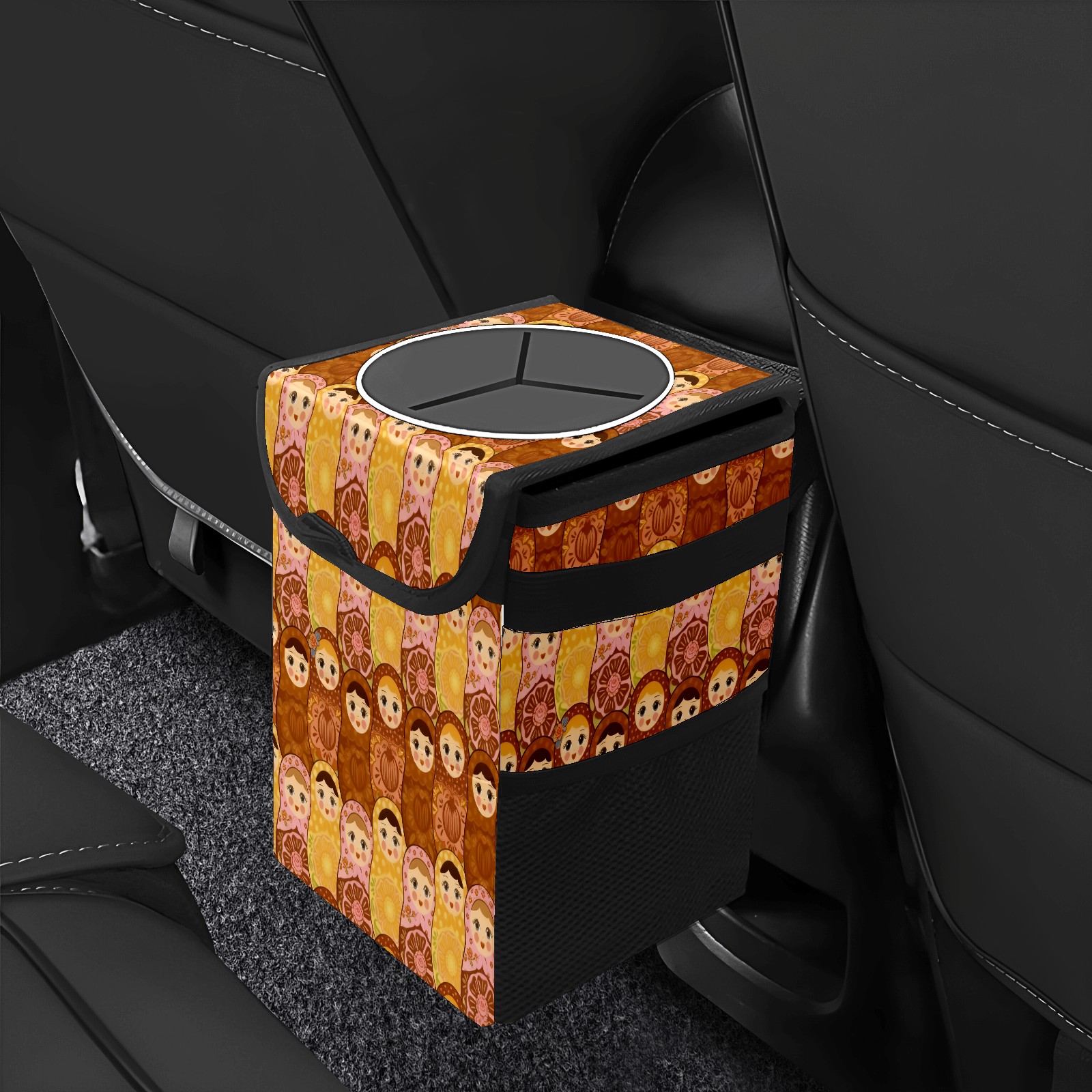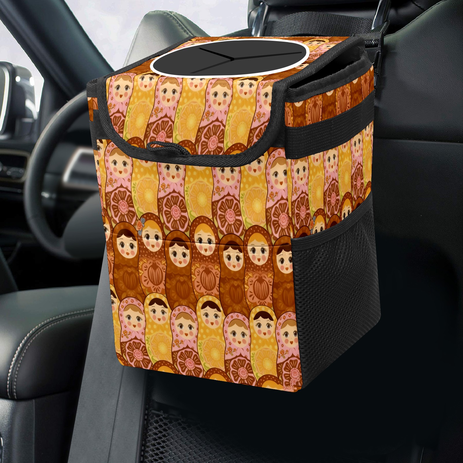 Small Collapsible Car Trash Can with Lid, Hanging Garbage Bin with Storage Pockets, Vintage Dolls Brown for Front/Back Seat, Car Interior Organizer Accessory