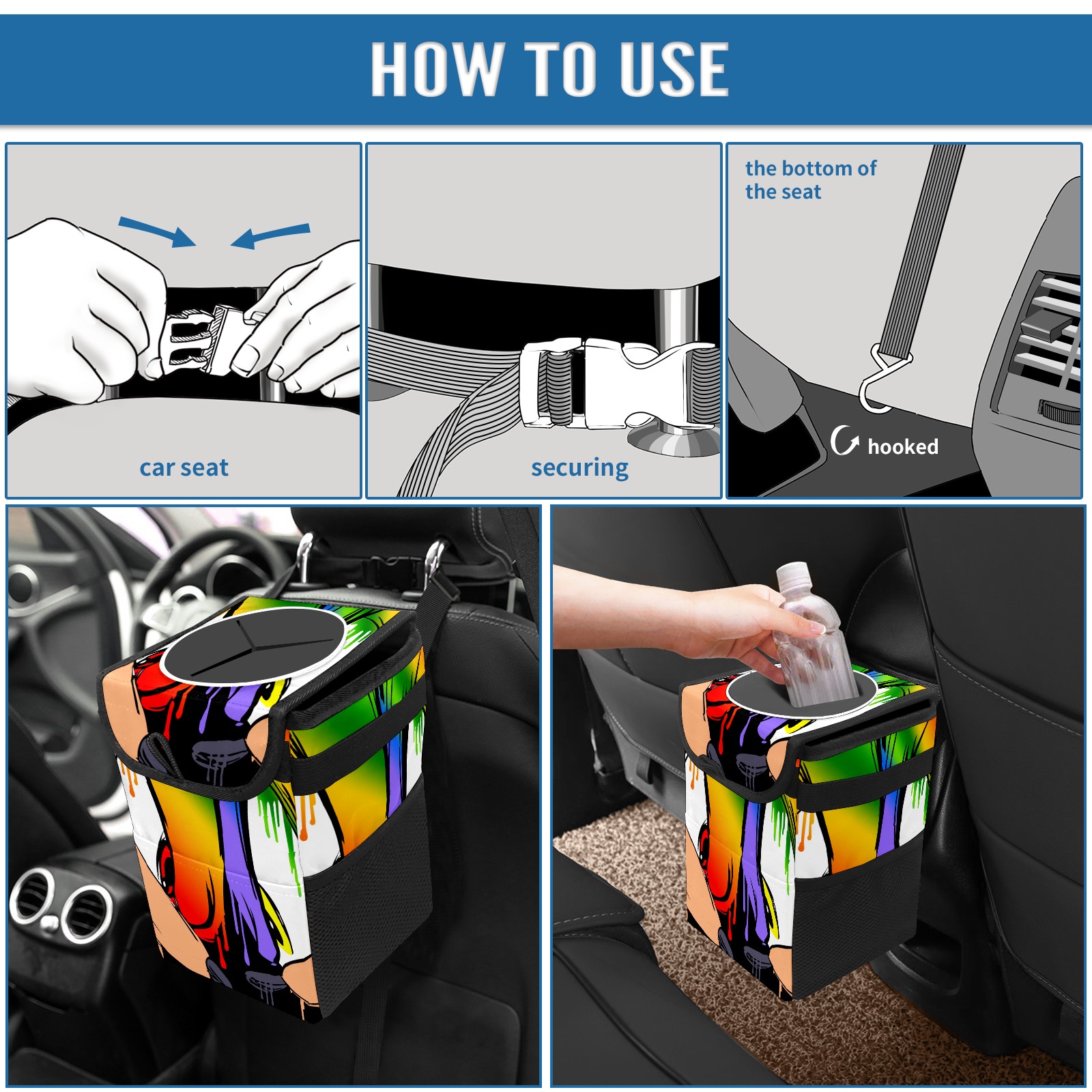 • <p>Keep your car neat with this practical car trash can—built for durability, versatility, and on-the-go convenience! Crafted from quality twill fabric with a waterproof lining, it prevents leaks, keeping seats/floors clean. Clean easily: empty directly or secure a disposable bag with side clips. Adjustable pull cord fits floor, seat, or headrest. 9.5x6.3x6.7 inches, ample space for daily trash, folds flat for storage. More than a trash can, it doubles as a storage bag for cups, toys, docs, and small gadgets—must-have car interior accessory. Installs in seconds on seats, console, or gear shift; adjustable straps keep it stable, no slipping on bumpy roads. Perfect gift for new car owners!</p>