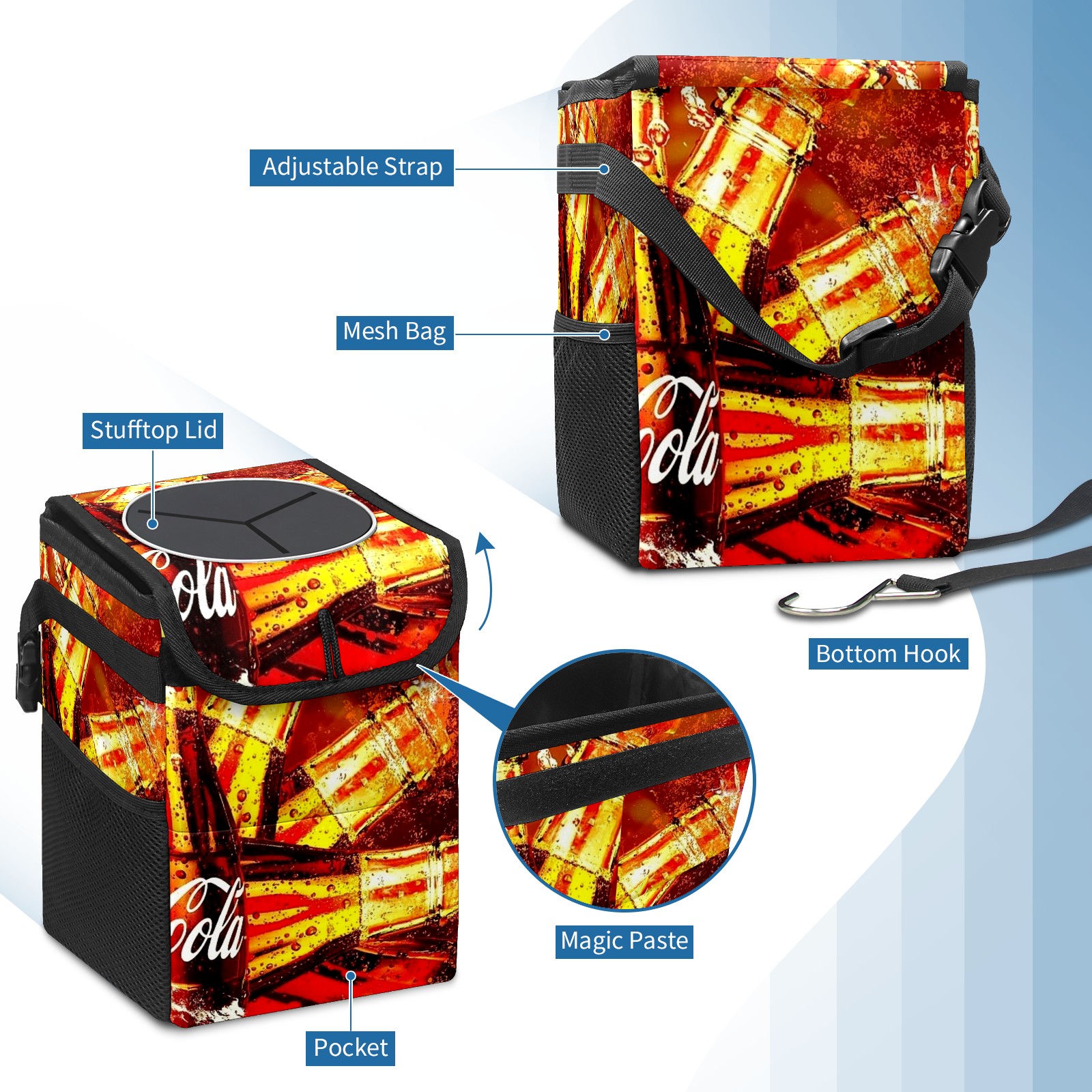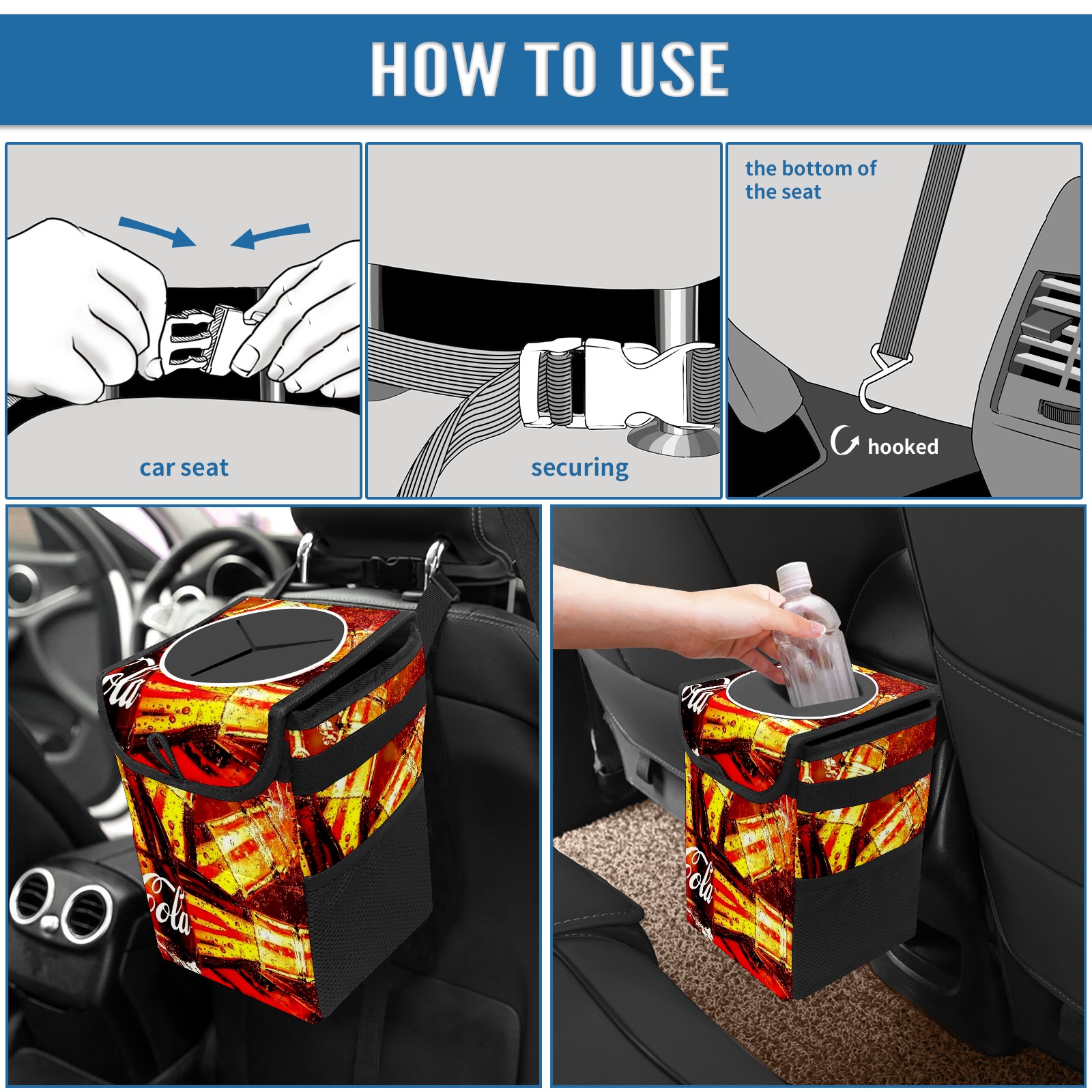 • <p>Keep your car neat with this practical car trash can—built for durability, versatility, and on-the-go convenience! Crafted from quality twill fabric with a waterproof lining, it prevents leaks, keeping seats/floors clean. Clean easily: empty directly or secure a disposable bag with side clips. Adjustable pull cord fits floor, seat, or headrest. 9.5x6.3x6.7 inches, ample space for daily trash, folds flat for storage. More than a trash can, it doubles as a storage bag for cups, toys, docs, and small gadgets—must-have car interior accessory. Installs in seconds on seats, console, or gear shift; adjustable straps keep it stable, no slipping on bumpy roads. Perfect gift for new car owners!</p>