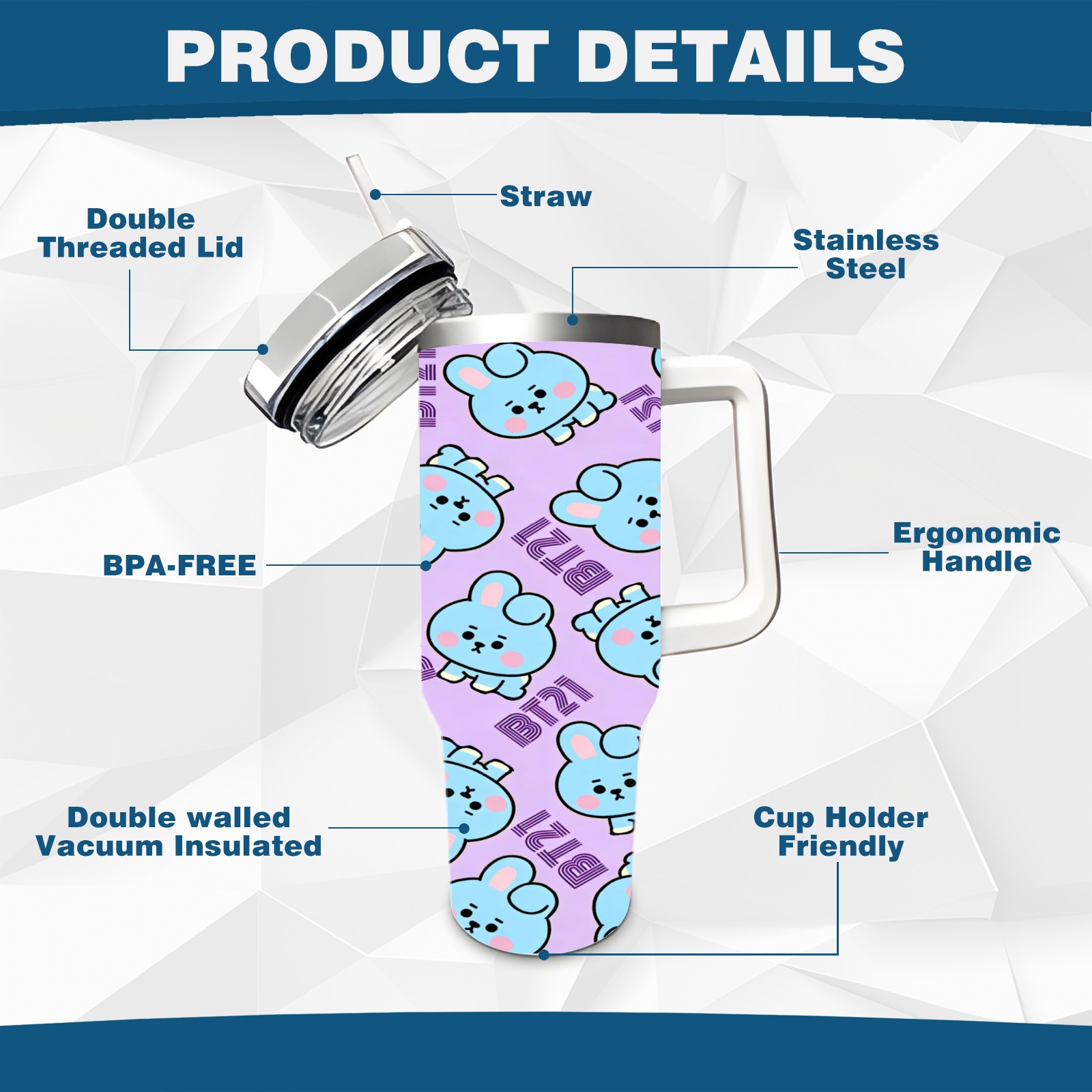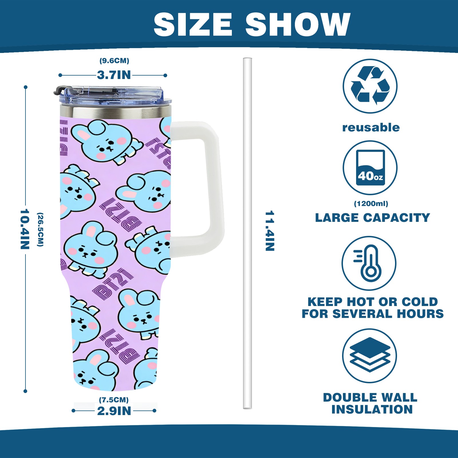 • С большой емкостью 40 унций, он обеспечивает вас гидратацией в течение всего дня, идеально подходит для воды, кофе, сока или других напитков. Эргономичный дизайн идеально вписывается в автомобильные держатели для бутылок, а прочный, герметичный колпачок предотвращает утечки во время передвижения. Путешествие. Антискользящее основание обеспечивает устойчивость, а гладкие поверхности делают уборку легкой — просто мойте вручную или кладите в посудомоечную машину (рекомендуется верхний поддон).