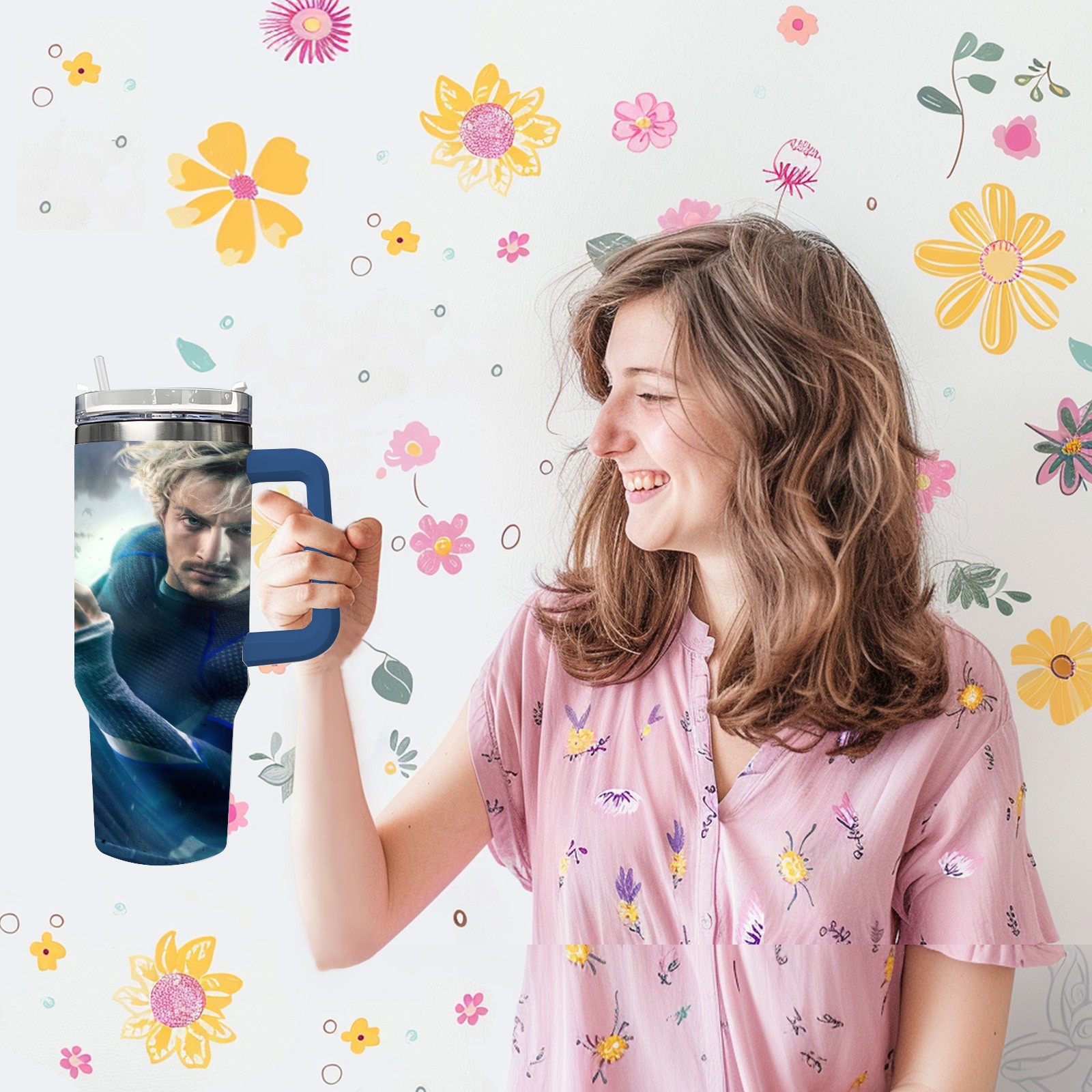 40oz 漫威 (1138) thermos with lid and straw, leak-proof stainless steel, with handle, spill-proof bottle, convenient for travel(pink)