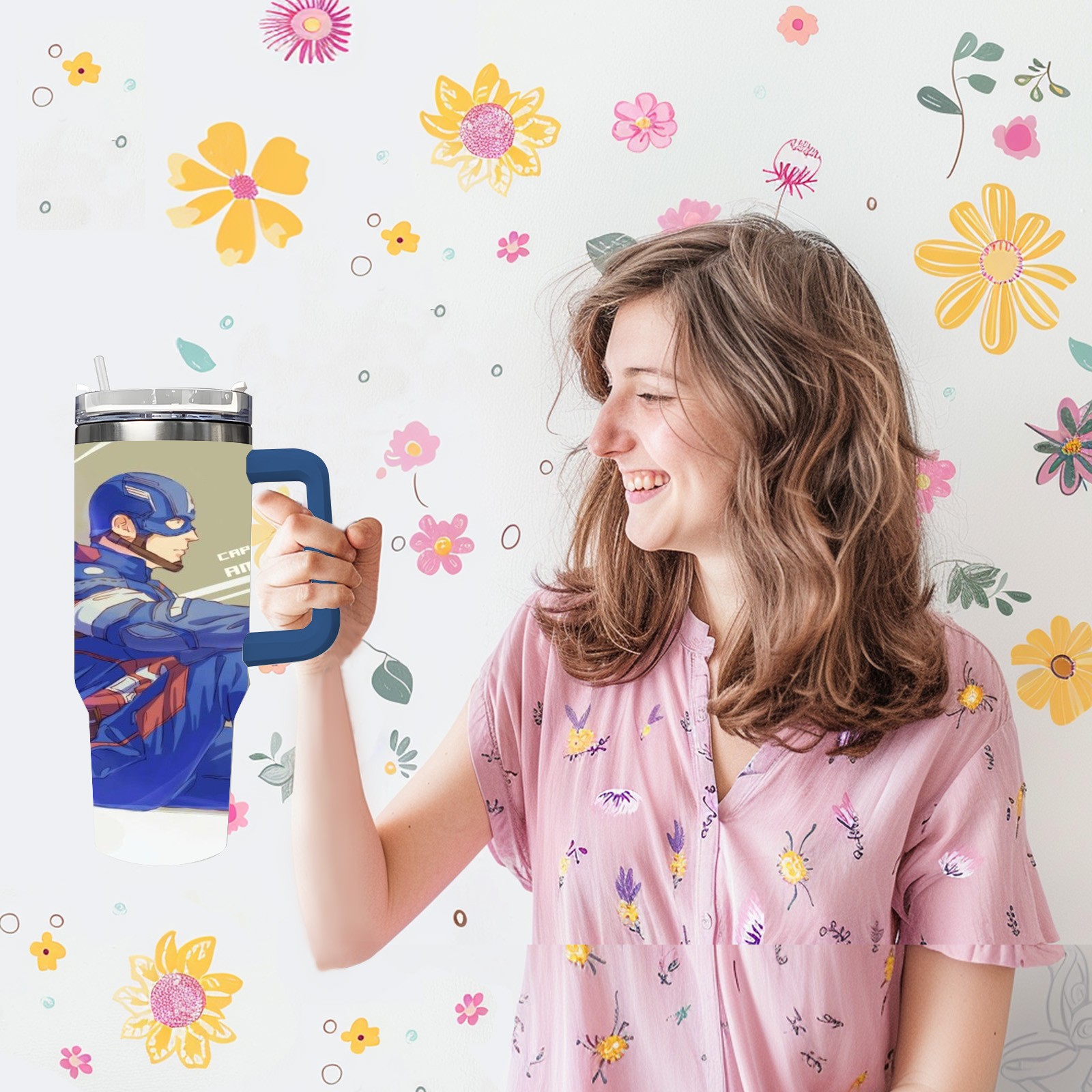 40oz 漫威 (1073) thermos with lid and straw, leak-proof stainless steel, with handle, spill-proof bottle, convenient for travel(pink)