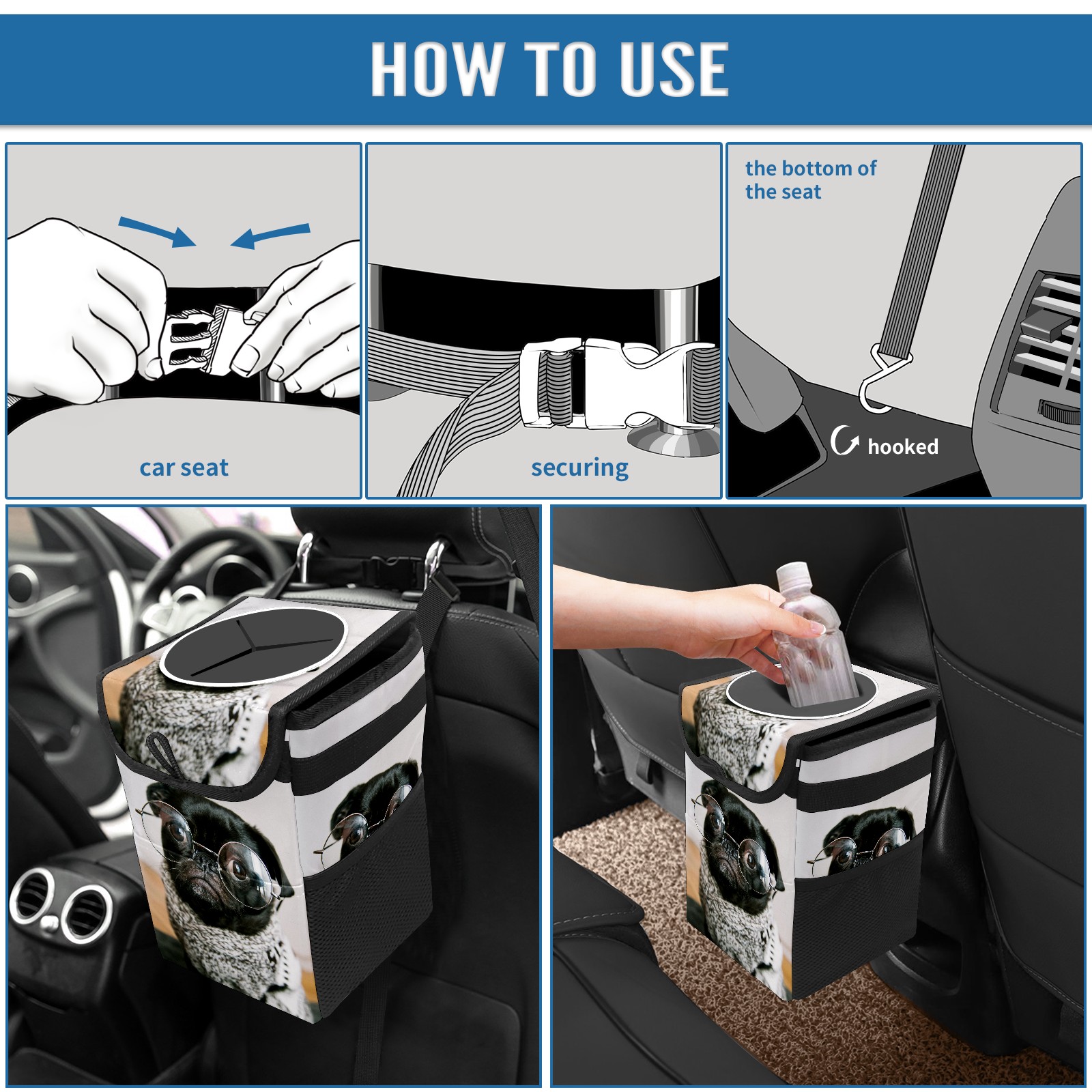 • <p>Keep your car neat with this practical car trash can—built for durability, versatility, and on-the-go convenience! Crafted from quality twill fabric with a waterproof lining, it prevents leaks, keeping seats/floors clean. Clean easily: empty directly or secure a disposable bag with side clips. Adjustable pull cord fits floor, seat, or headrest. 9.5x6.3x6.7 inches, ample space for daily trash, folds flat for storage. More than a trash can, it doubles as a storage bag for cups, toys, docs, and small gadgets—must-have car interior accessory. Installs in seconds on seats, console, or gear shift; adjustable straps keep it stable, no slipping on bumpy roads. Perfect gift for new car owners!</p>