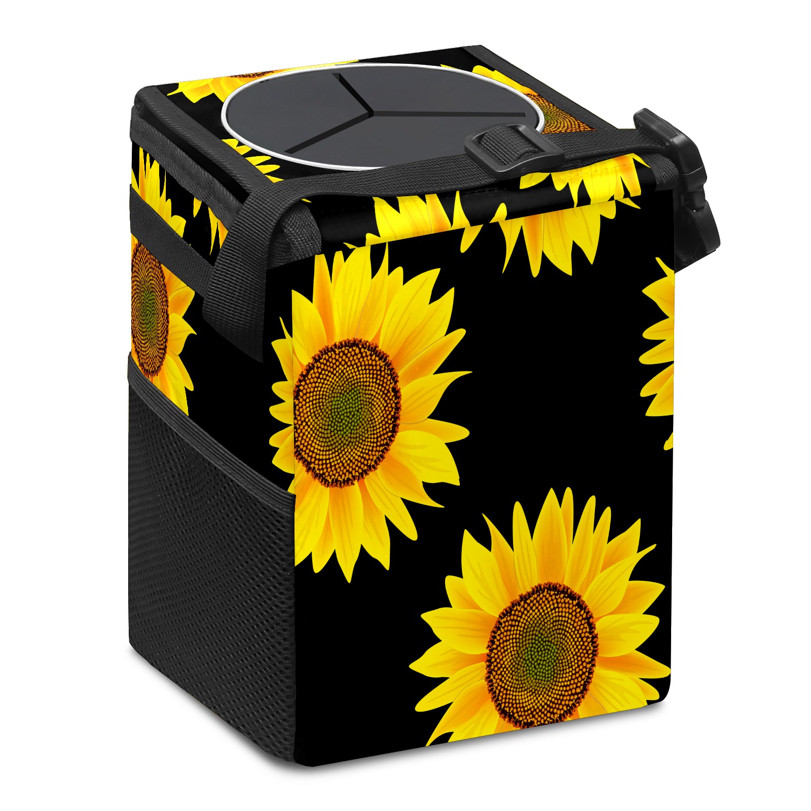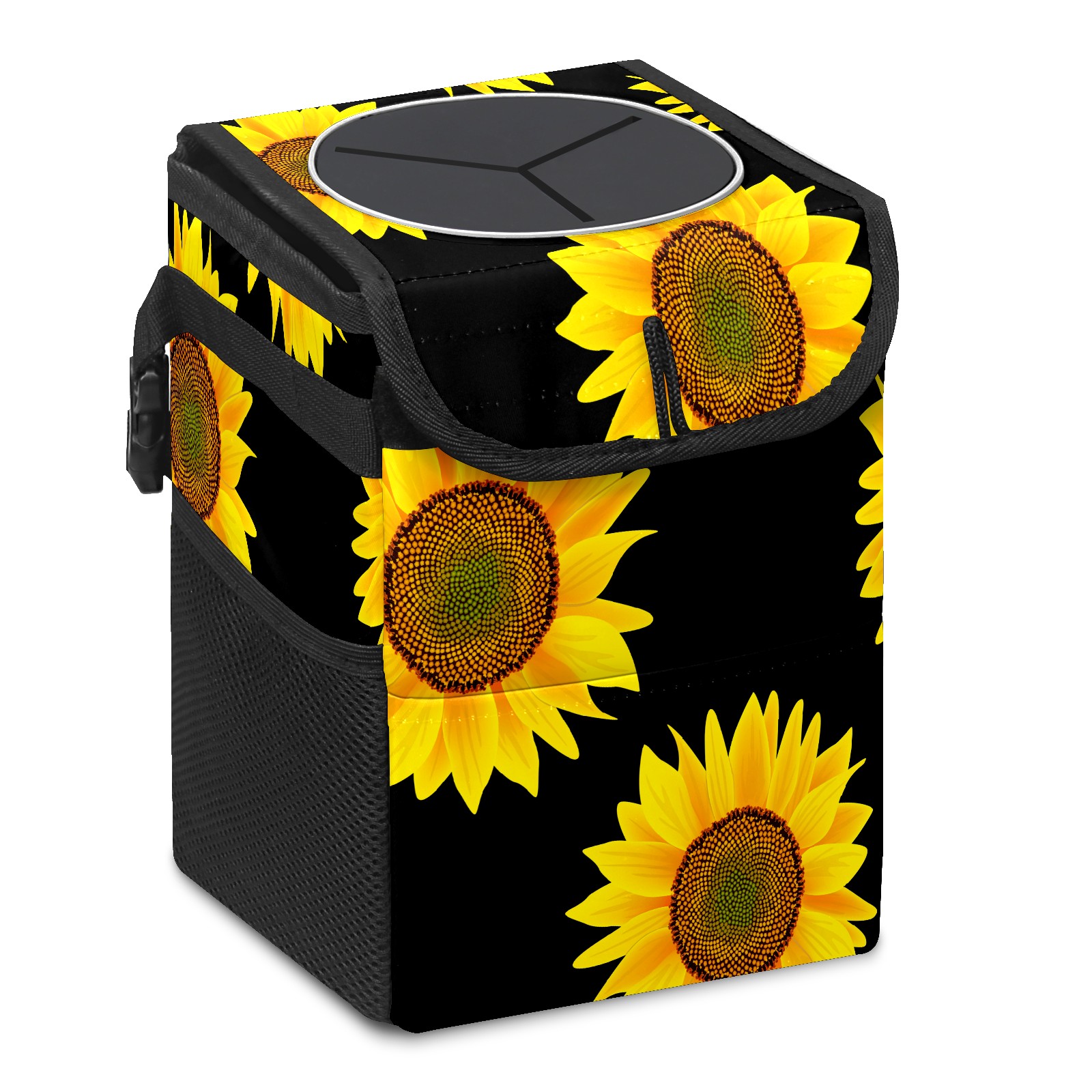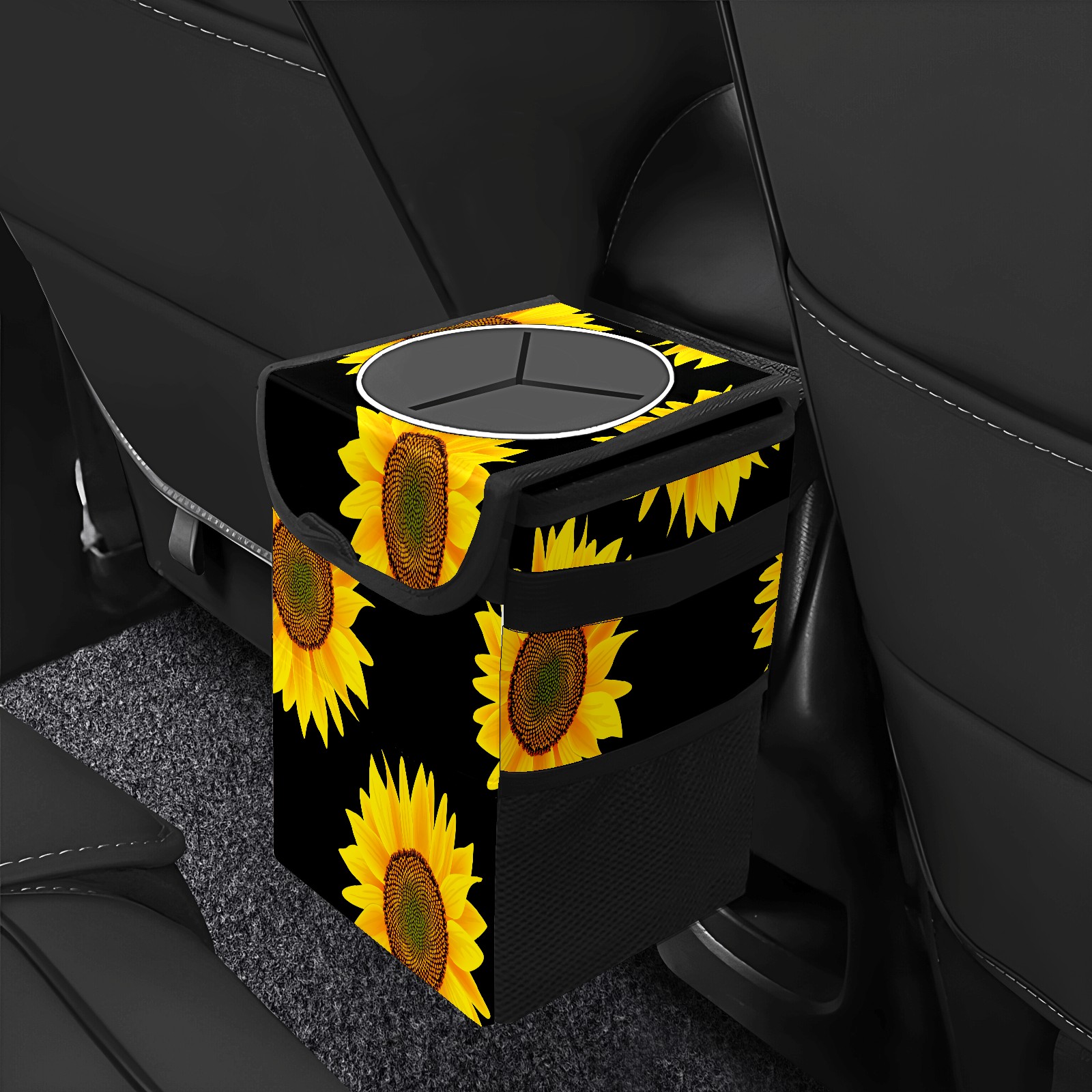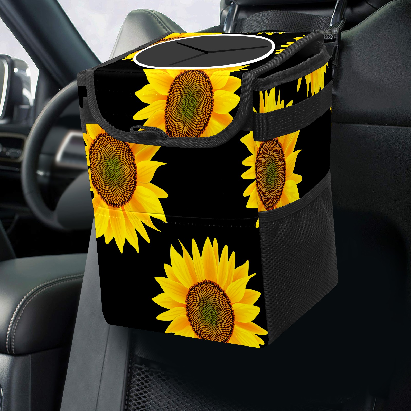 Car Garbage Can — Multi-functional, Lightweight Portable, Reusable Vehicle Trash Can, Waterproof with Sufficient Storage Capacity Yellow Sunflower Black Background