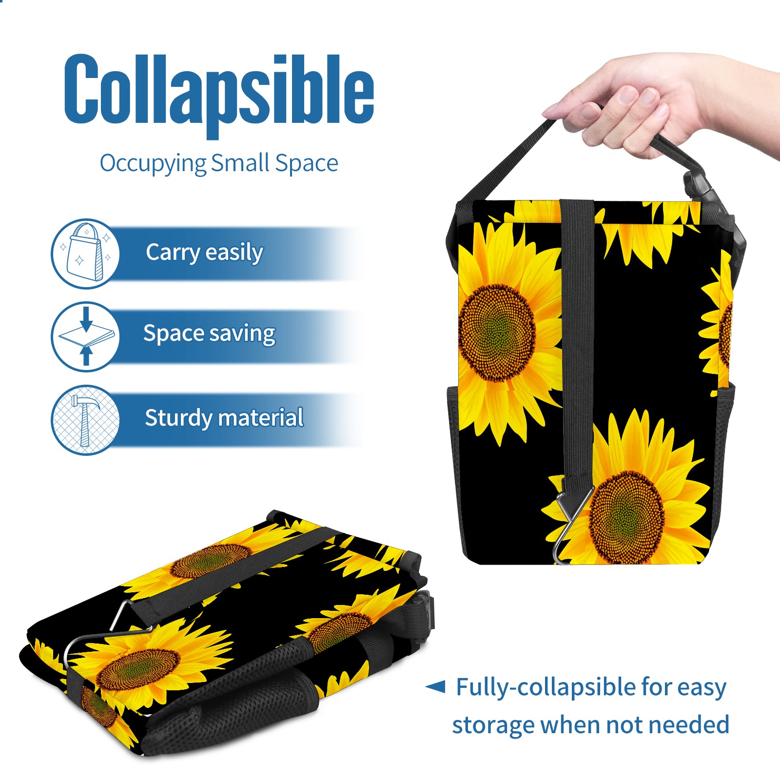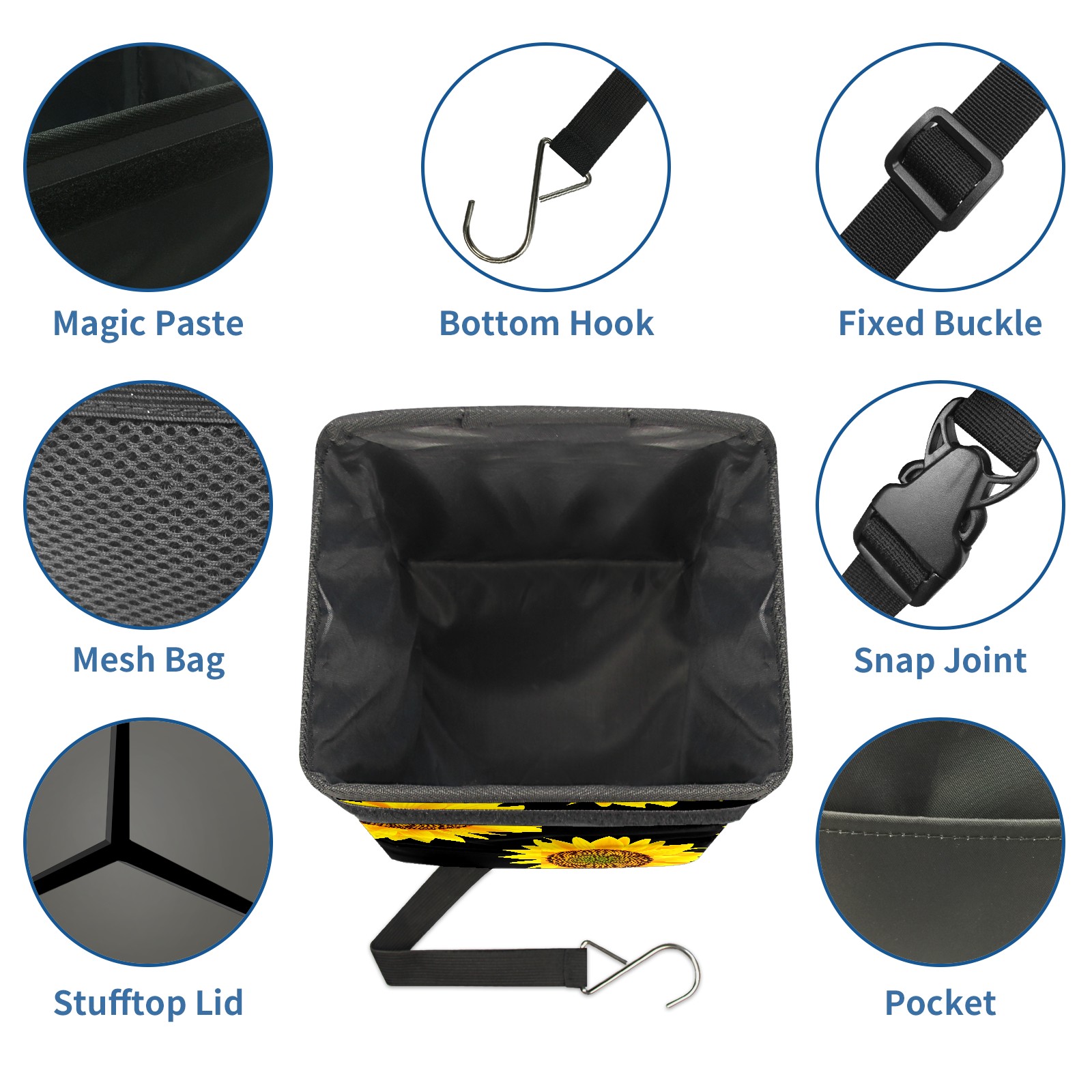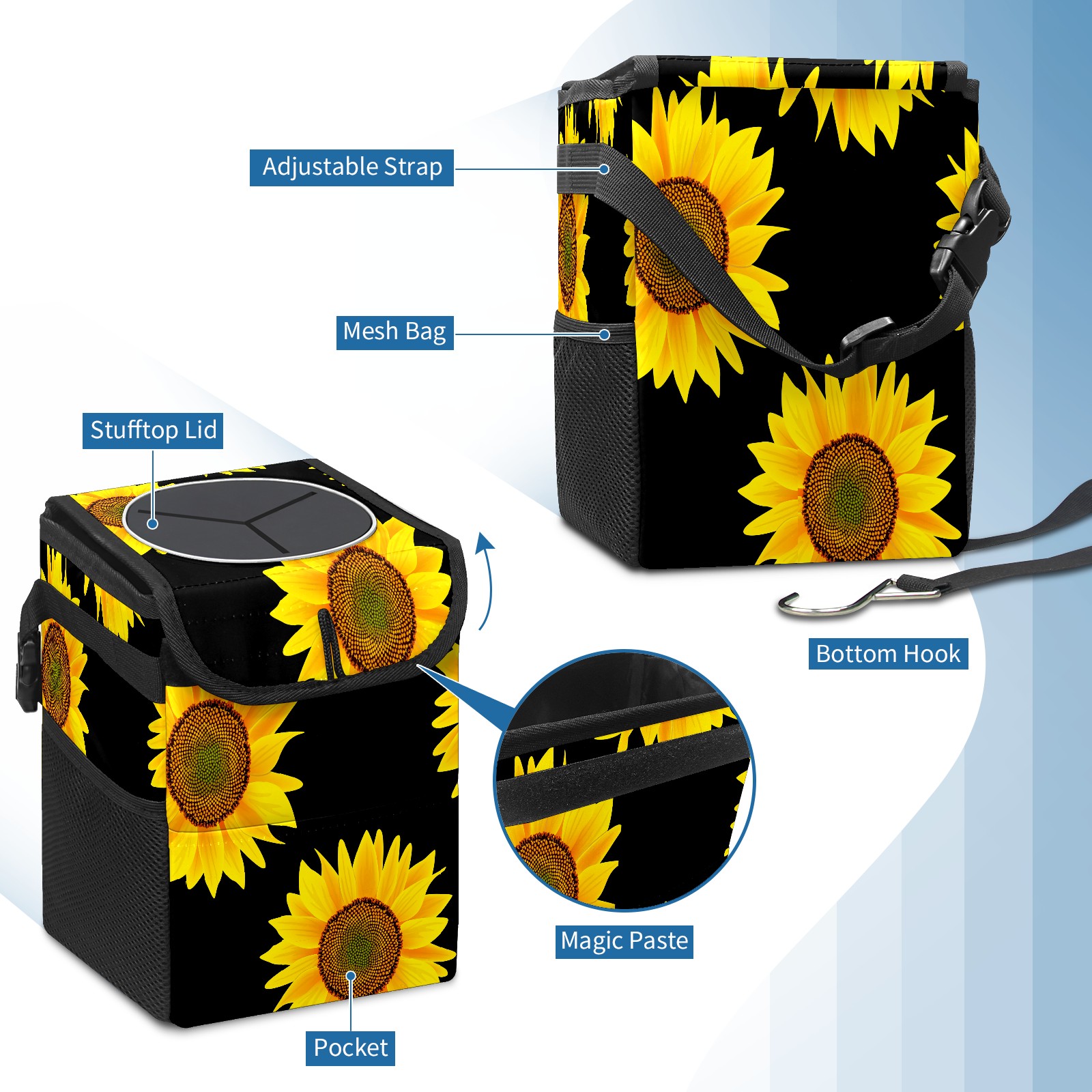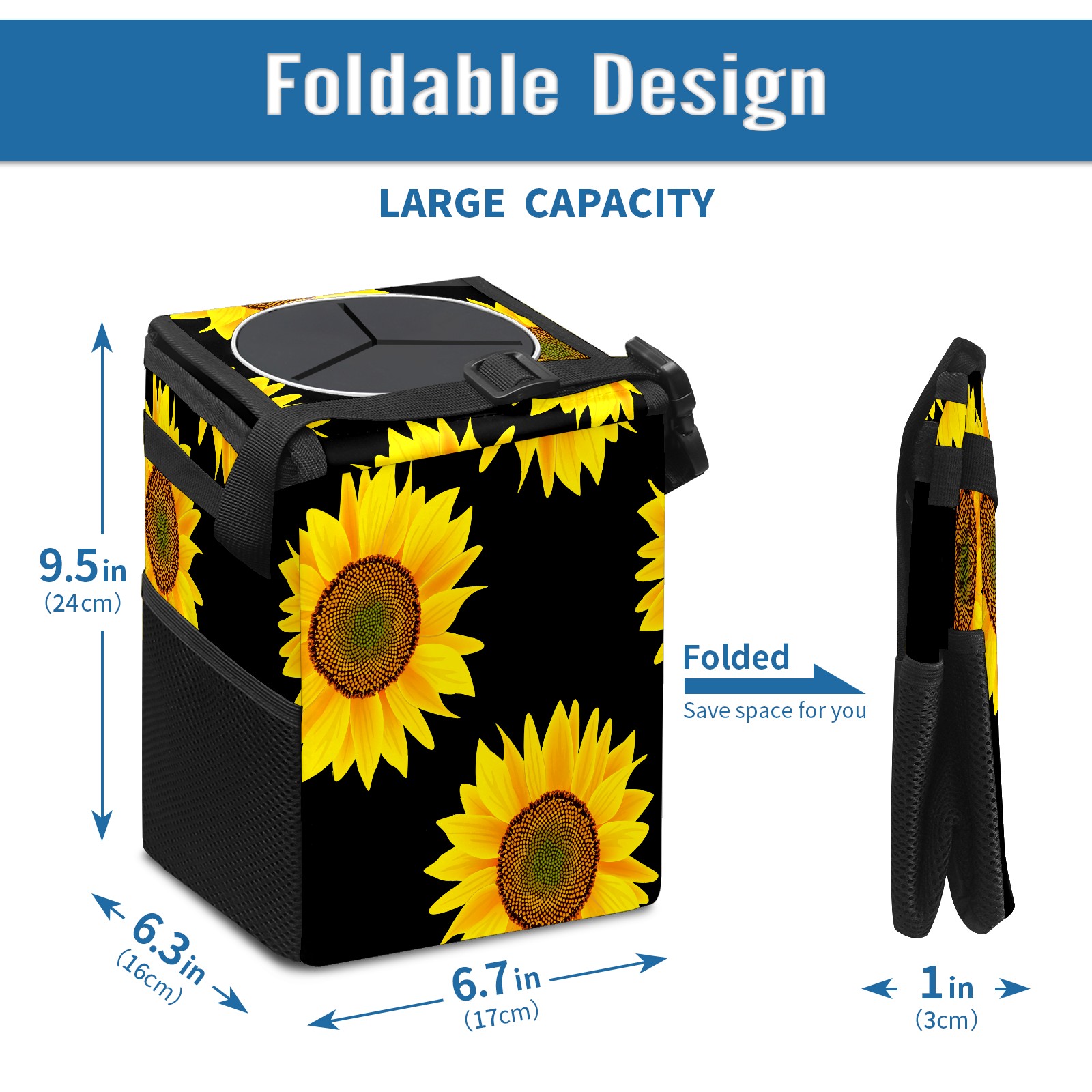 Car Garbage Can — Multi-functional, Lightweight Portable, Reusable Vehicle Trash Can, Waterproof with Sufficient Storage Capacity Yellow Sunflower Black Background