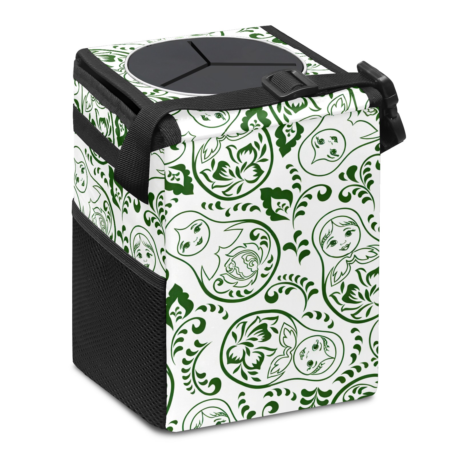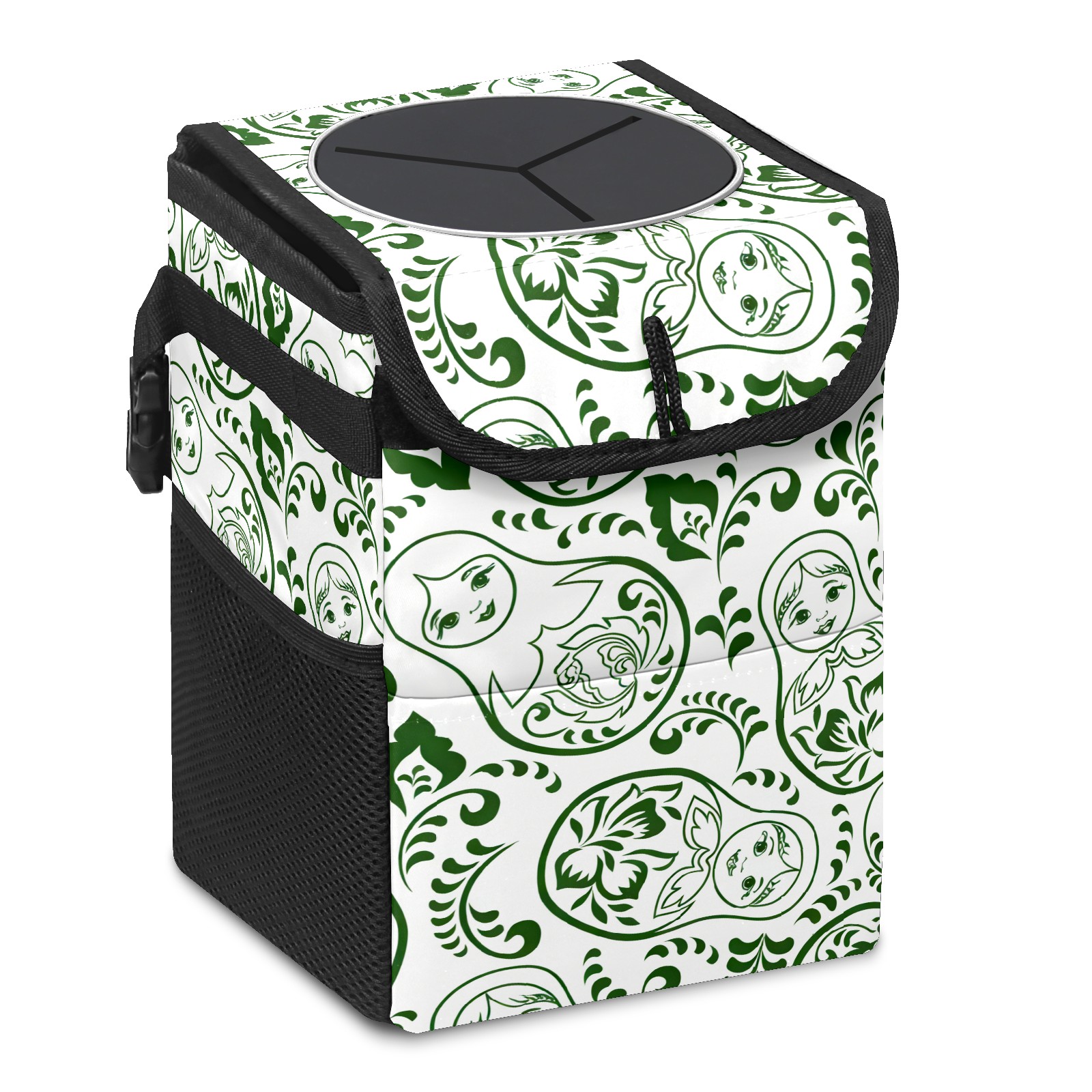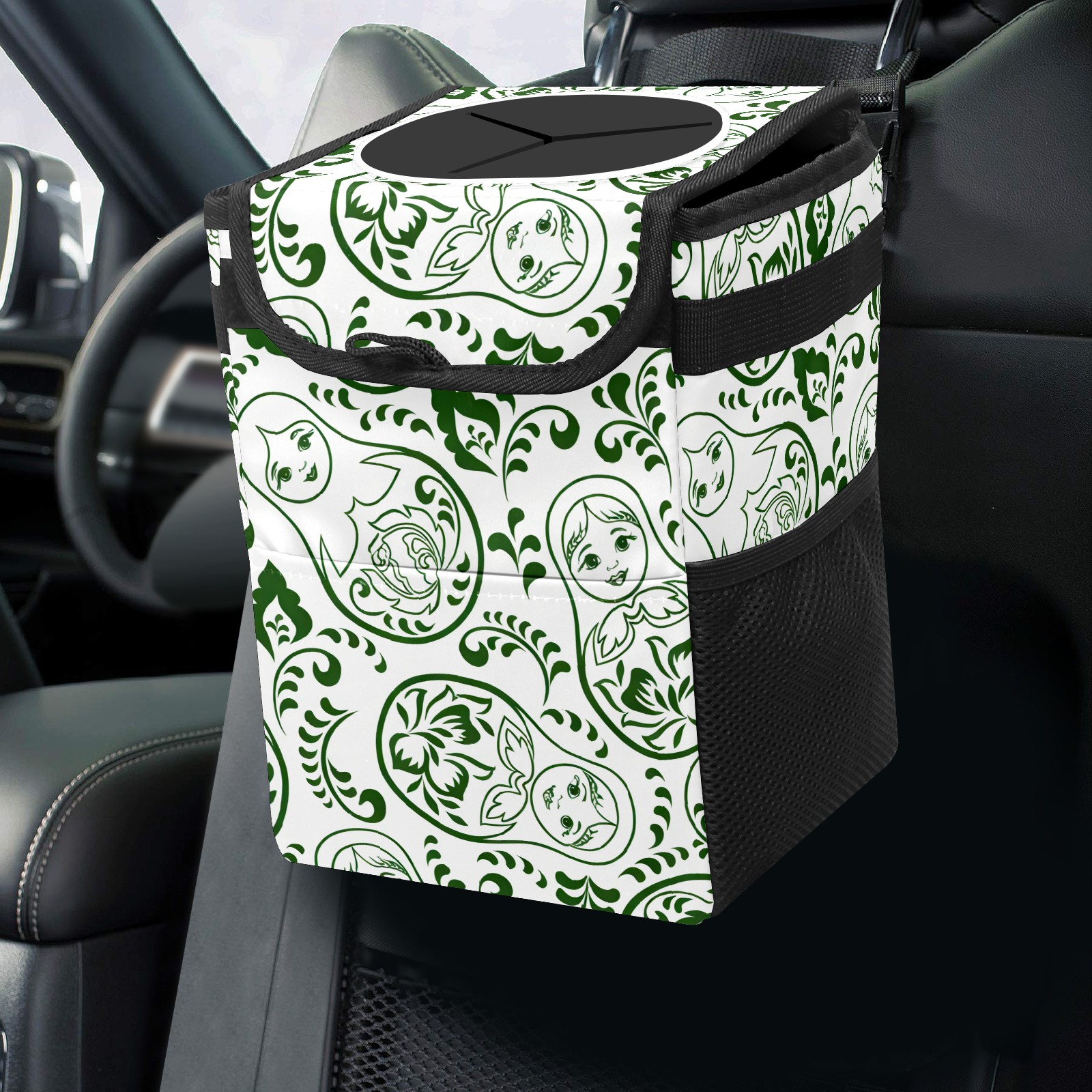 Car Trash Can with Lid, Small Portable Hanging Automotive Garbage Bin for Vehicles, Leakproof Waste Bag Container for SUV Truck Van Interior Auto Travel Road Trips(Fresh Patterns Green)