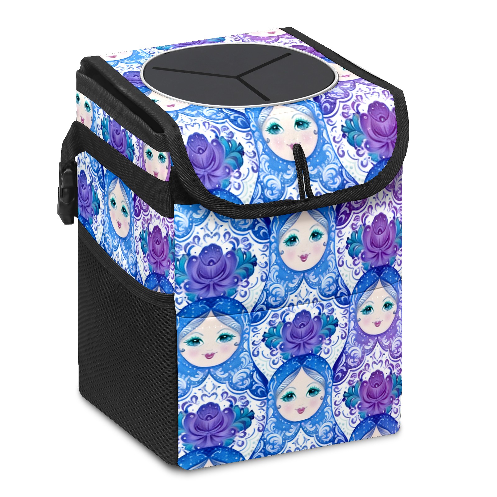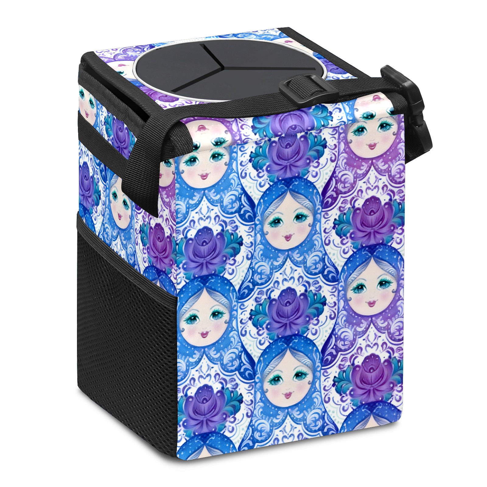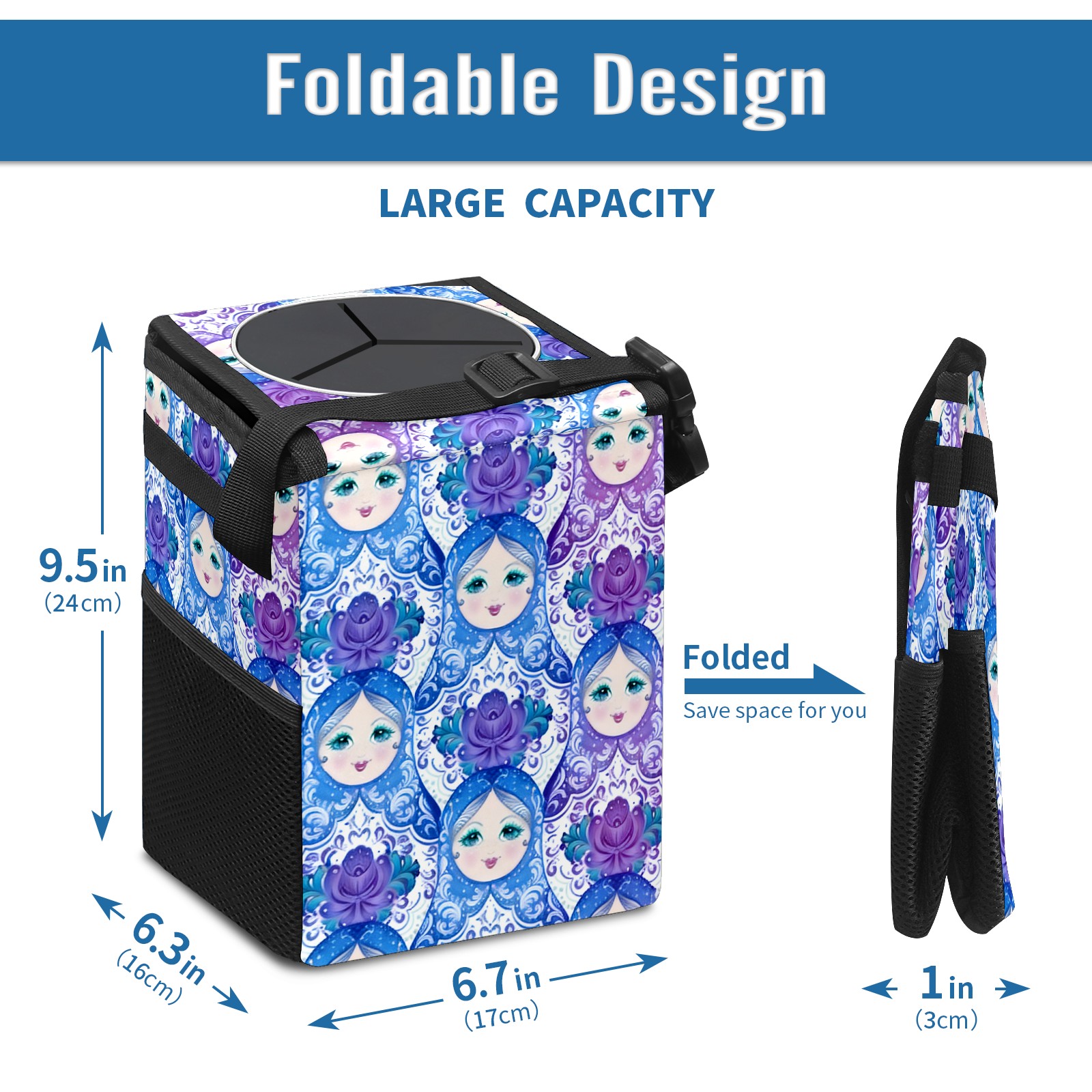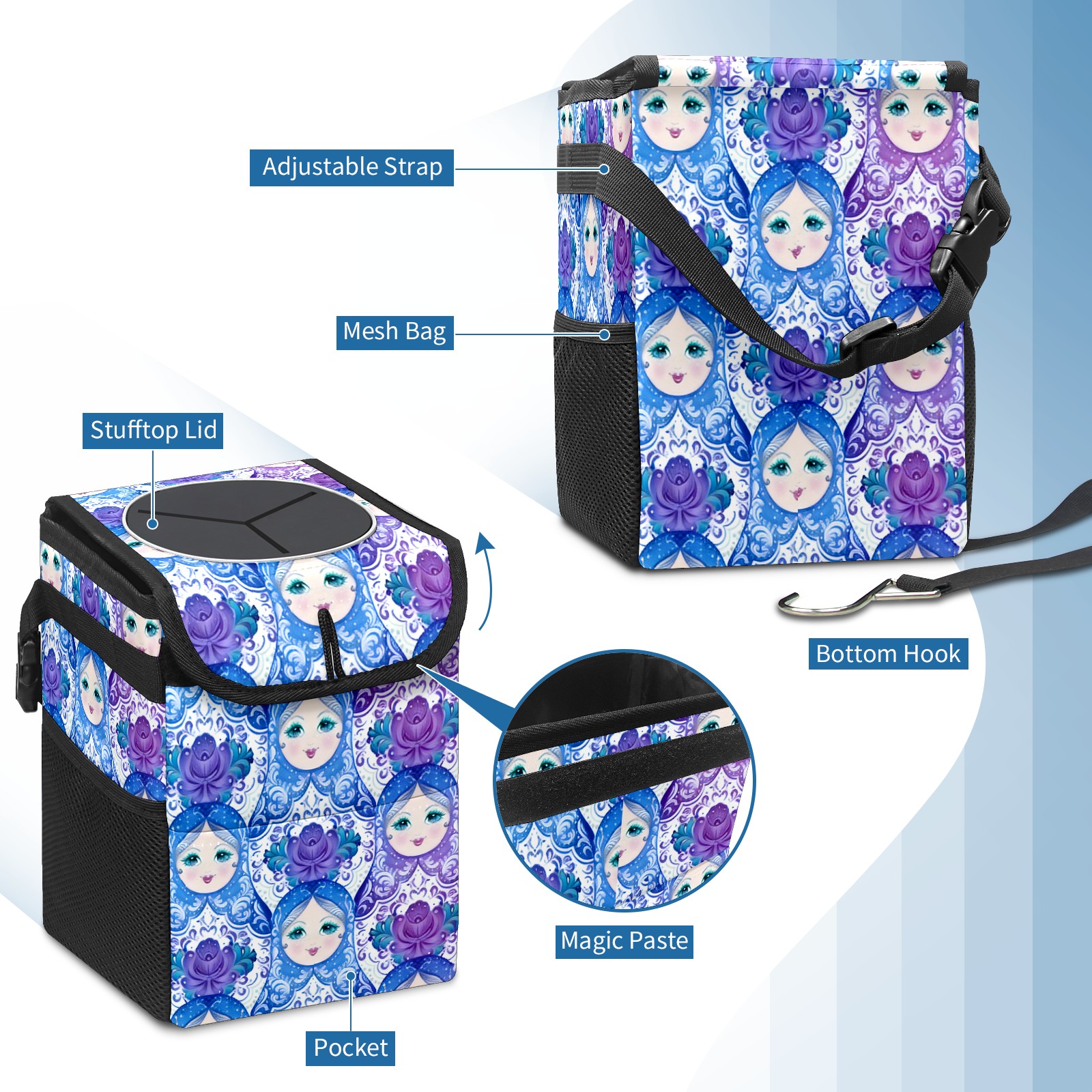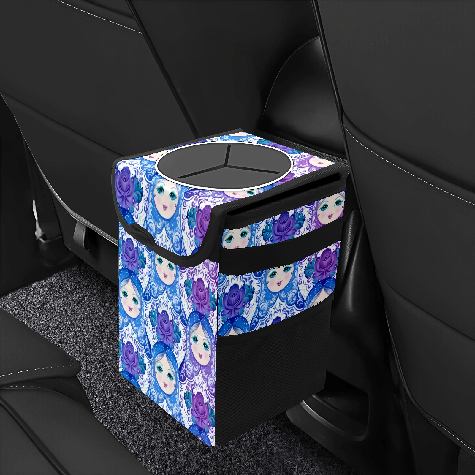 Car Trash Can with Lid, Small Portable Hanging Automotive Garbage Bin for Vehicles, Leakproof Waste Bag Container for SUV Truck Van Interior Auto Travel Road Trips(Dreamy Dolls Blue)