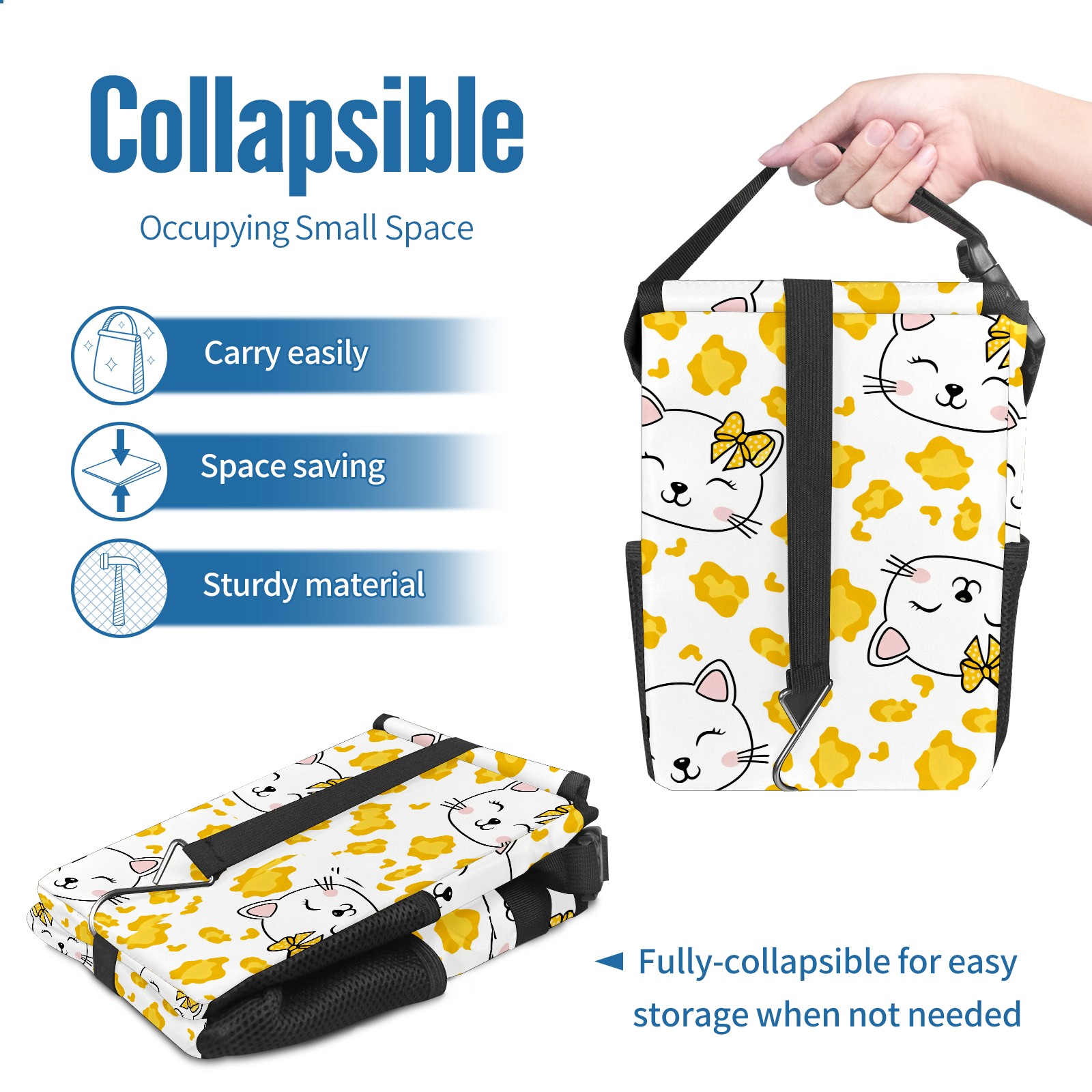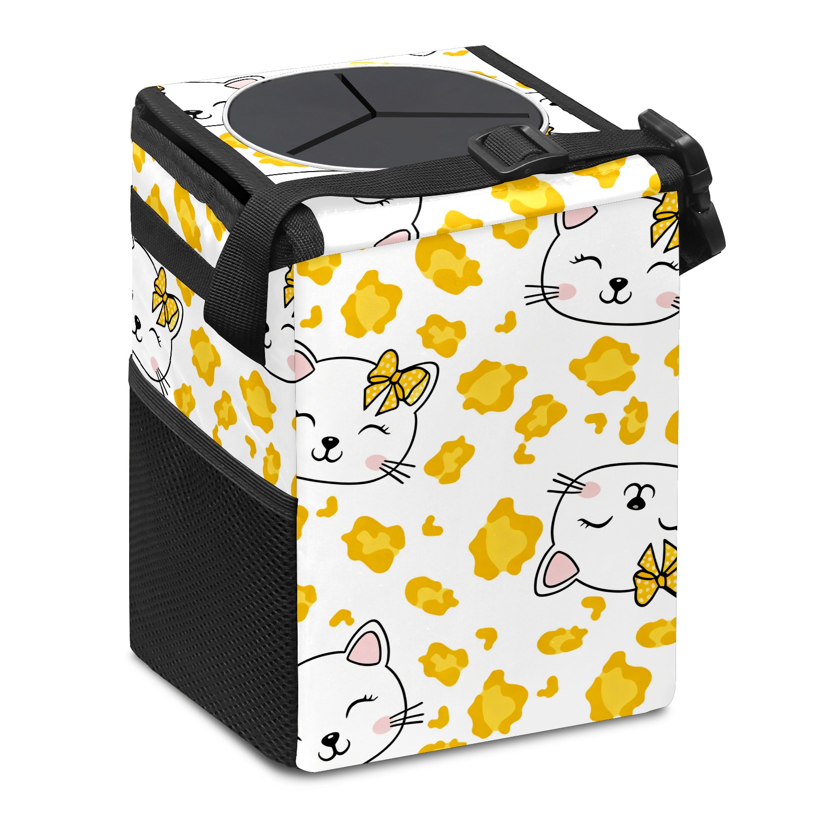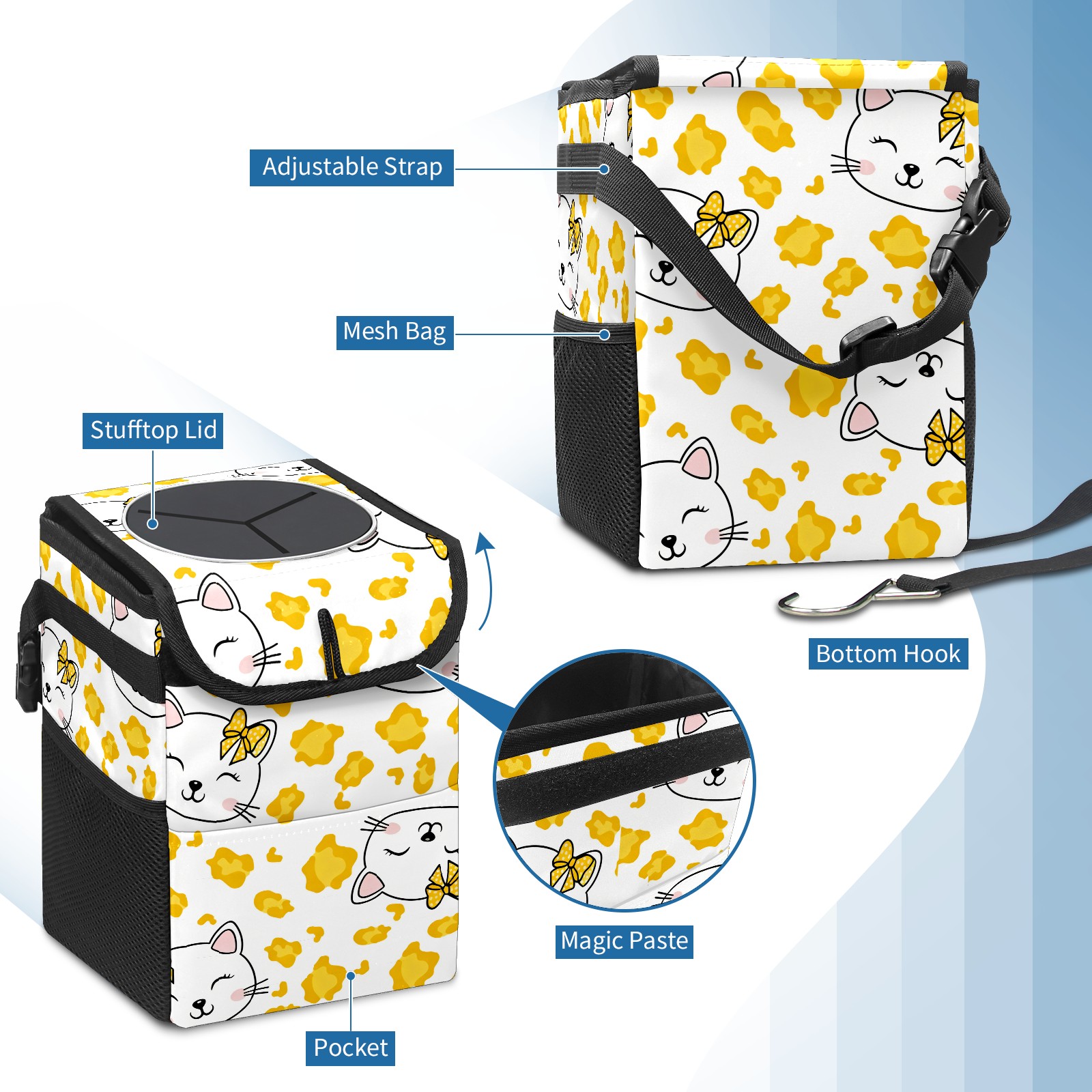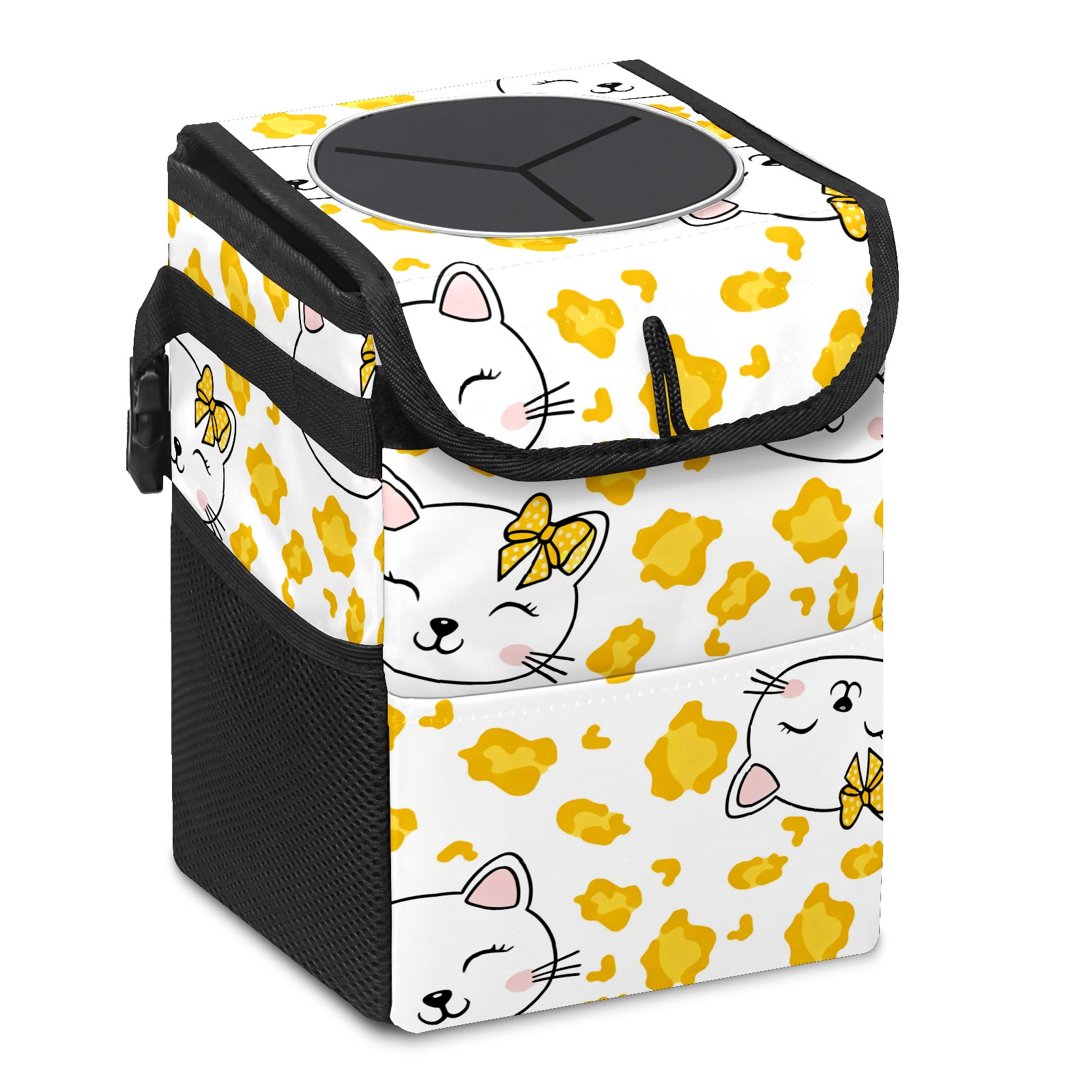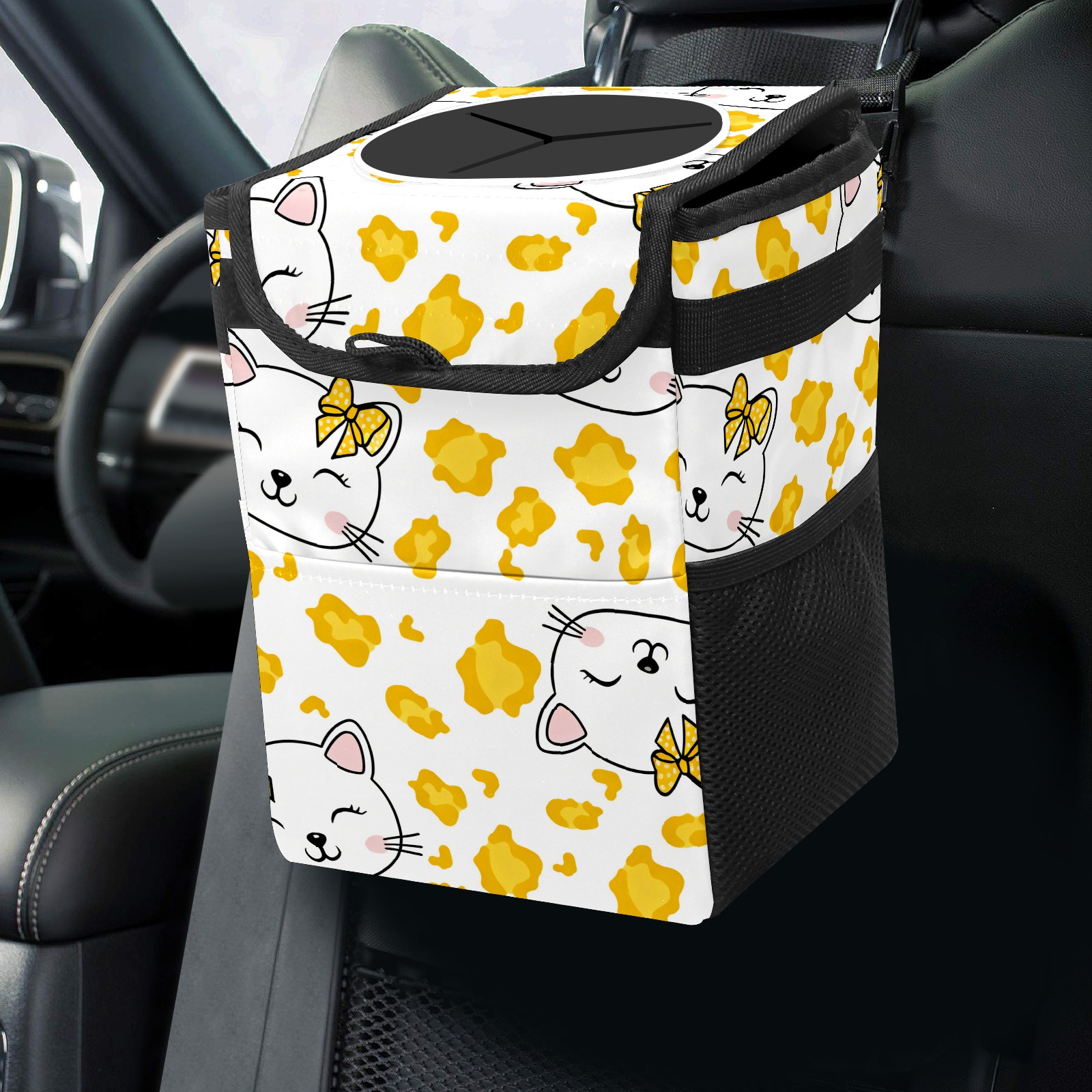 Car Trash Can with Lid, Small Portable Hanging Automotive Garbage Bin for Vehicles, Leakproof Waste Bag Container for SUV Truck Van Interior Auto Travel Road Trips(Hello Cat Yellow)