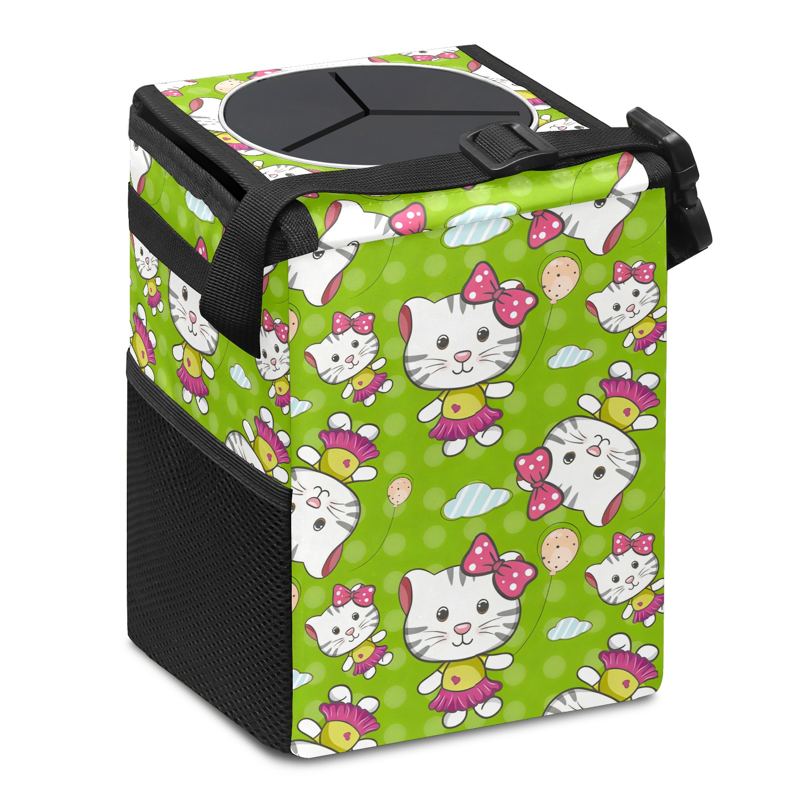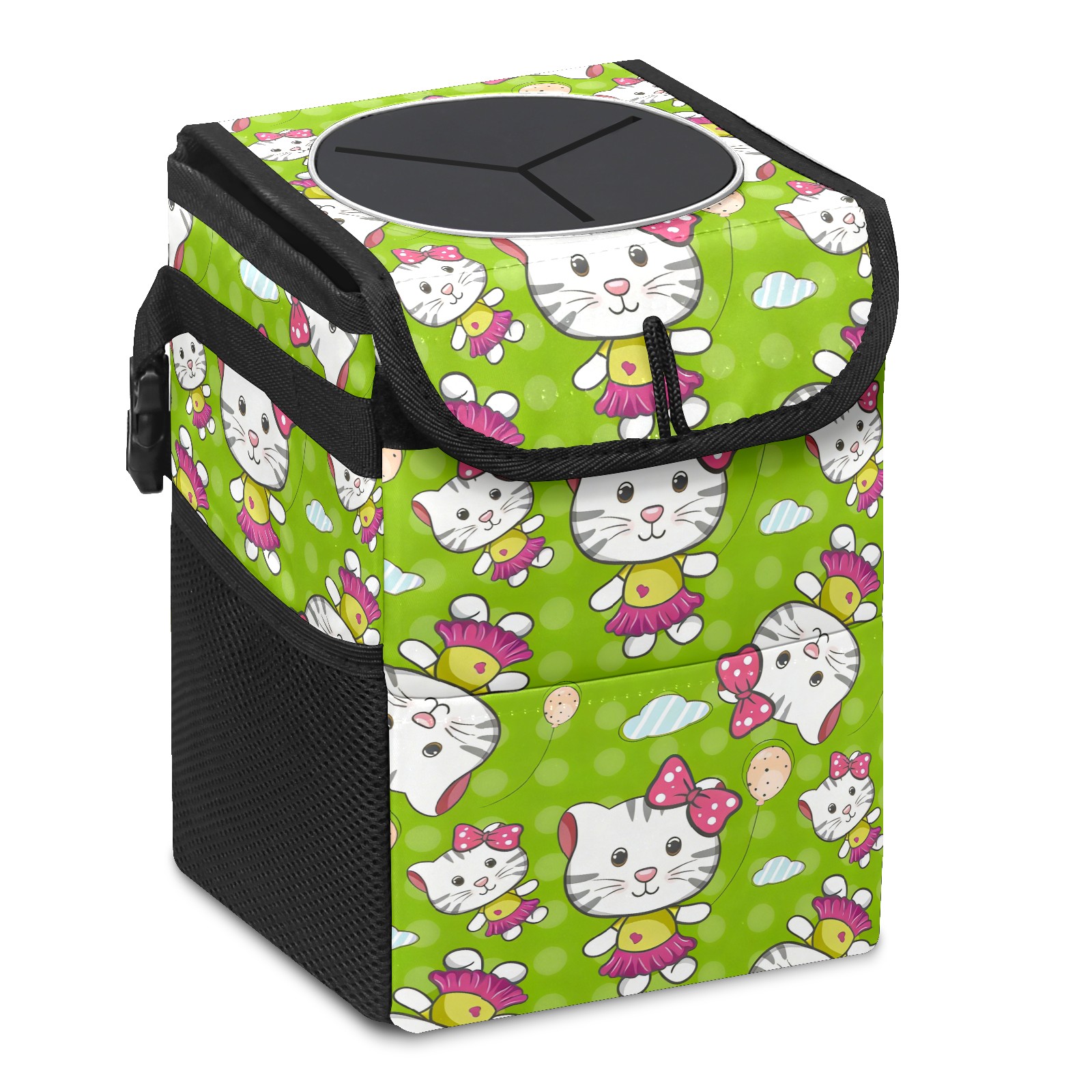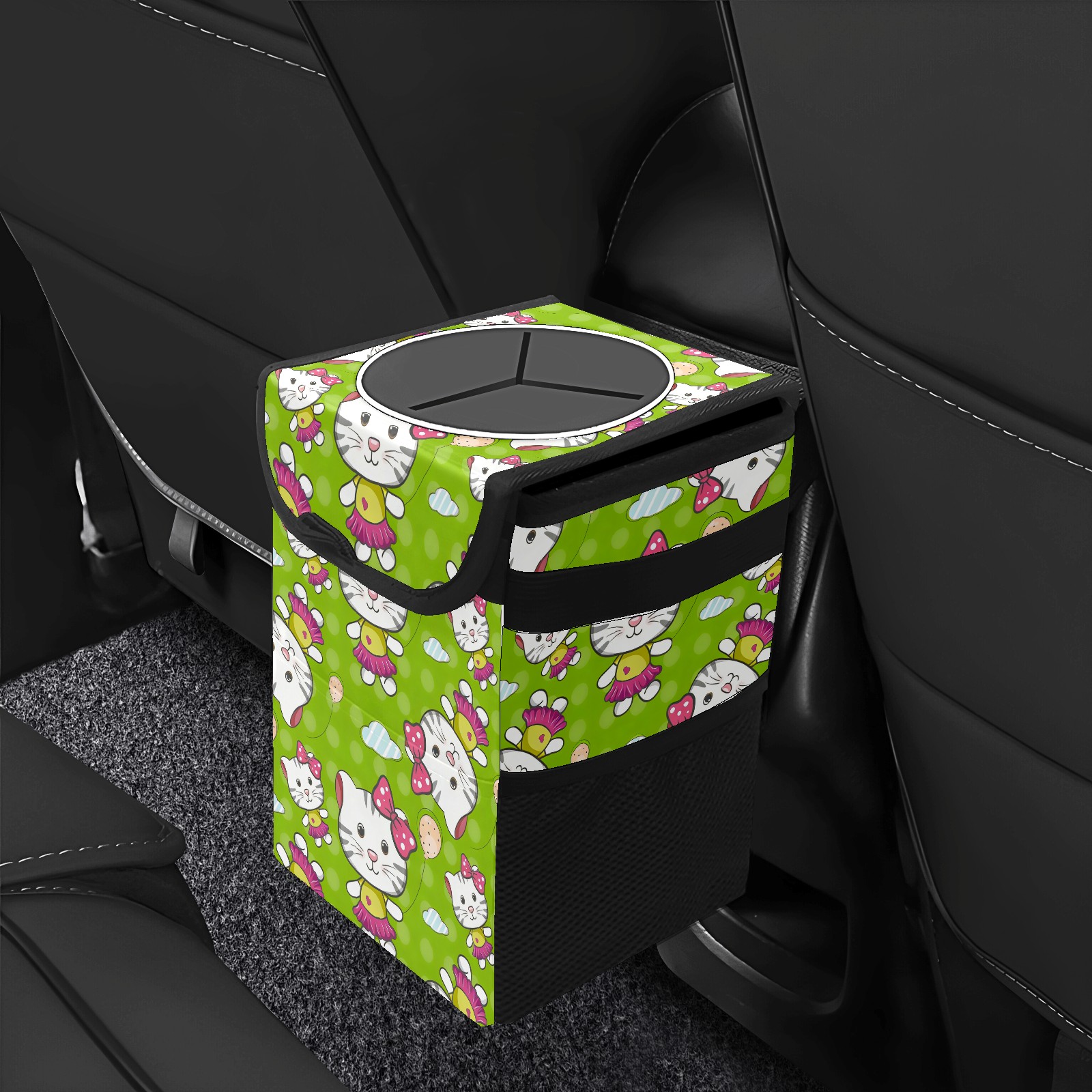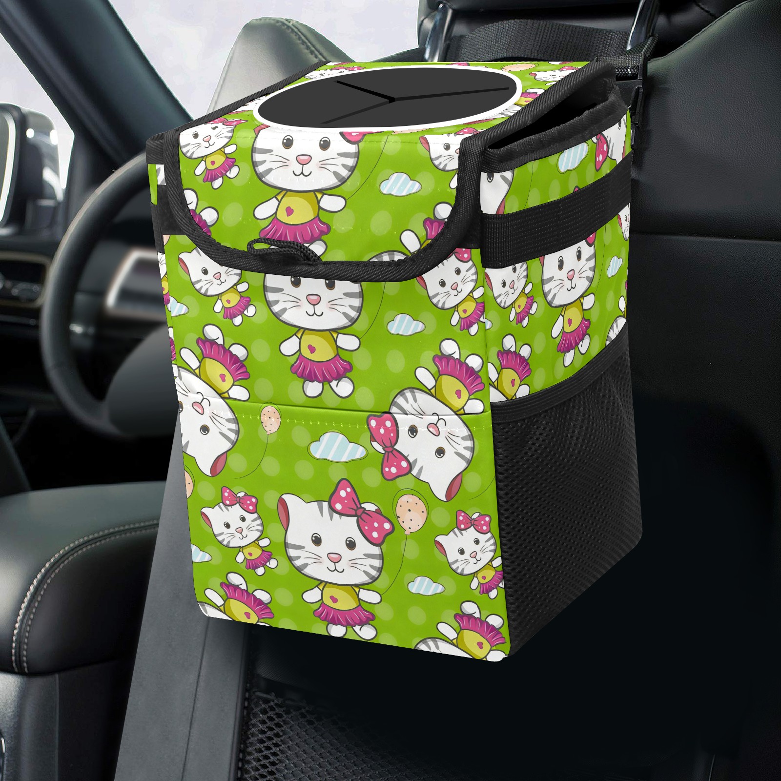 Car Trash Can with Lid, Small Portable Hanging Automotive Garbage Bin for Vehicles, Leakproof Waste Bag Container for SUV Truck Van Interior Auto Travel Road Trips(Vibrant Cat Green)