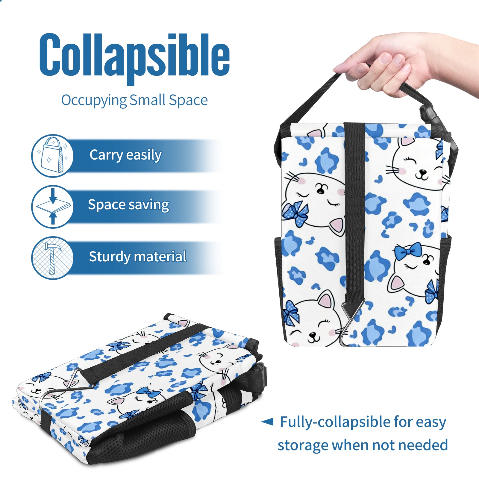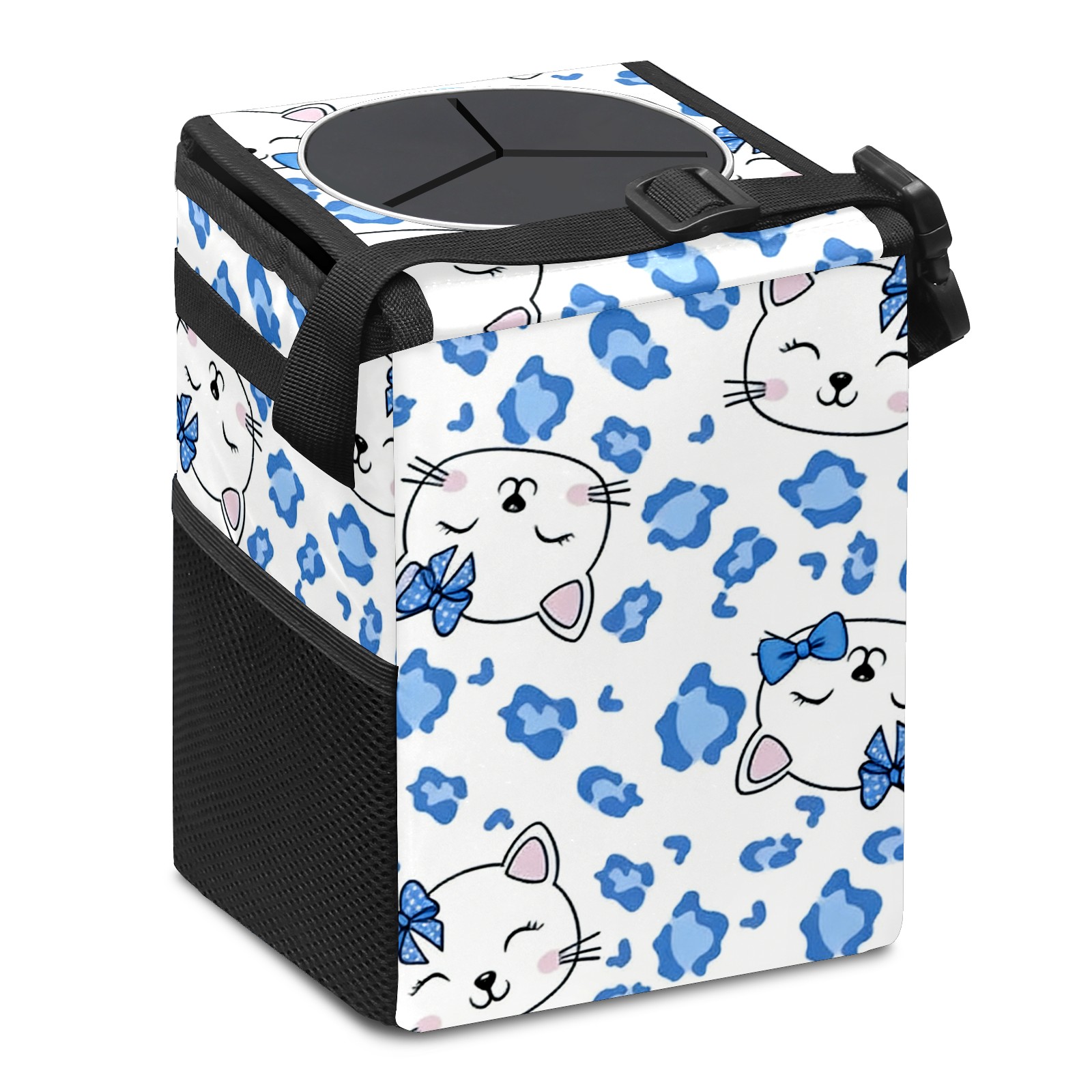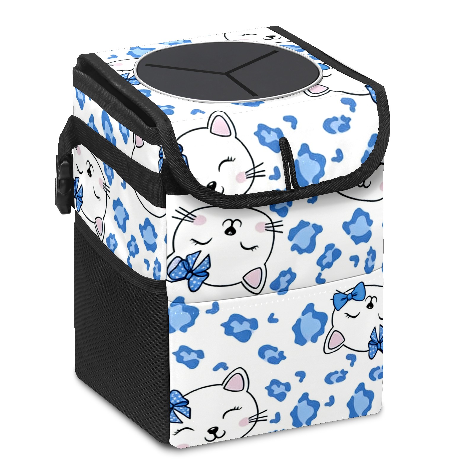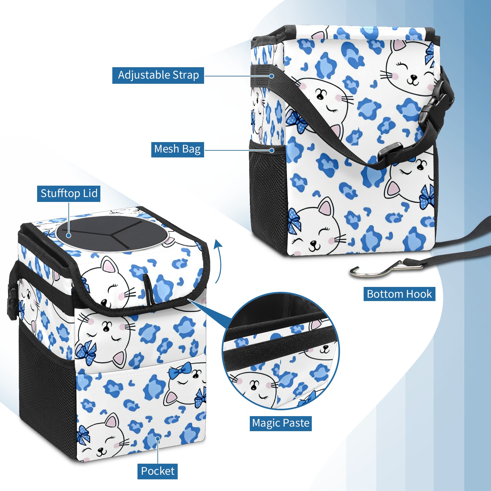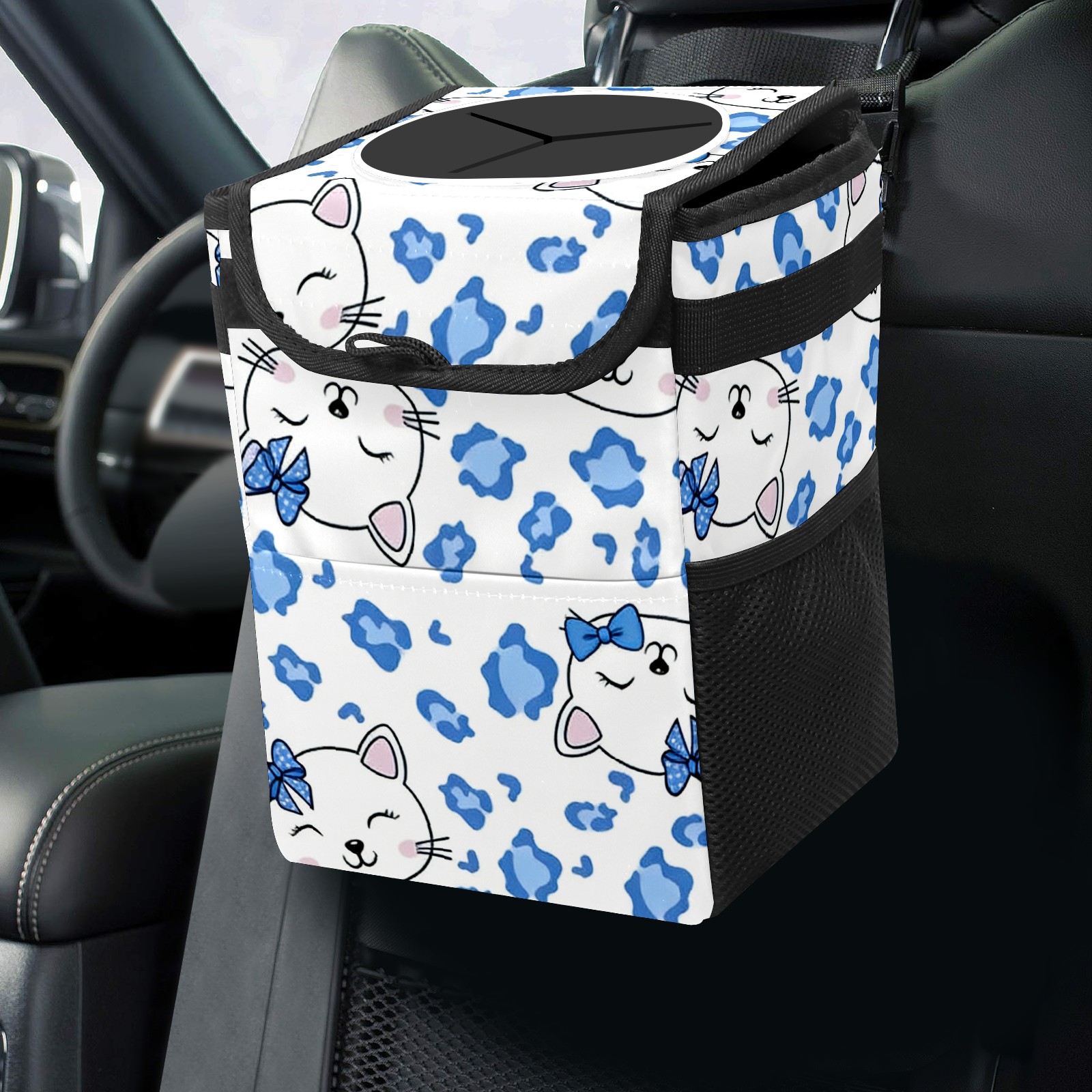 Car Trash Can with Lid, Small Portable Hanging Automotive Garbage Bin for Vehicles, Leakproof Waste Bag Container for SUV Truck Van Interior Auto Travel Road Trips(Soft Hello Cat Blue)