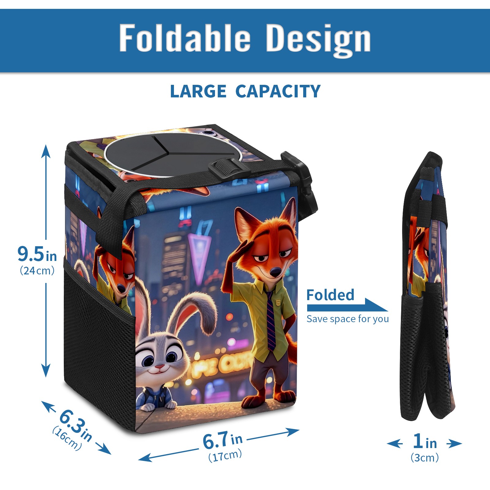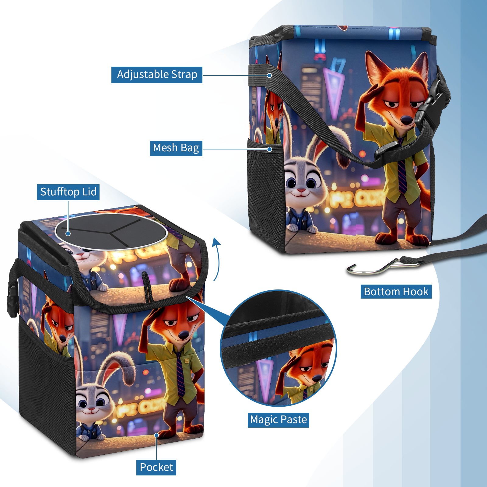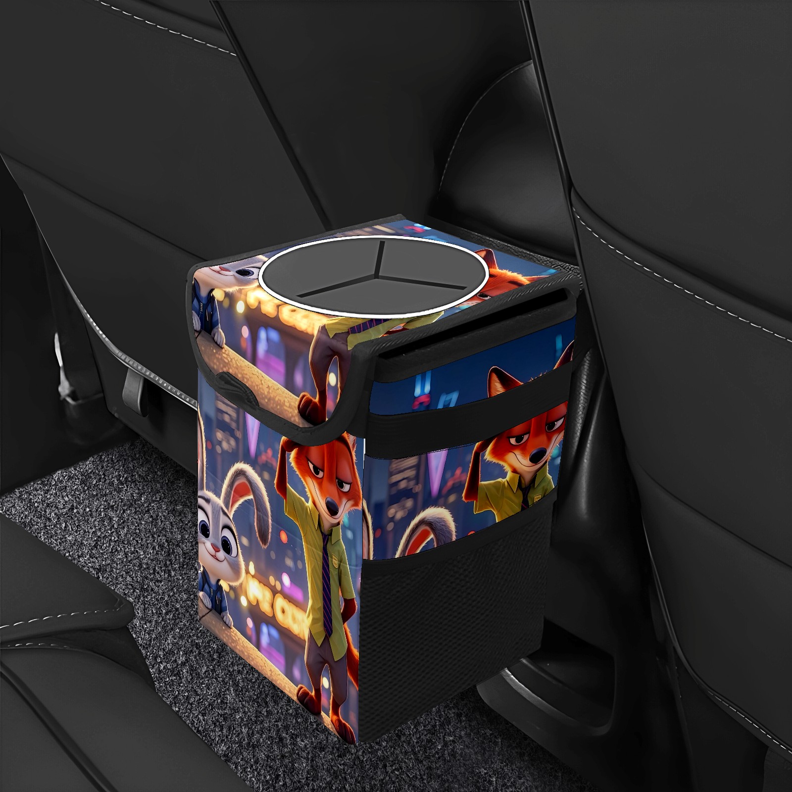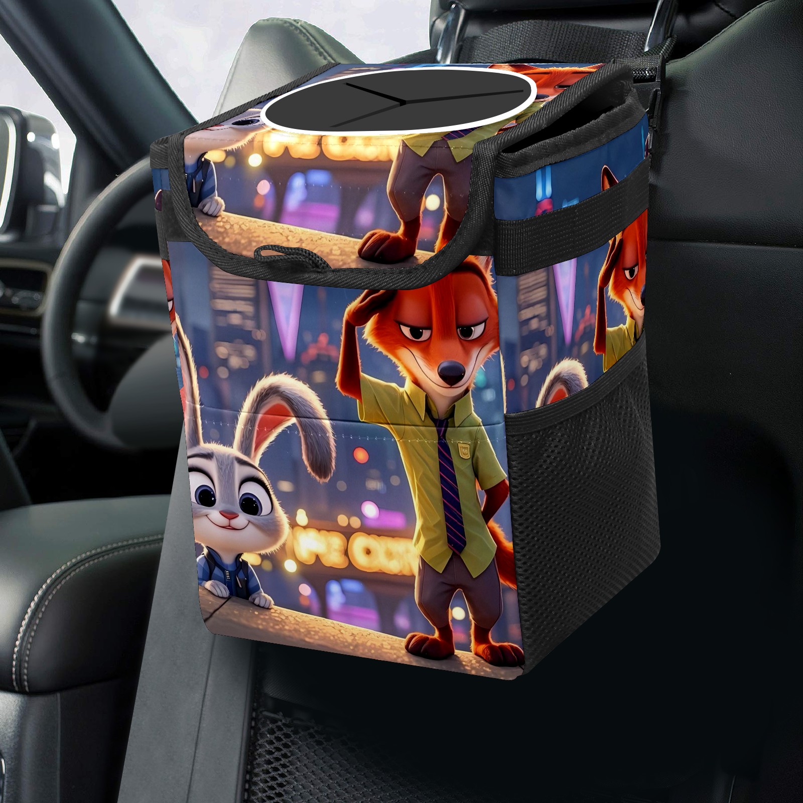 Car Trash Can with Lid, Small Portable Hanging Automotive Garbage Bin for Vehicles, Leakproof Waste Bag Container for SUV Truck Van Interior Auto Travel Road Trips(疯狂动物城 IPad版 09)