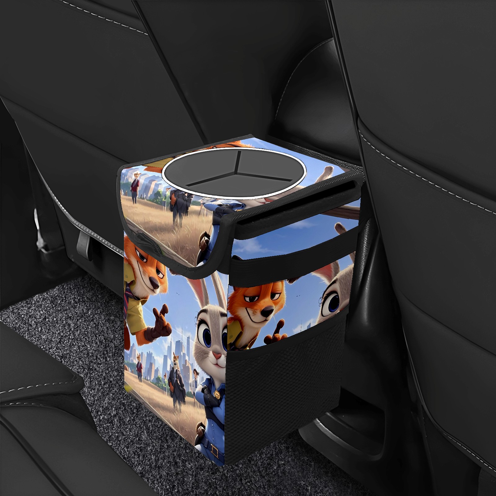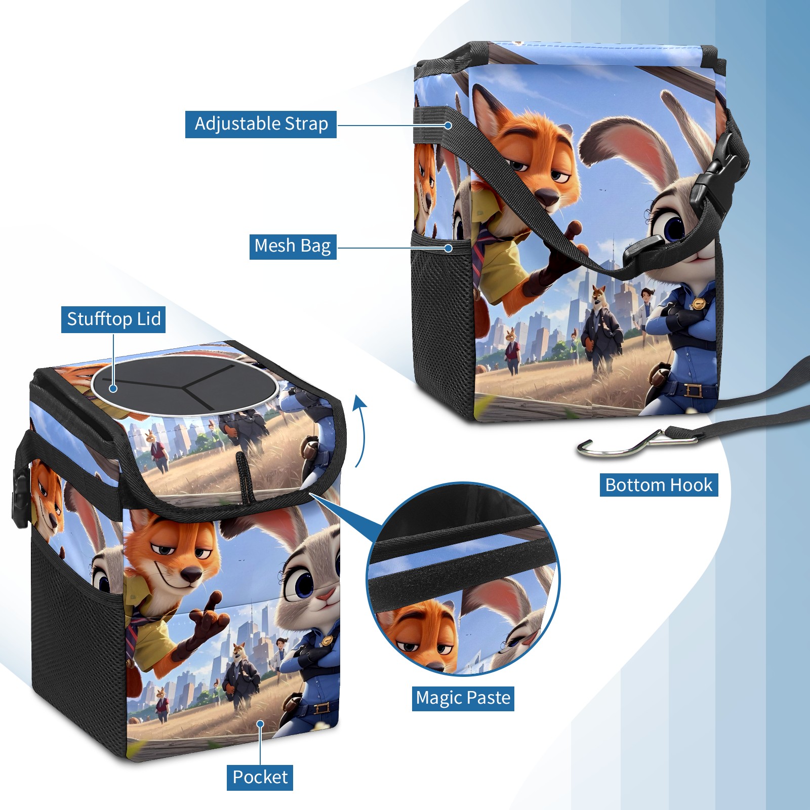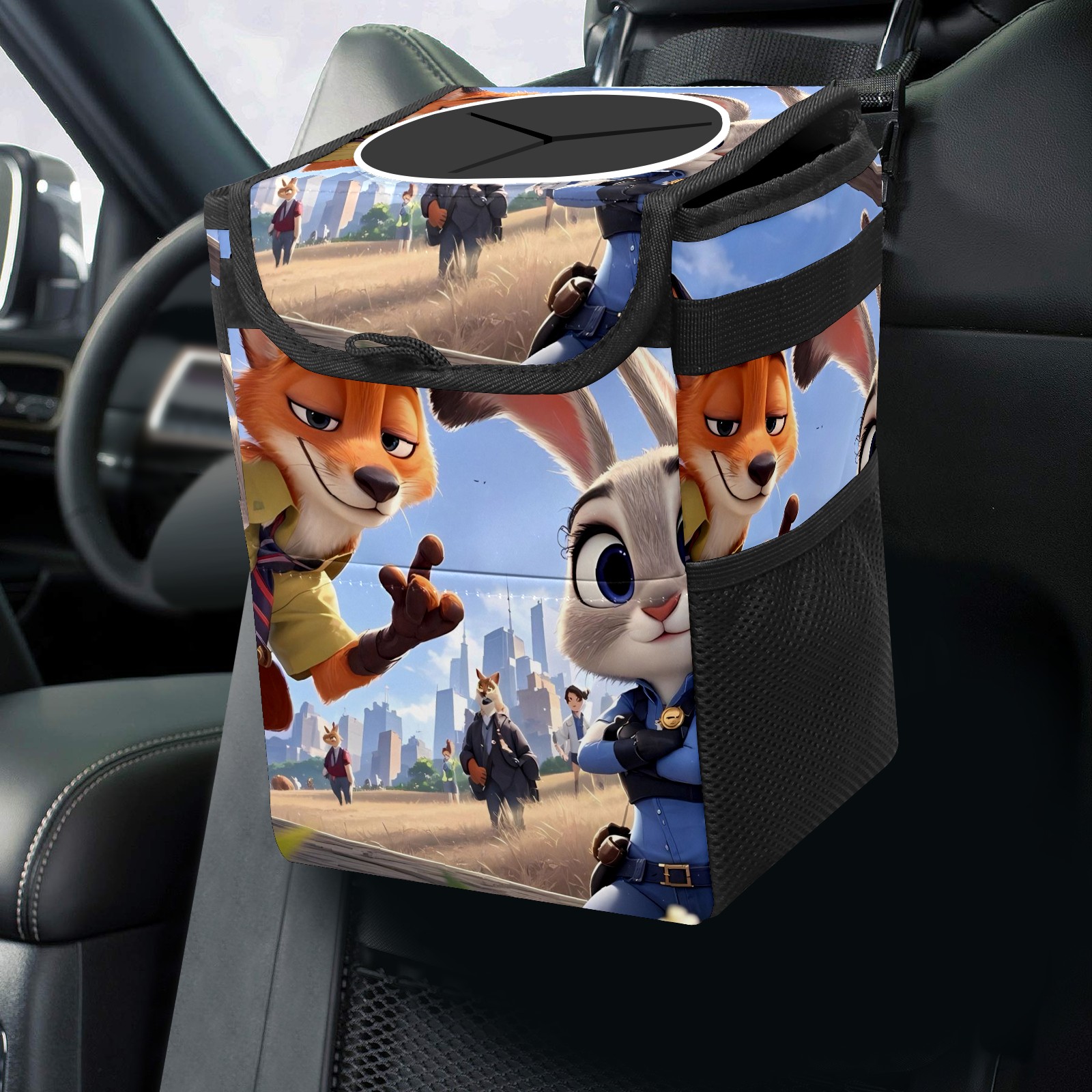Car Trash Can with Lid, Small Portable Hanging Automotive Garbage Bin for Vehicles, Leakproof Waste Bag Container for SUV Truck Van Interior Auto Travel Road Trips(疯狂动物城 IPad版 08)