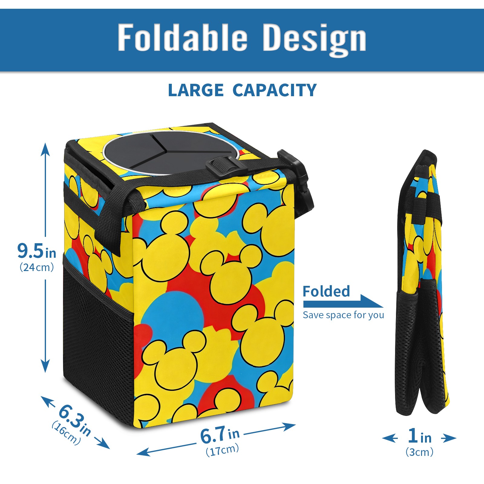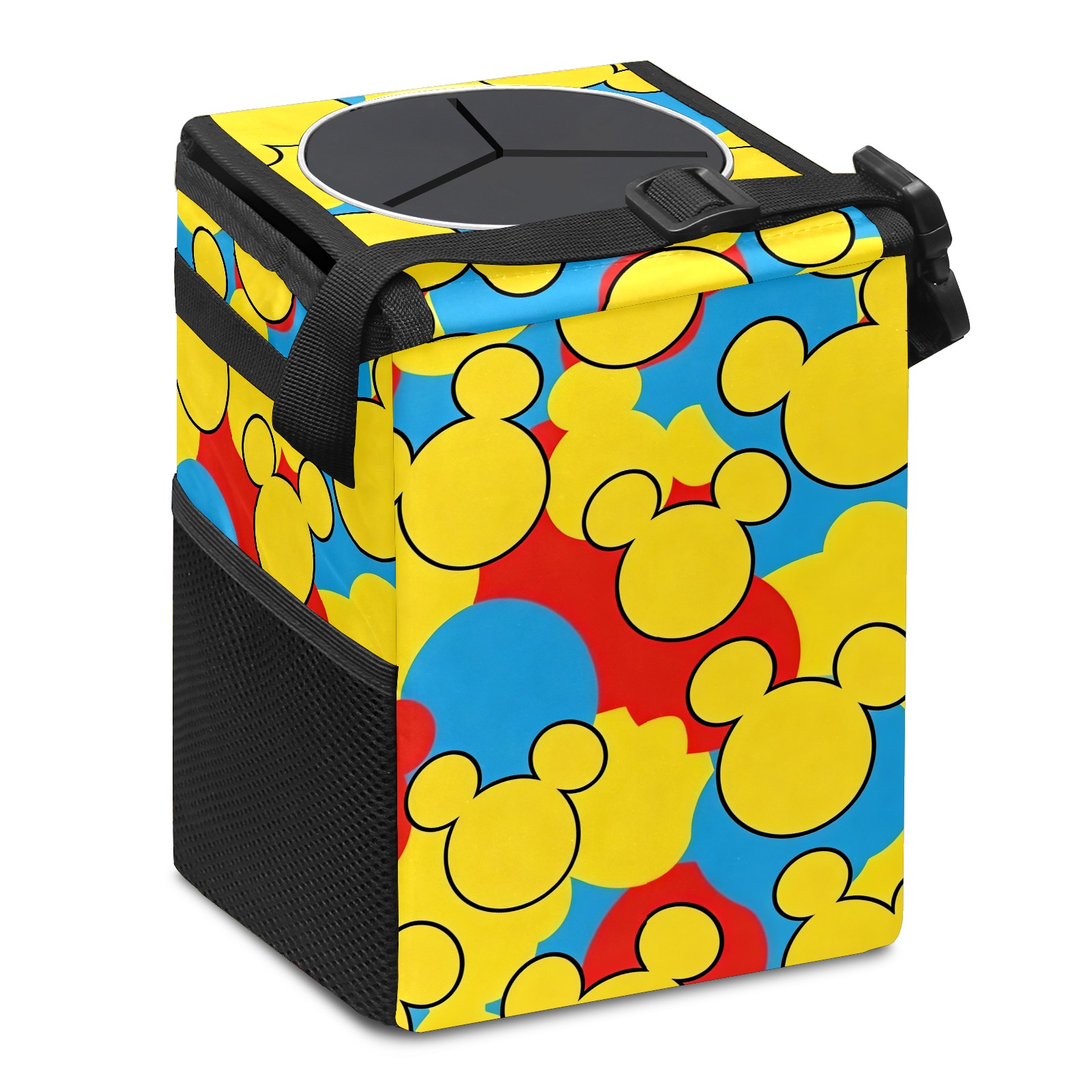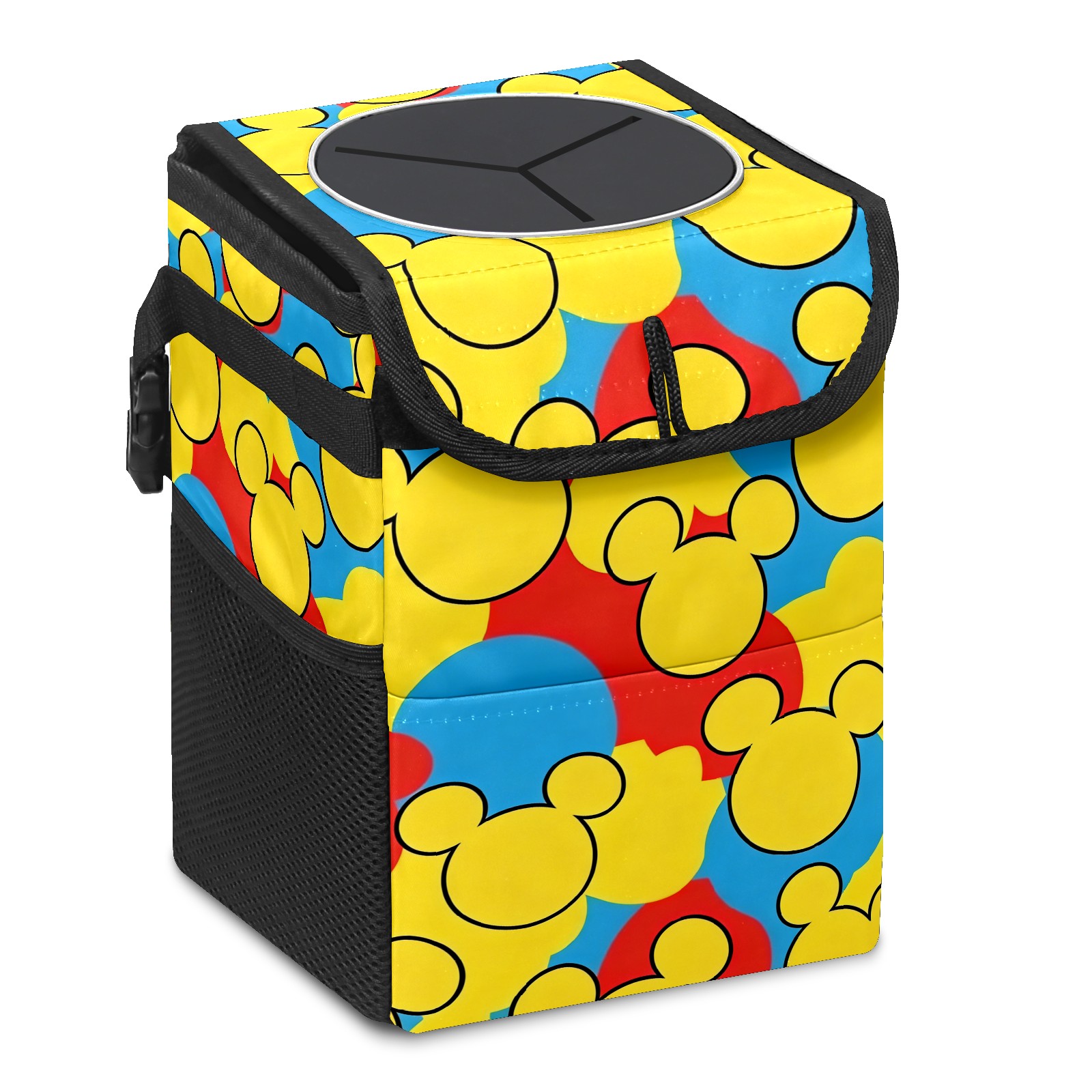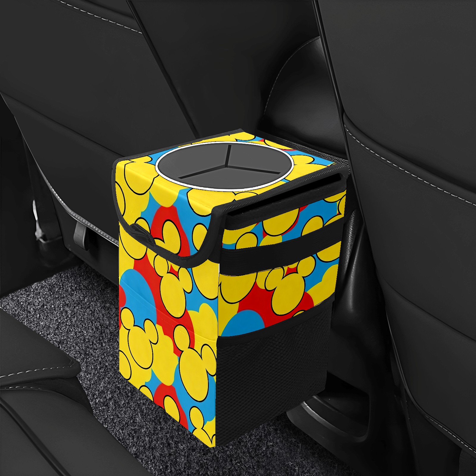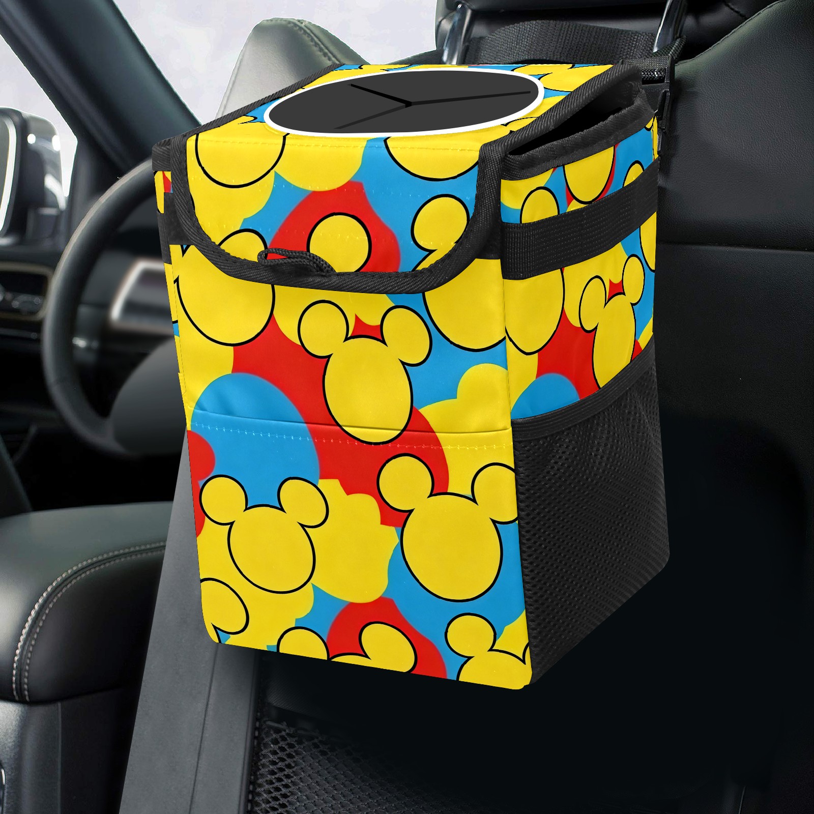 Car Trash Can with Lid, Small Portable Hanging Automotive Garbage Bin for Vehicles, Leakproof Waste Bag Container for SUV Truck Van Interior Auto Travel Road Trips(Colorful Mouse Yellow)