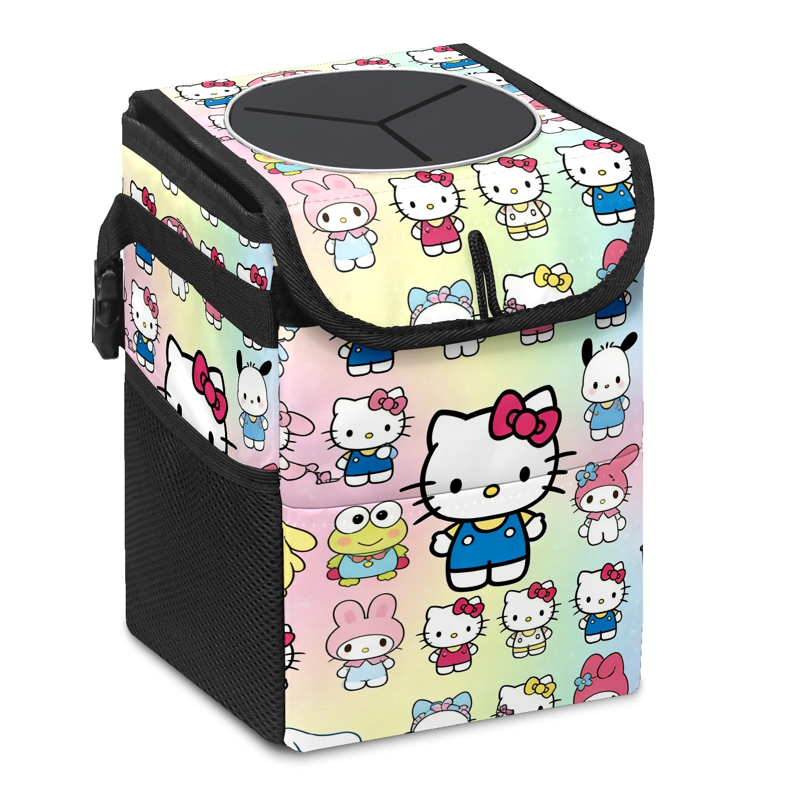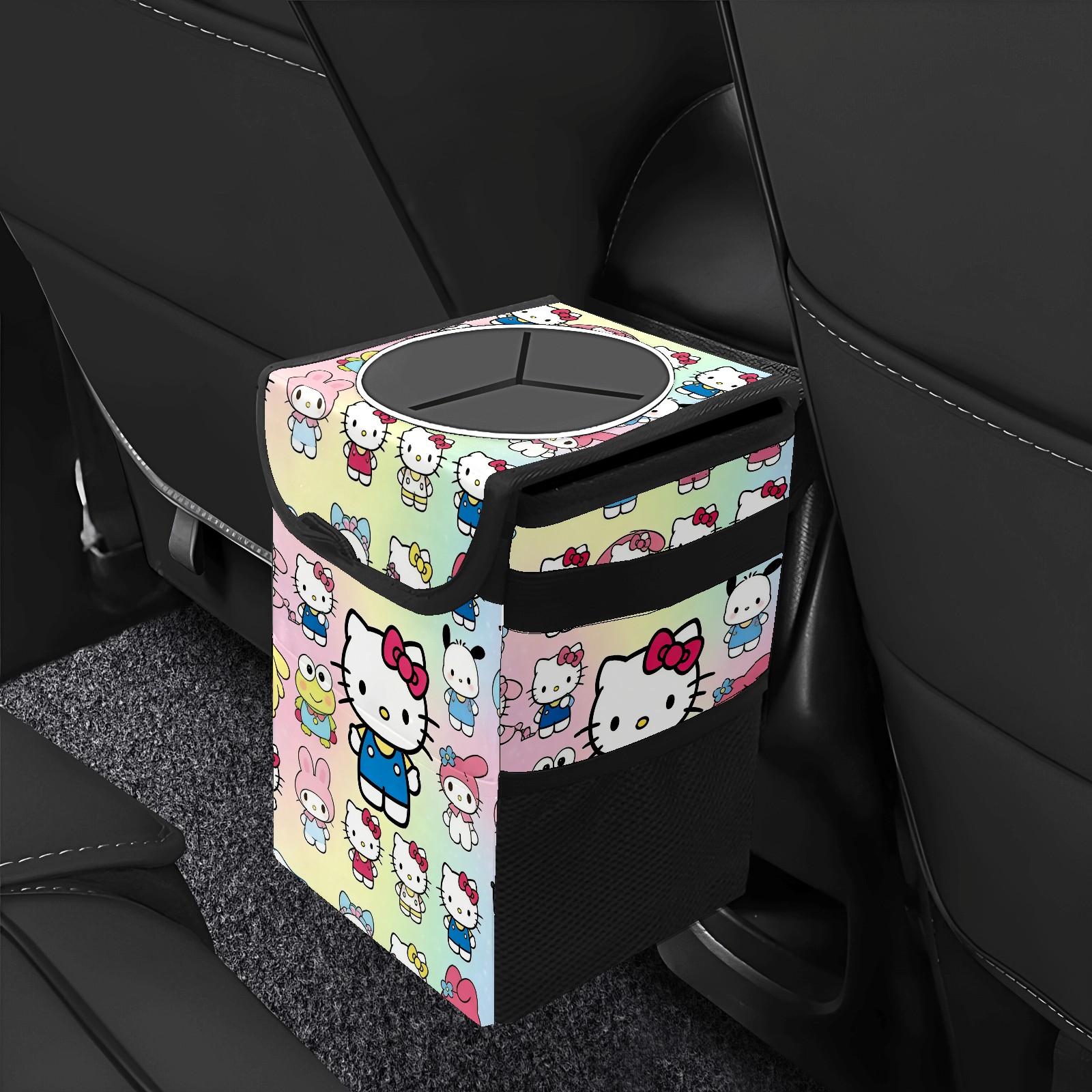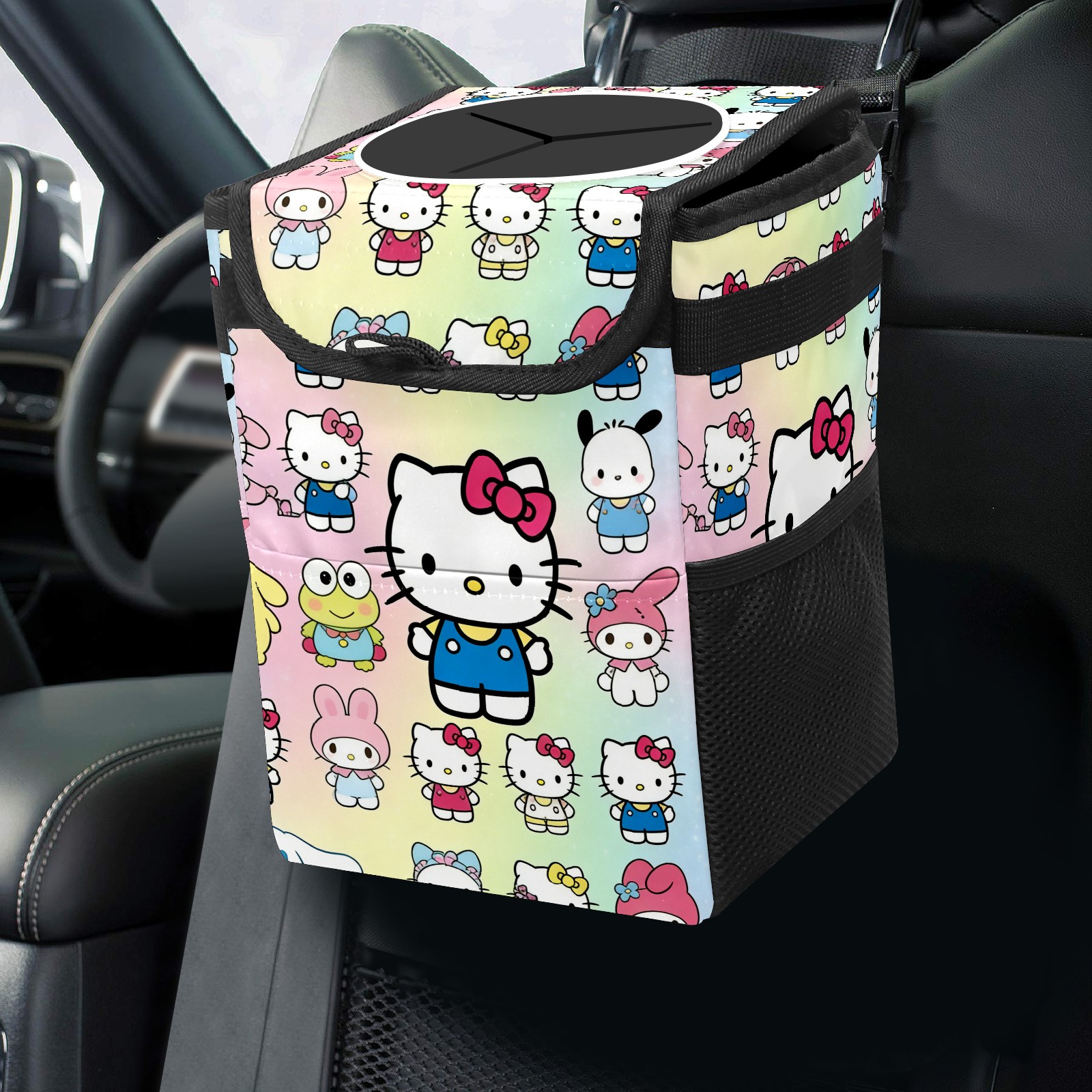 Car Trash Can with Lid, Small Portable Hanging Automotive Garbage Bin for Vehicles, Leakproof Waste Bag Container for SUV Truck Van Interior Auto Travel Road Trips(Cartoon Character Multi)