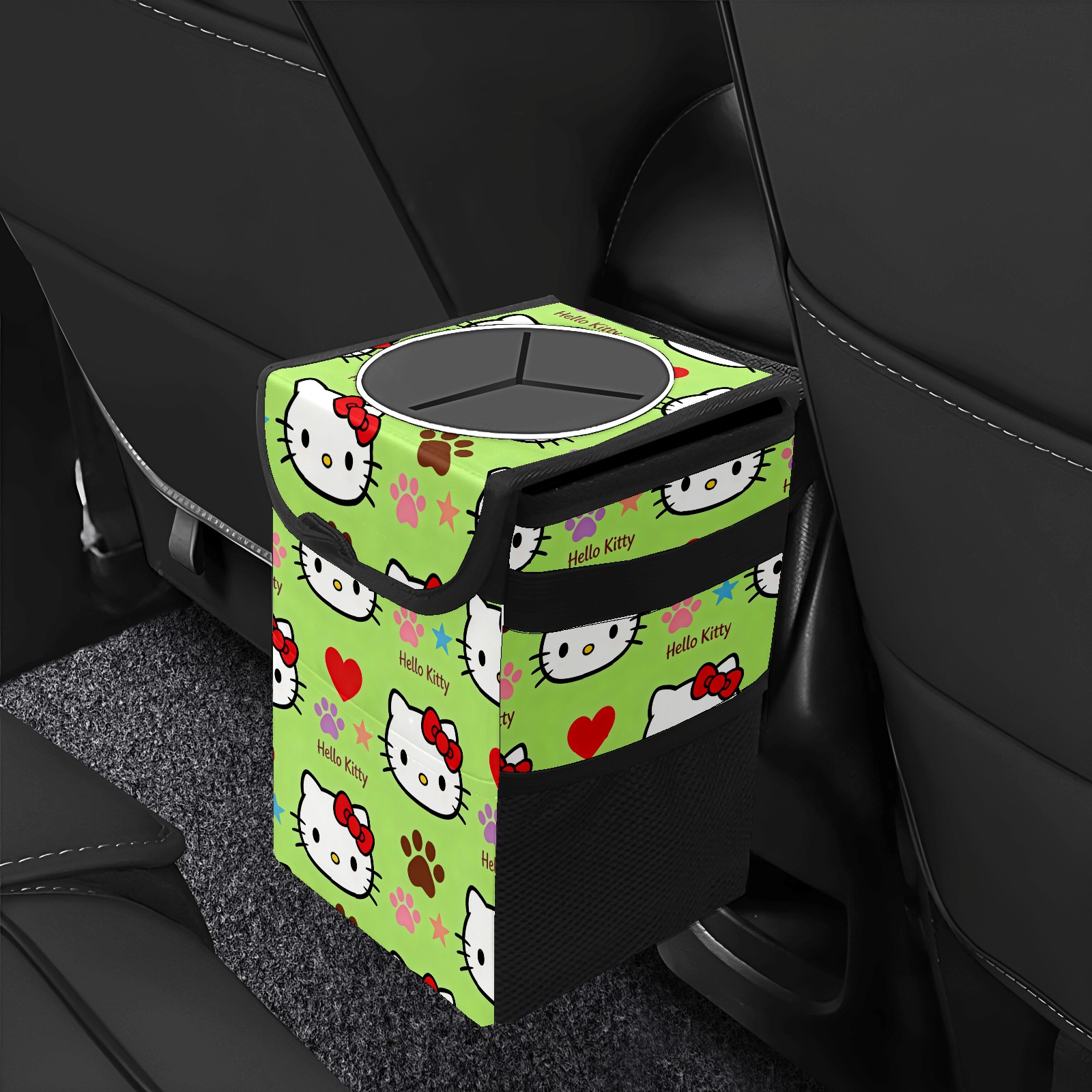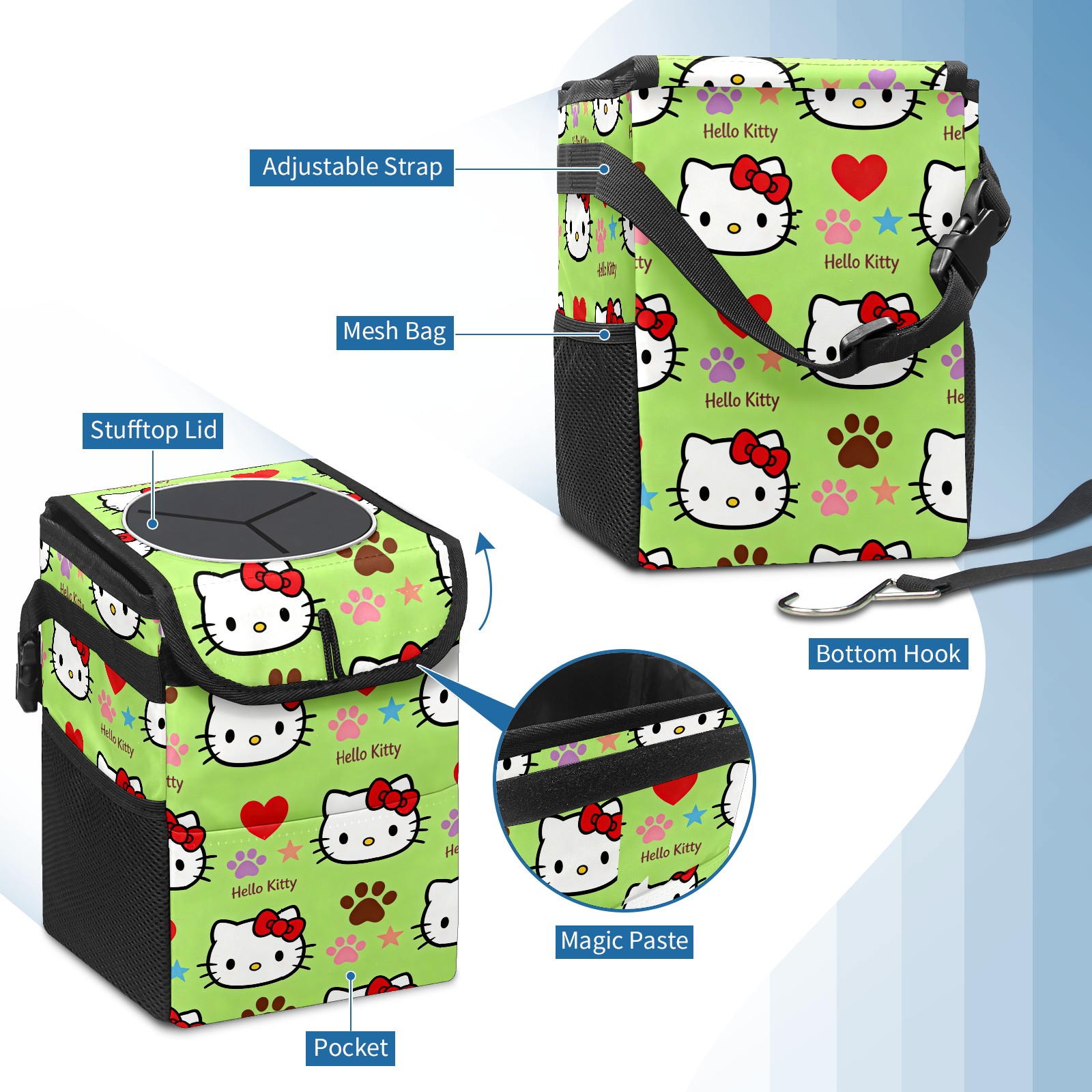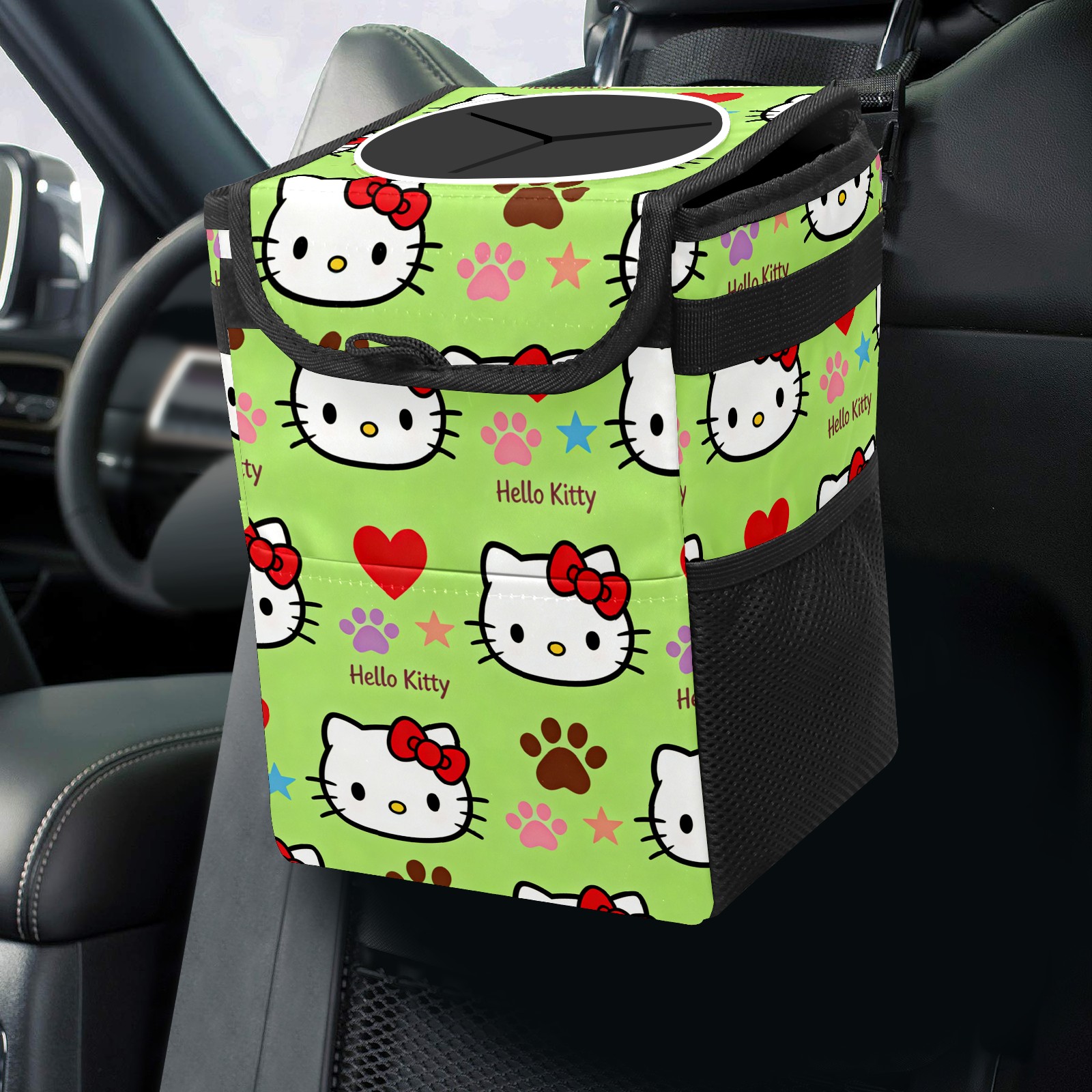 Car Trash Can with Lid, Small Portable Hanging Automotive Garbage Bin for Vehicles, Leakproof Waste Bag Container for SUV Truck Van Interior Auto Travel Road Trips(Fiery Hello Kitty Green)