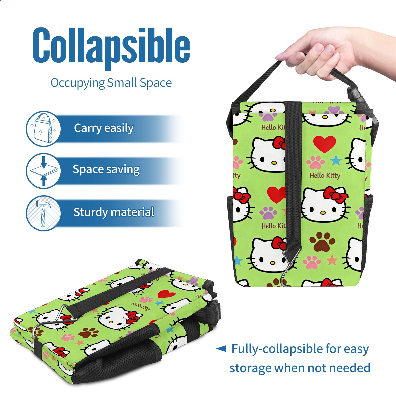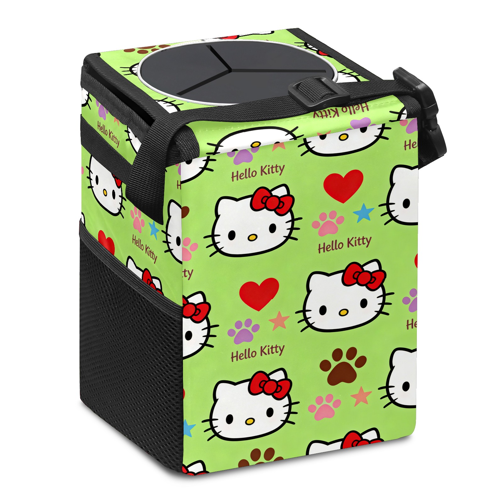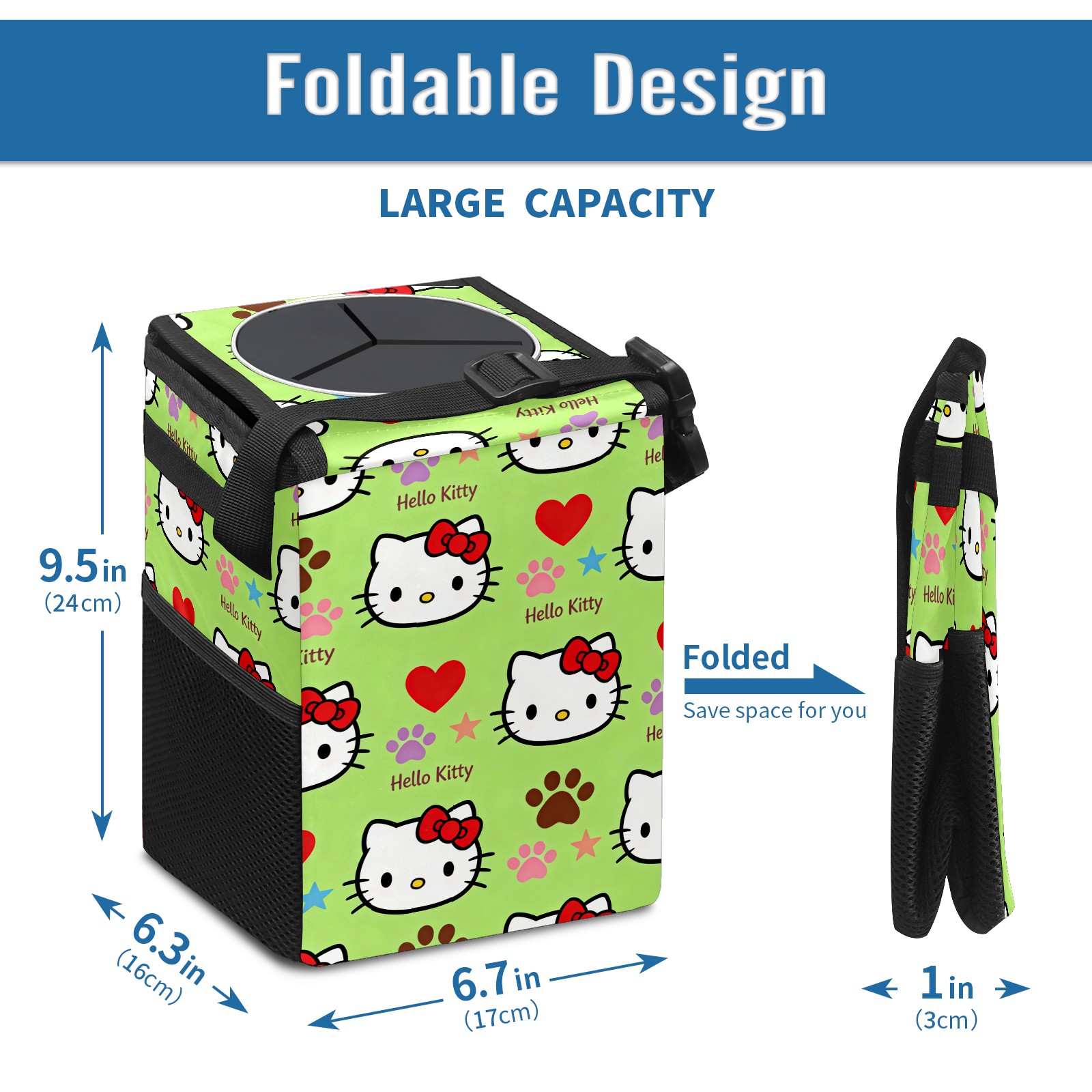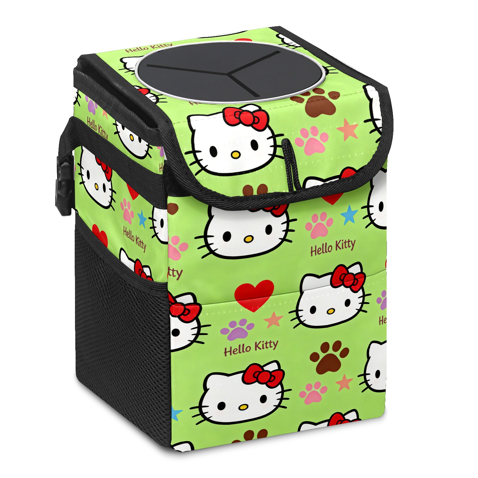 Car Trash Can with Lid, Small Portable Hanging Automotive Garbage Bin for Vehicles, Leakproof Waste Bag Container for SUV Truck Van Interior Auto Travel Road Trips(Fiery Hello Kitty Green)
