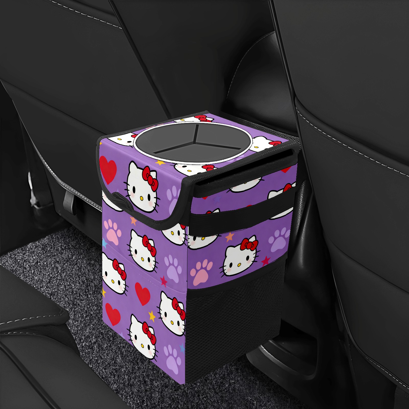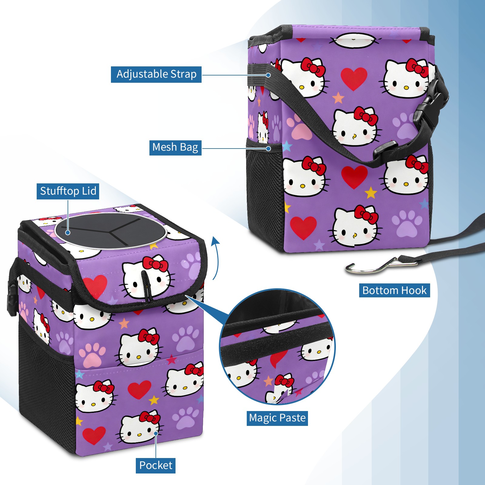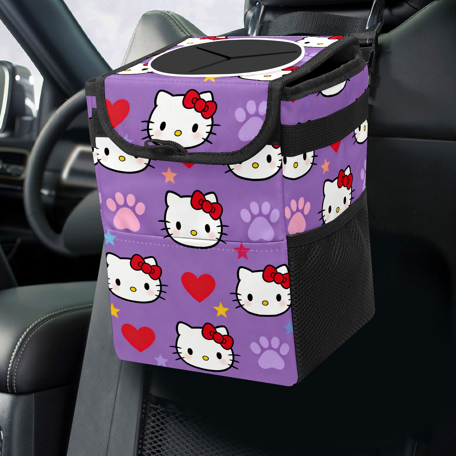 Car Trash Can with Lid, Small Portable Hanging Automotive Garbage Bin for Vehicles, Leakproof Waste Bag Container for SUV Truck Van Interior Auto Travel Road Trips(Hello Kitty Purple)
