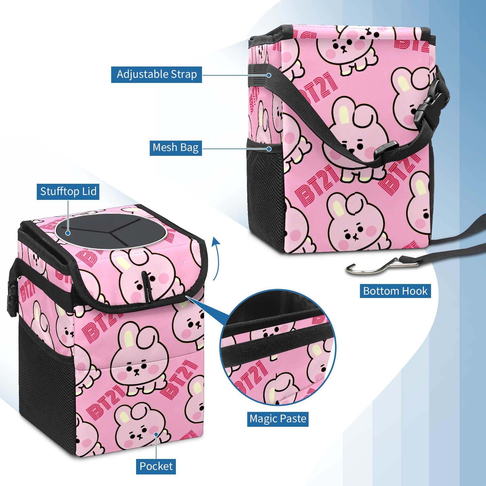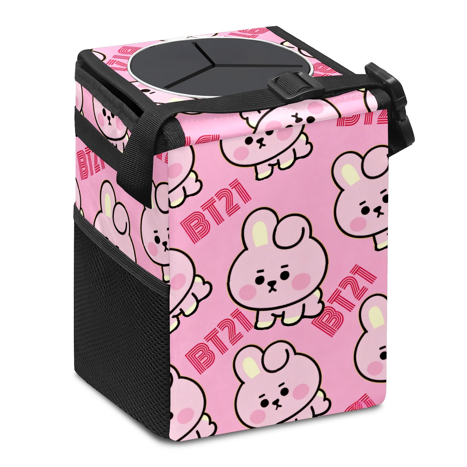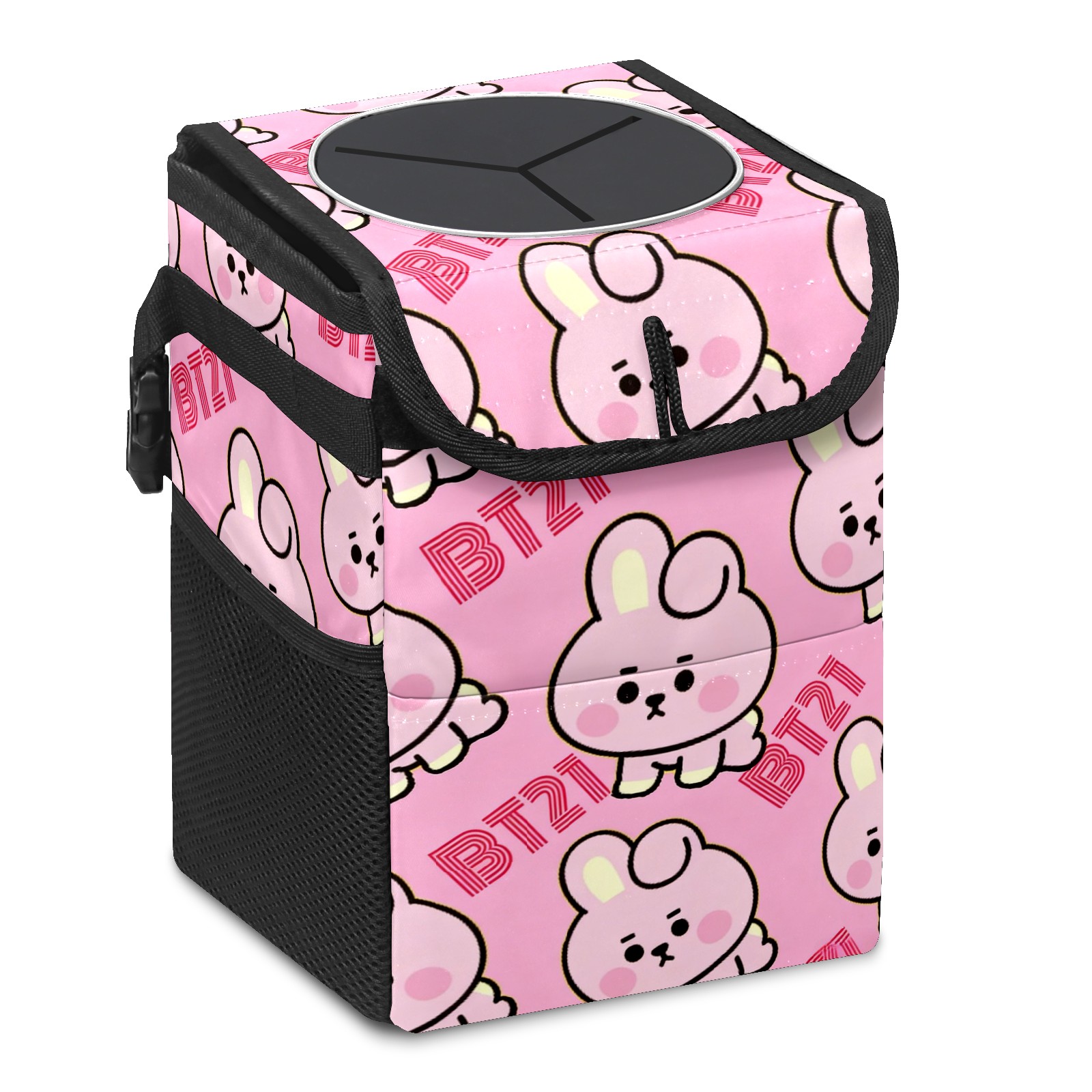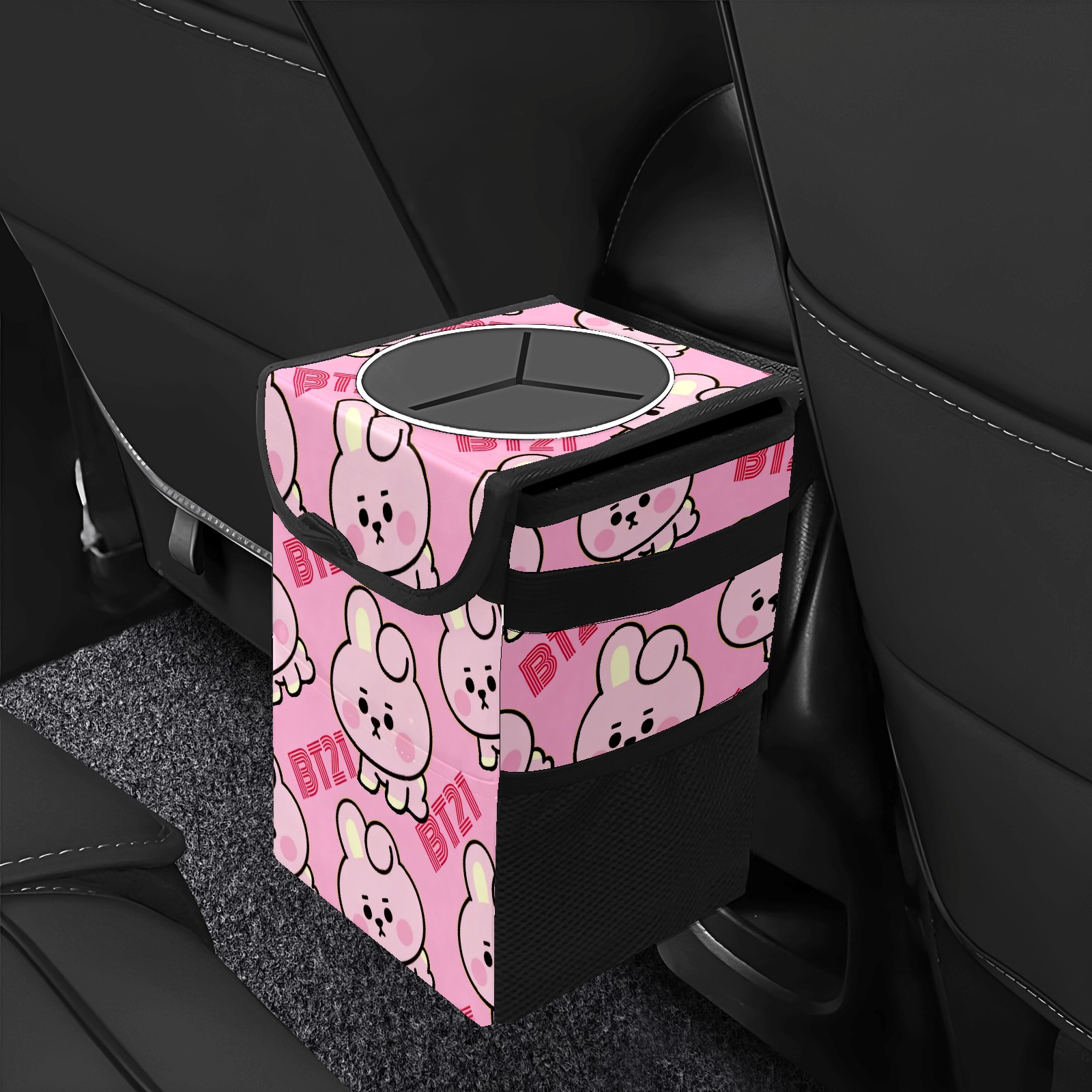 Car Trash Can with Lid, Small Portable Hanging Automotive Garbage Bin for Vehicles, Leakproof Waste Bag Container for SUV Truck Van Interior Auto Travel Road Trips(BT21 Bunny)
