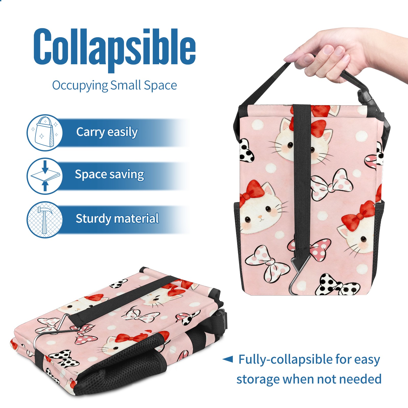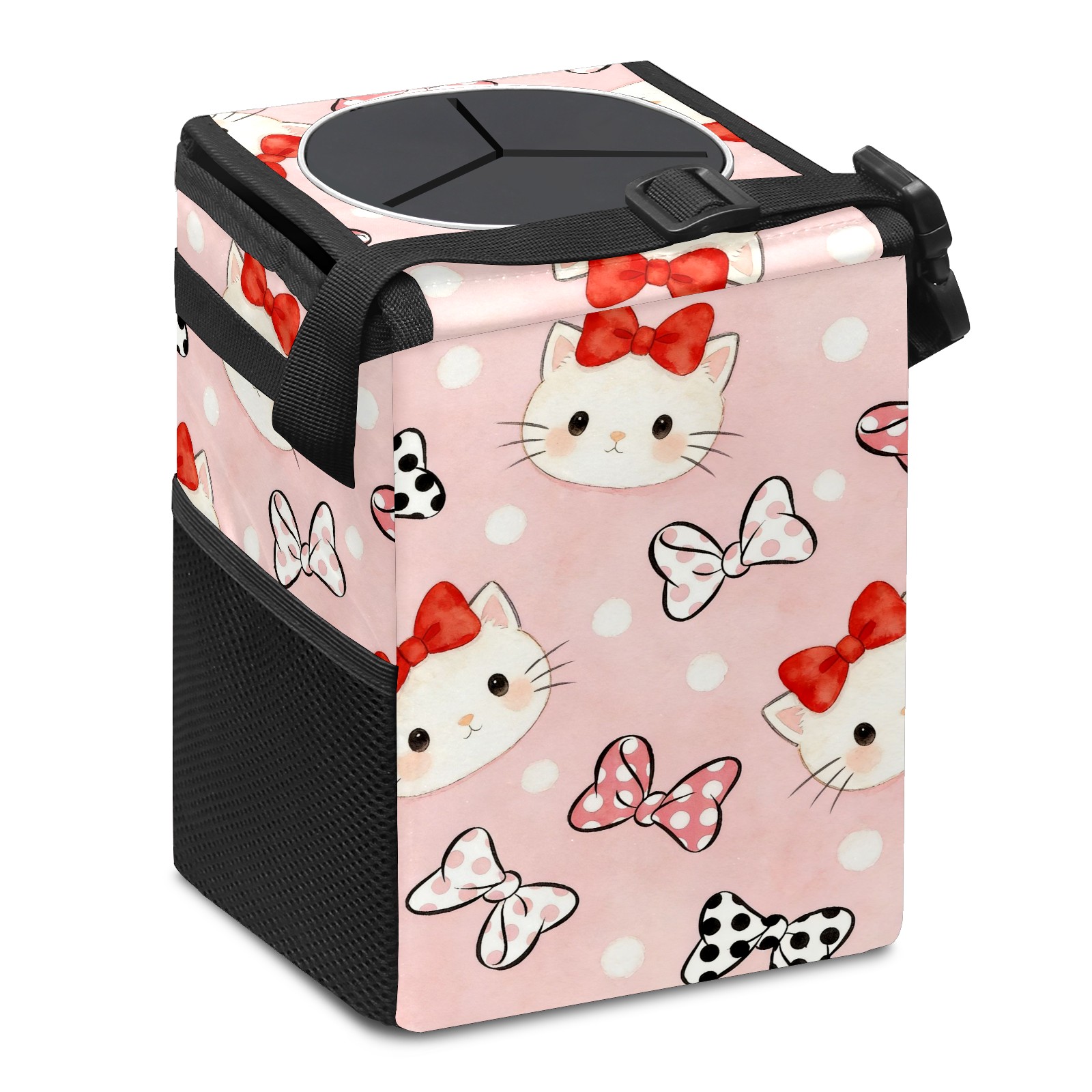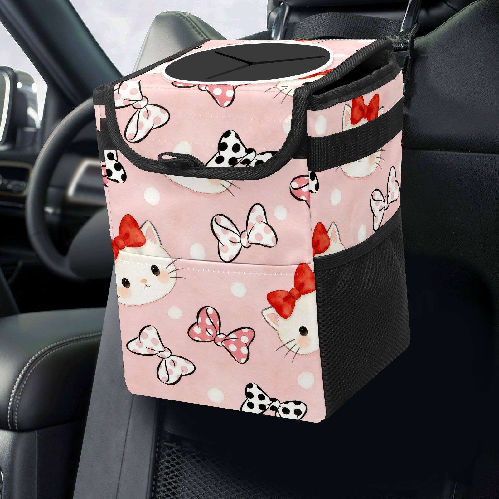 Car Trash Can with Lid, Small Portable Hanging Automotive Garbage Bin for Vehicles, Leakproof Waste Bag Container for SUV Truck Van Interior Auto Travel Road Trips(Kitty Bows)