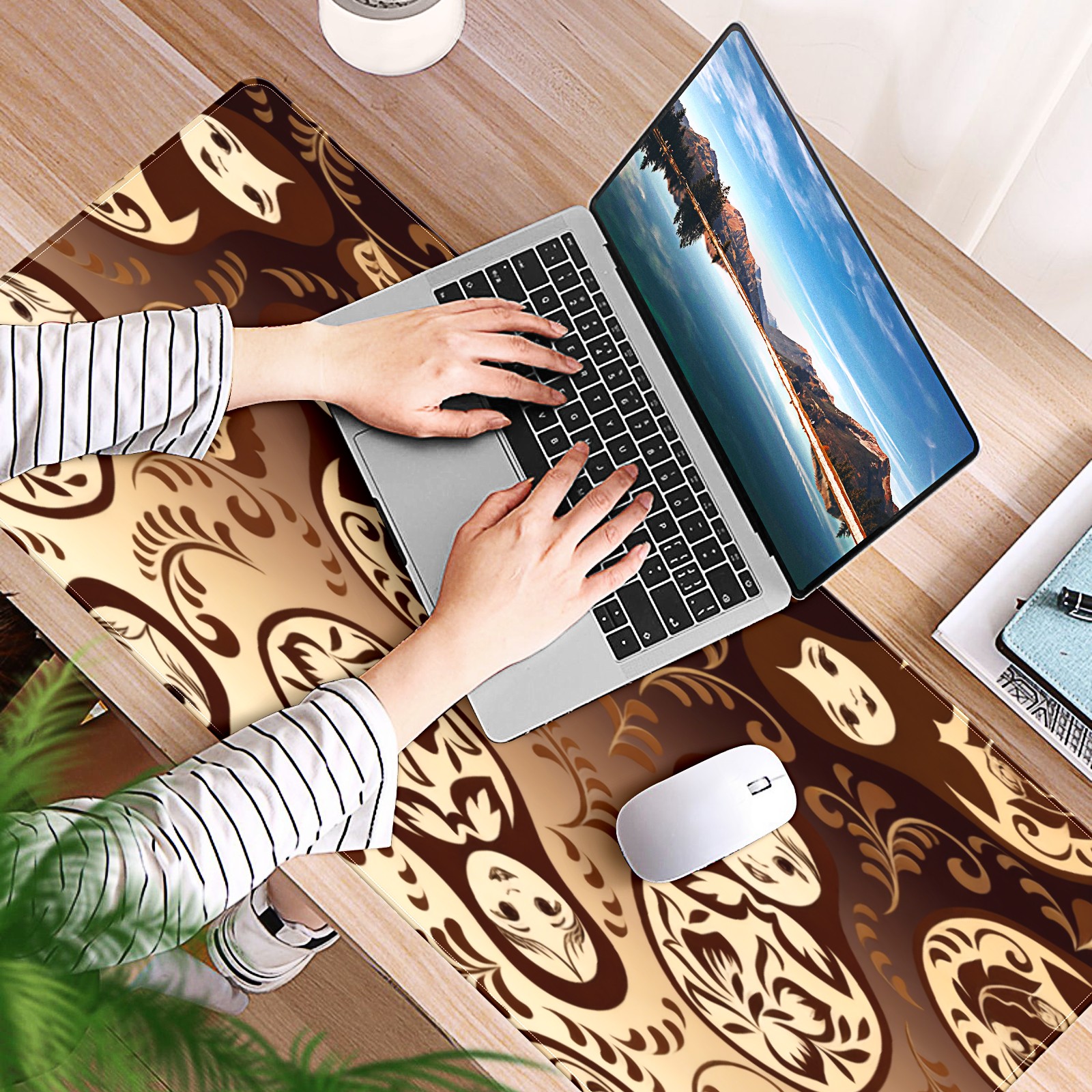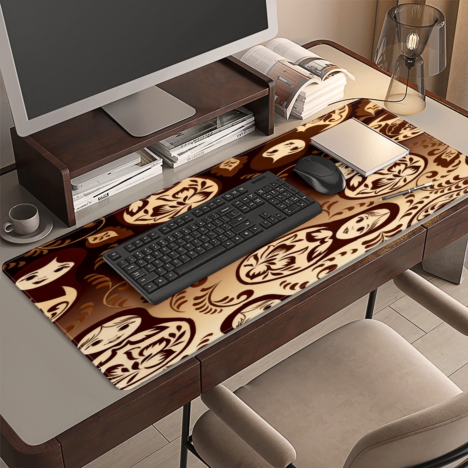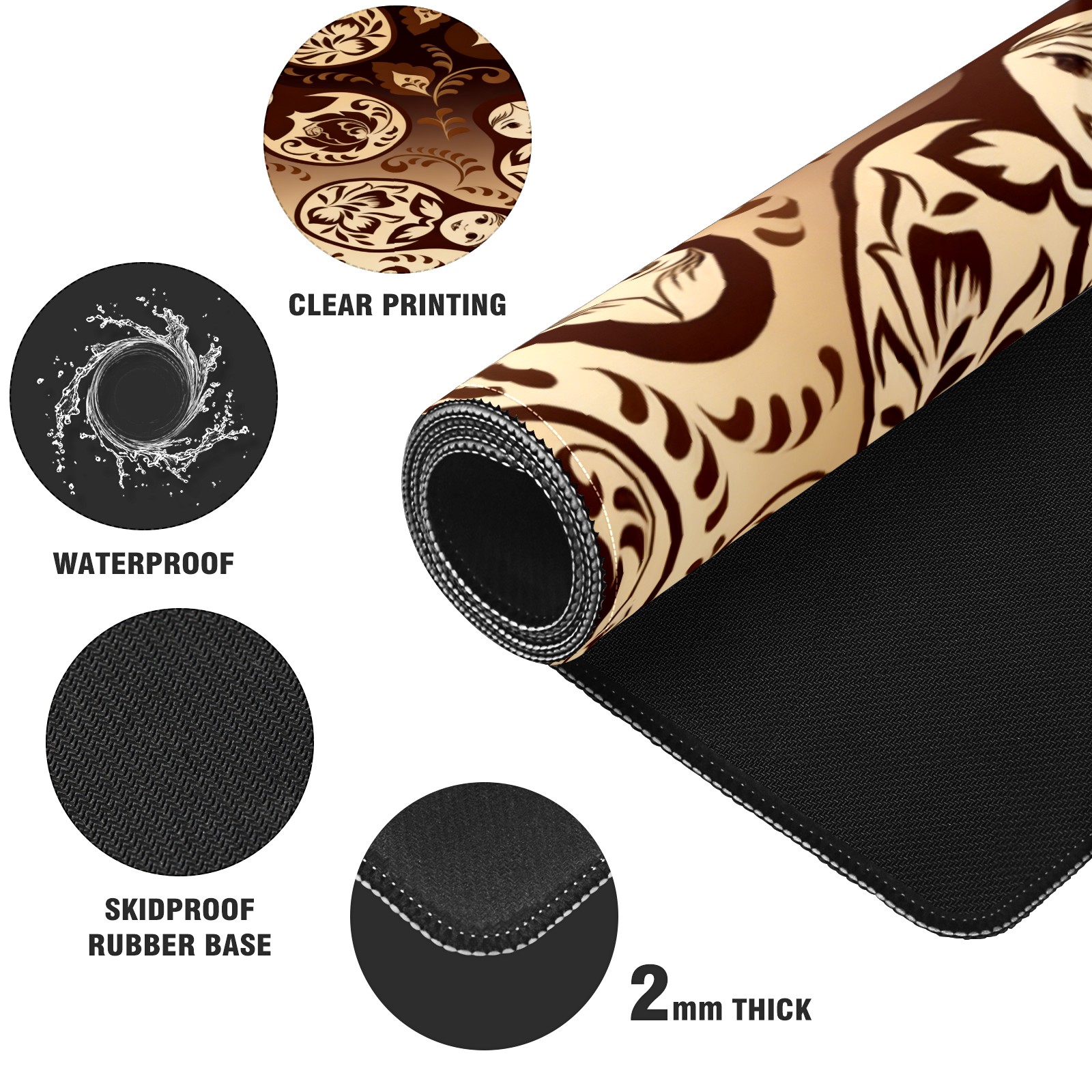 Large Gaming Mouse Pad (90x40cm), Extended Waterproof Desk Mat with Non-Slip Rubber Base, Vintage Patterns Brown for Gamers, Office & Home