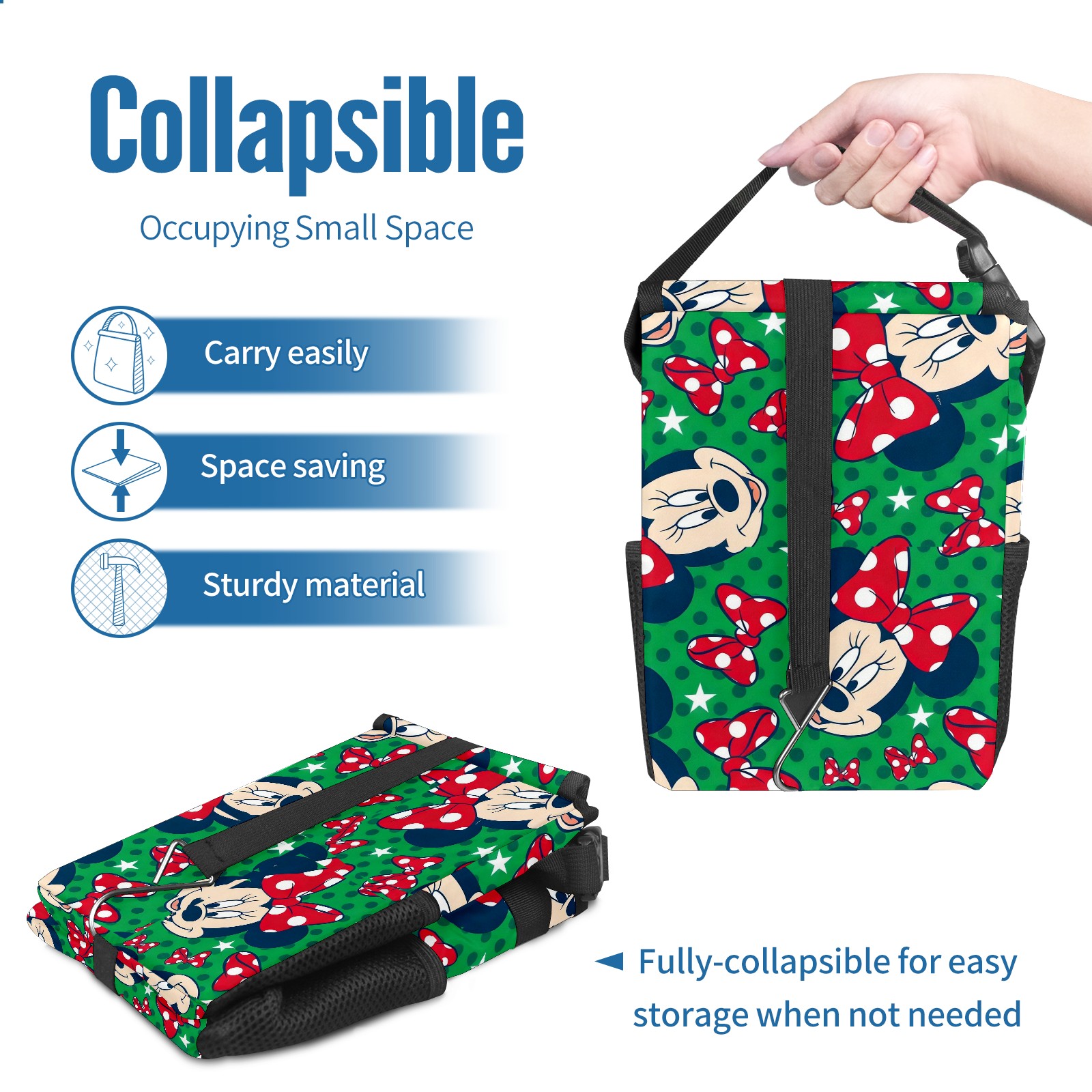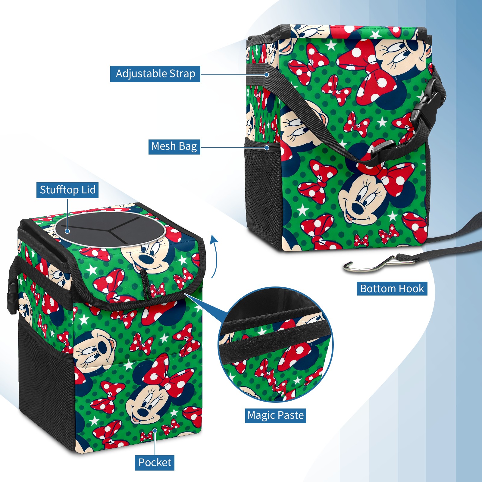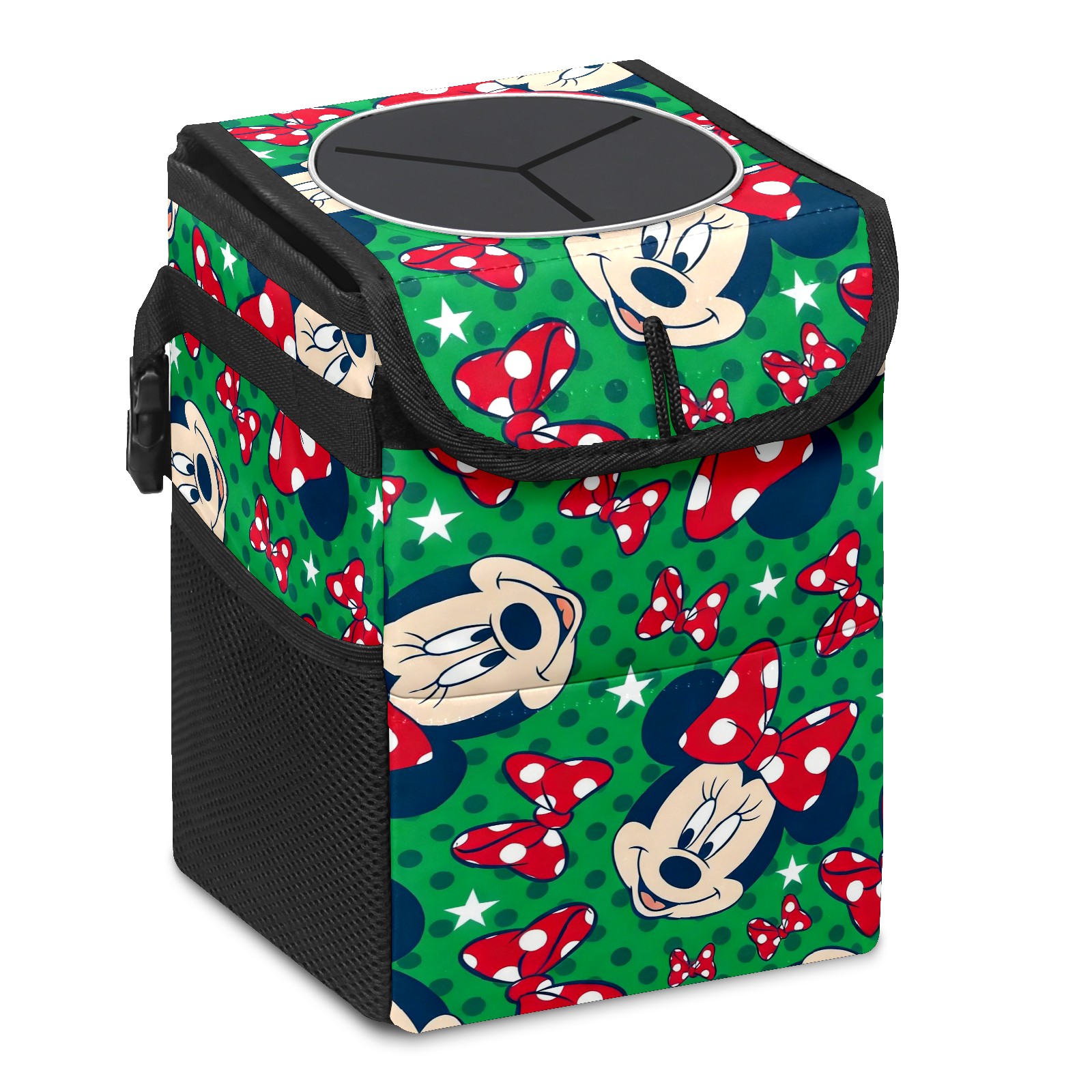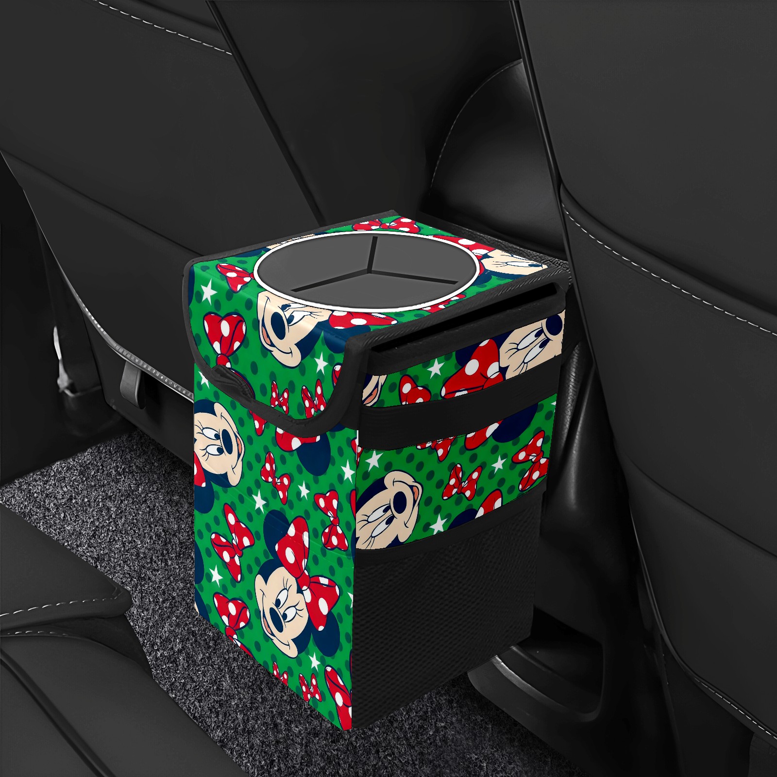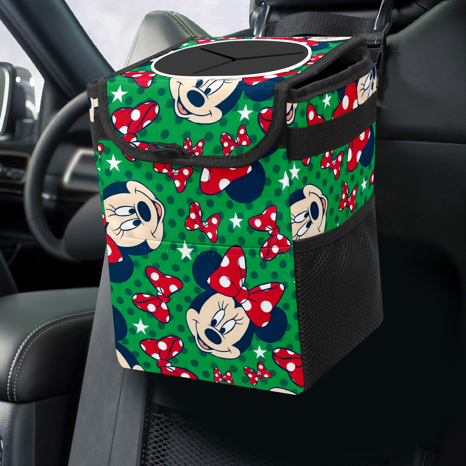 Car Trash Can with Lid, Small Portable Hanging Automotive Garbage Bin for Vehicles, Leakproof Waste Bag Container for SUV Truck Van Interior Auto Travel Road Trips(Mickey Green)
