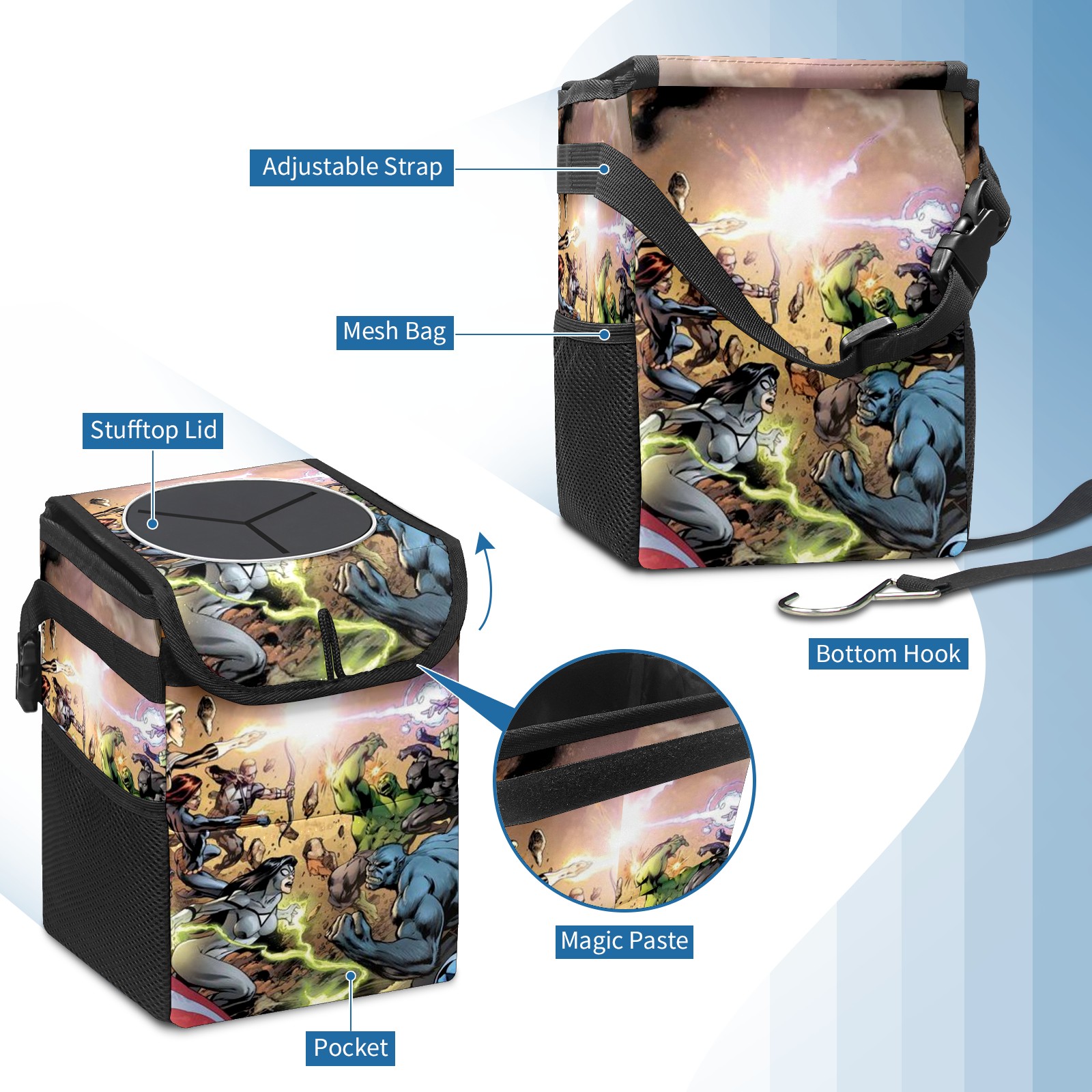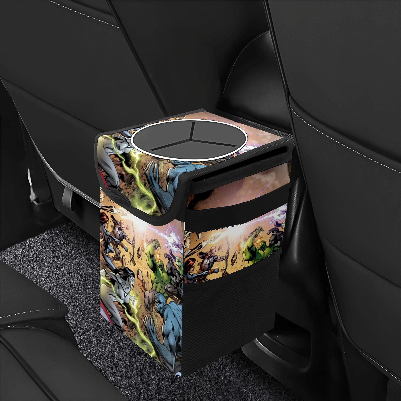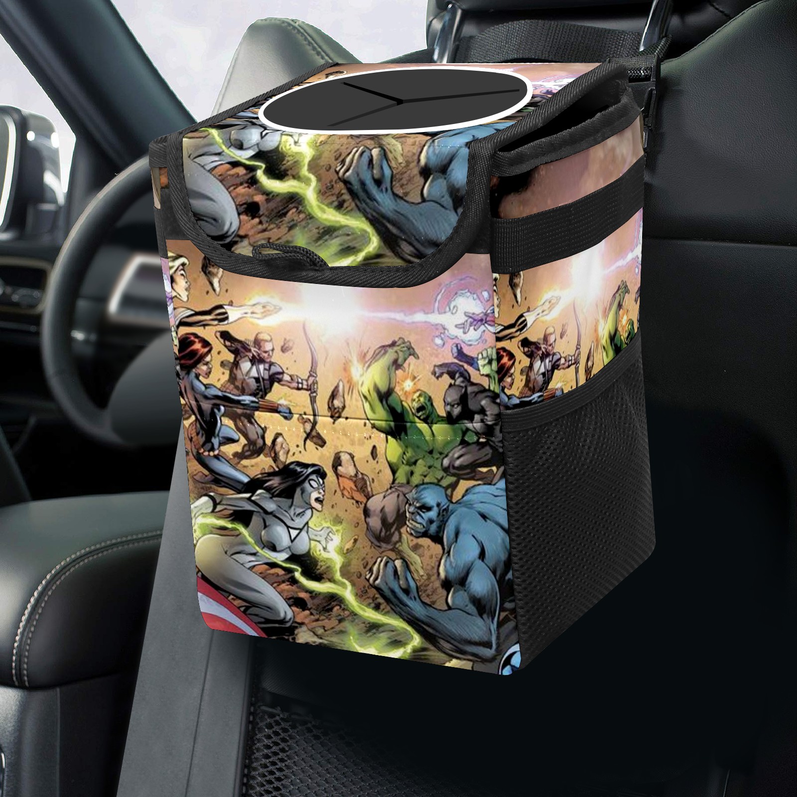Car Trash Can with Lid, Small Portable Hanging Automotive Garbage Bin for Vehicles, Leakproof Waste Bag Container for SUV Truck Van Interior Auto Travel Road Trips(漫威 (1095))