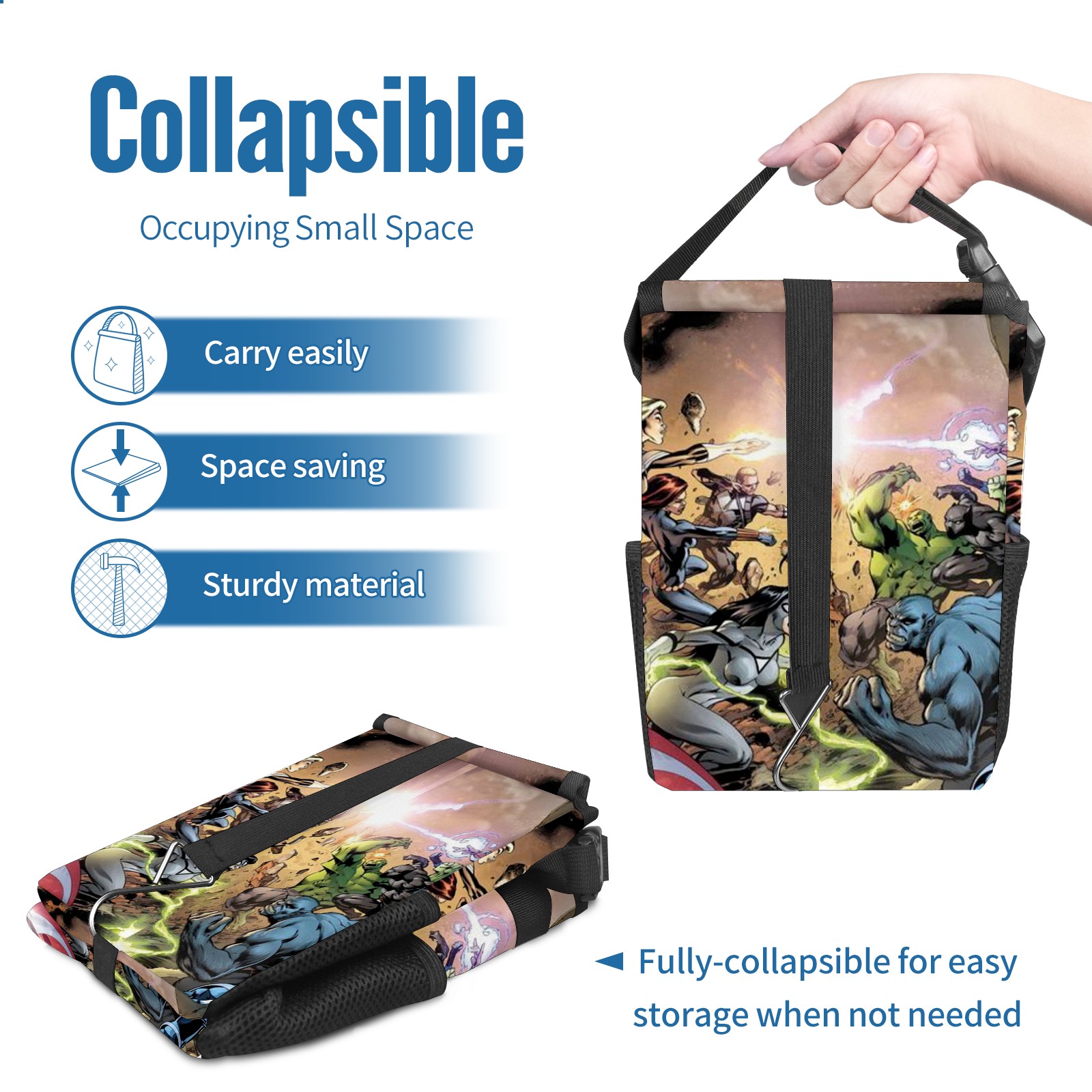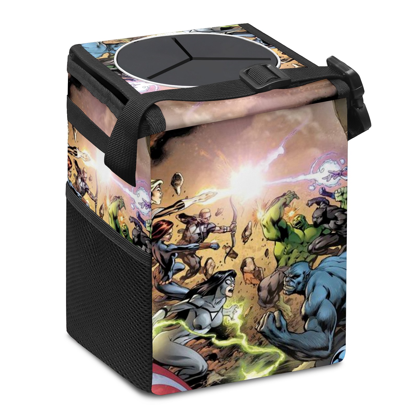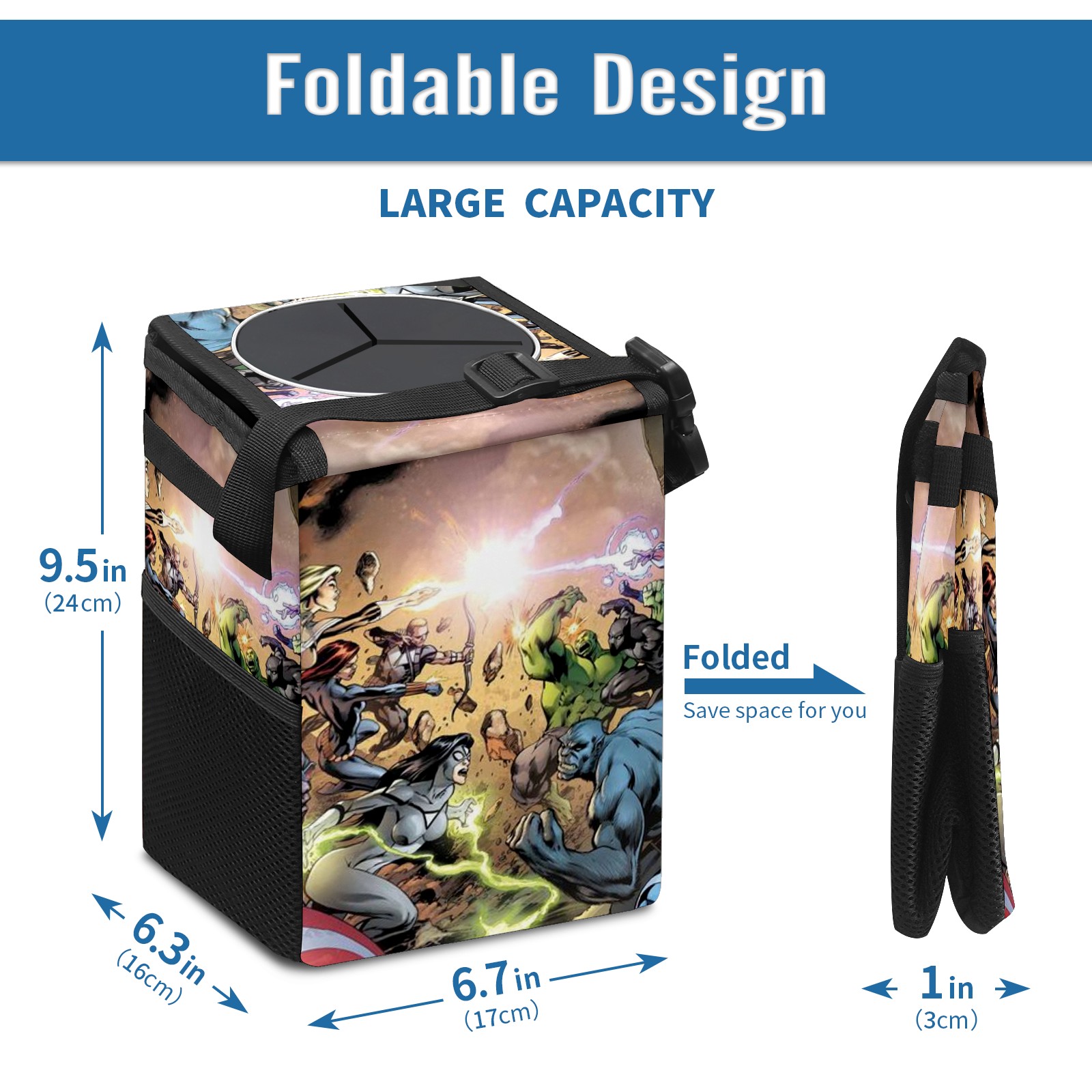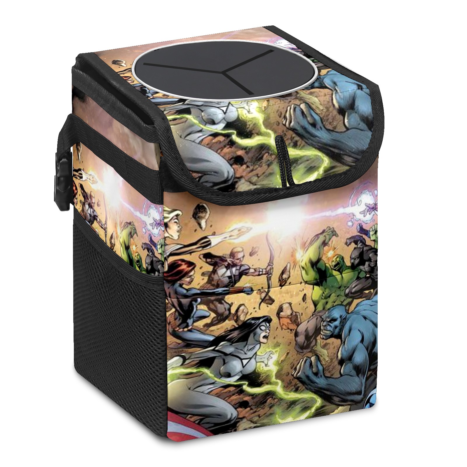 Car Trash Can with Lid, Small Portable Hanging Automotive Garbage Bin for Vehicles, Leakproof Waste Bag Container for SUV Truck Van Interior Auto Travel Road Trips(漫威 (1095))