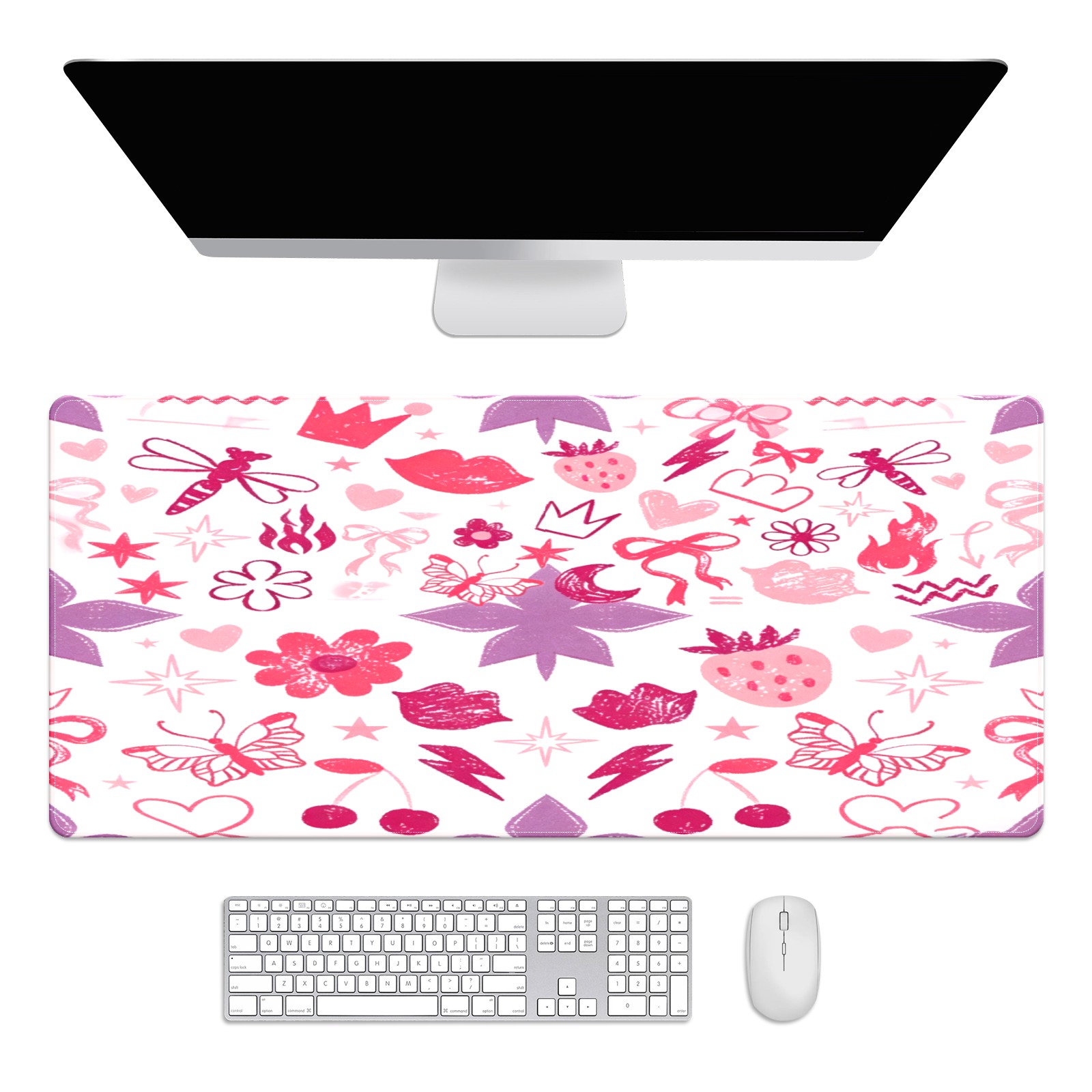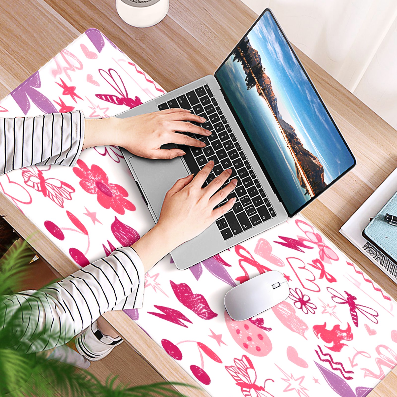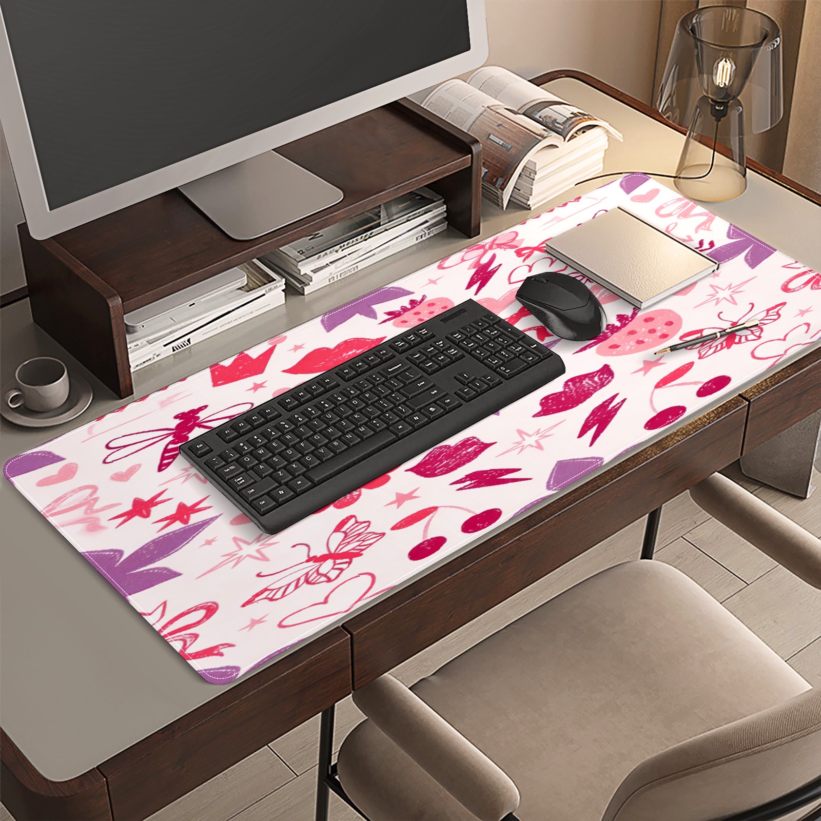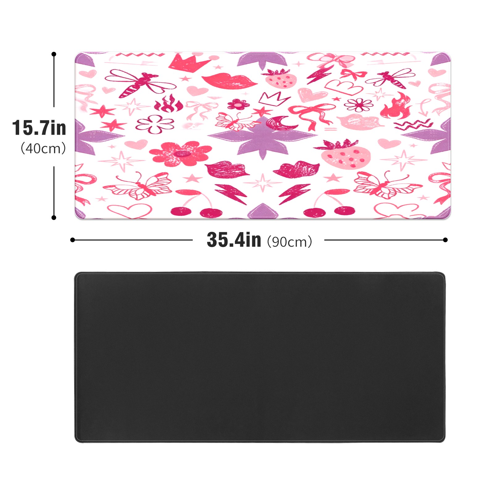 Large Gaming Mouse Pad (90x40cm), Extended Waterproof Desk Mat with Non-Slip Rubber Base, Soft Floral Heart Pink for Gamers, Office & Home