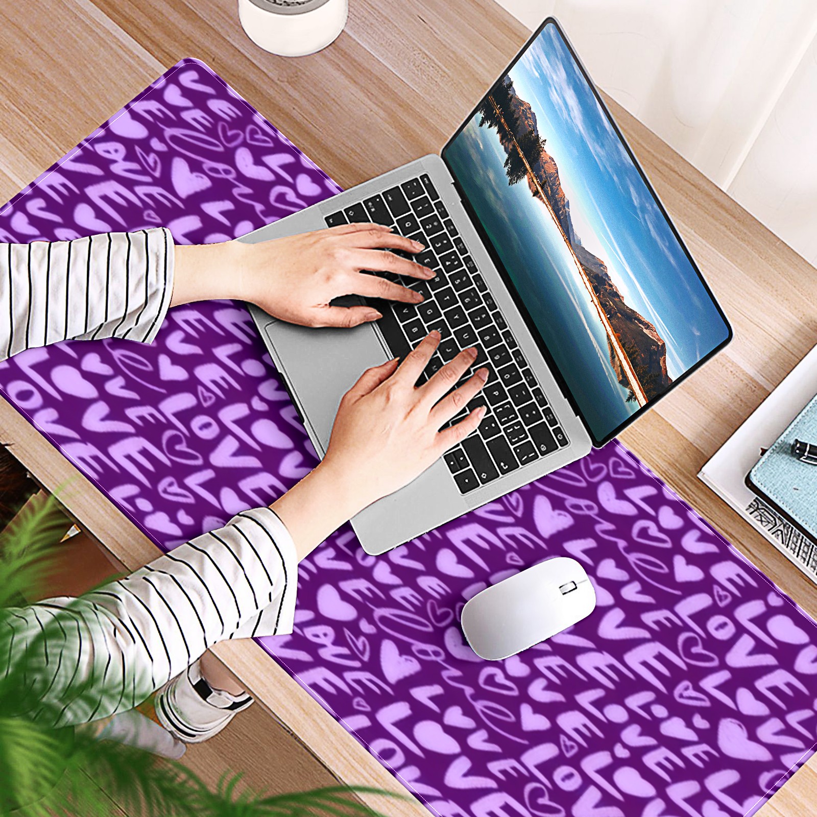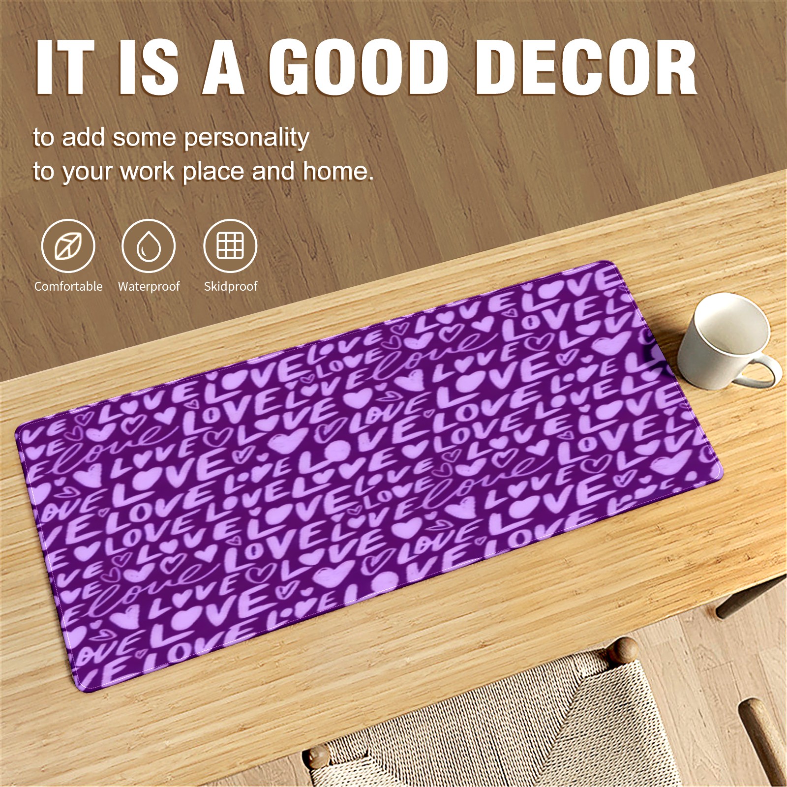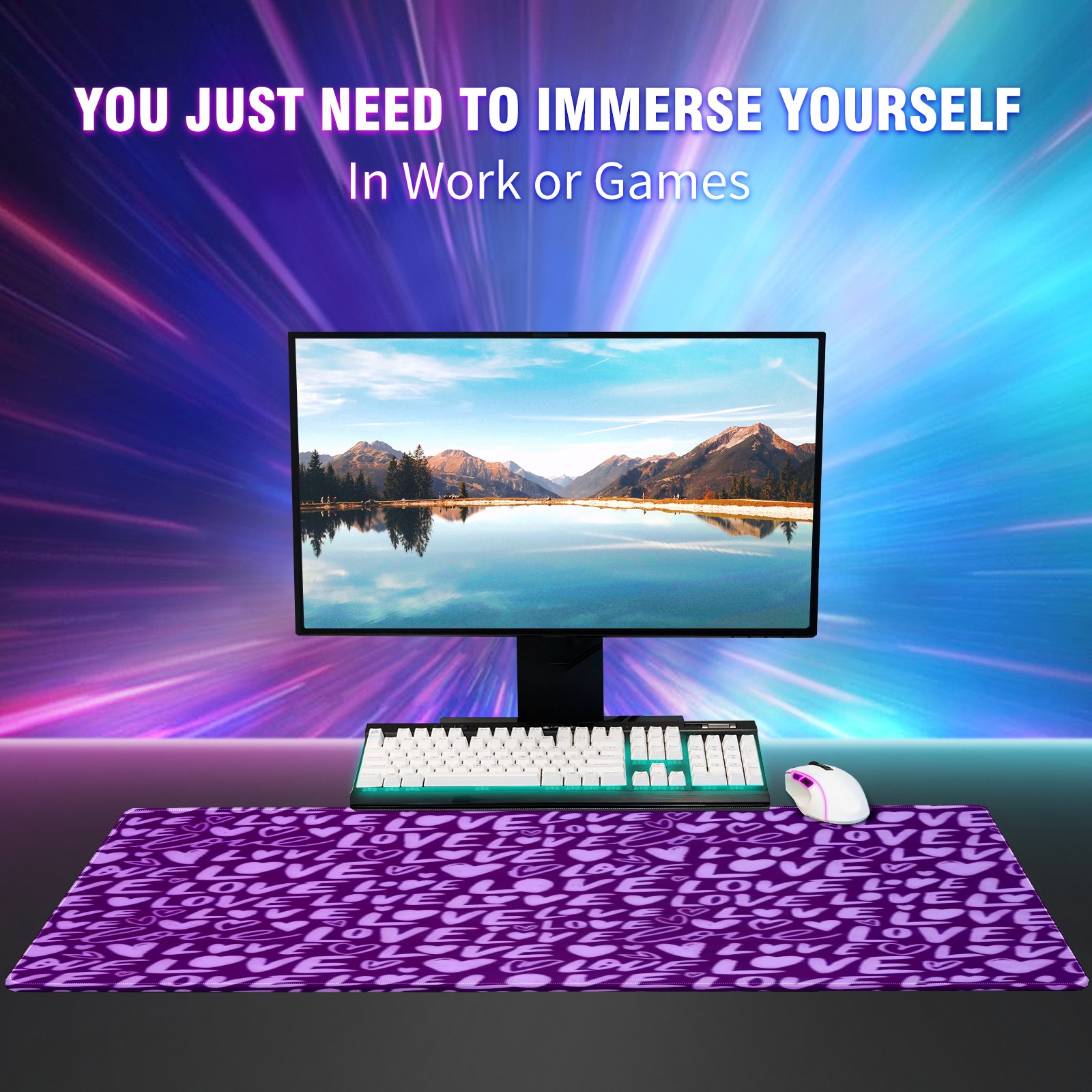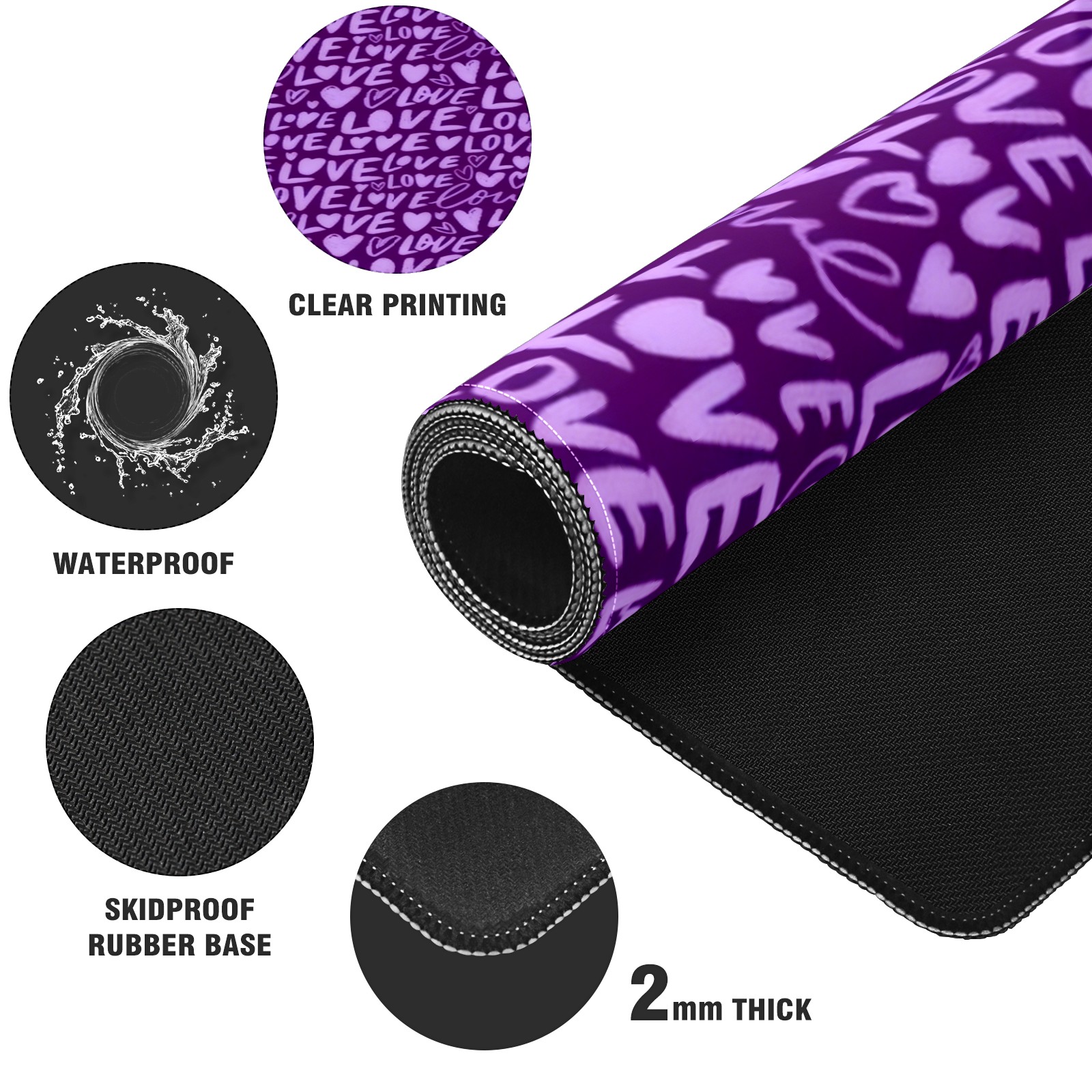 Large Gaming Mouse Pad (90x40cm), Extended Waterproof Desk Mat with Non-Slip Rubber Base, Fiery LOVE Text Purple for Gamers, Office & Home