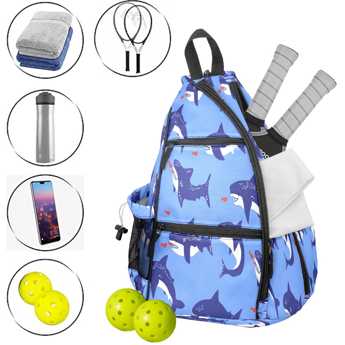 Multifunctional Pickleball Bag,Large Capacity Sports Pickleball Racket Bag, Water Bottle Holder and Fence Hook,Suitable for Both Men Women -Cartoon Shark Eating Fish