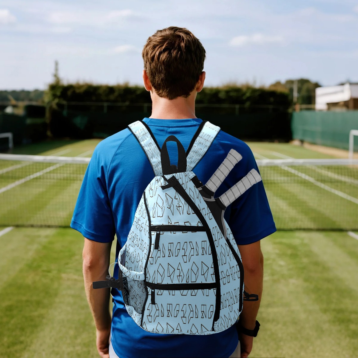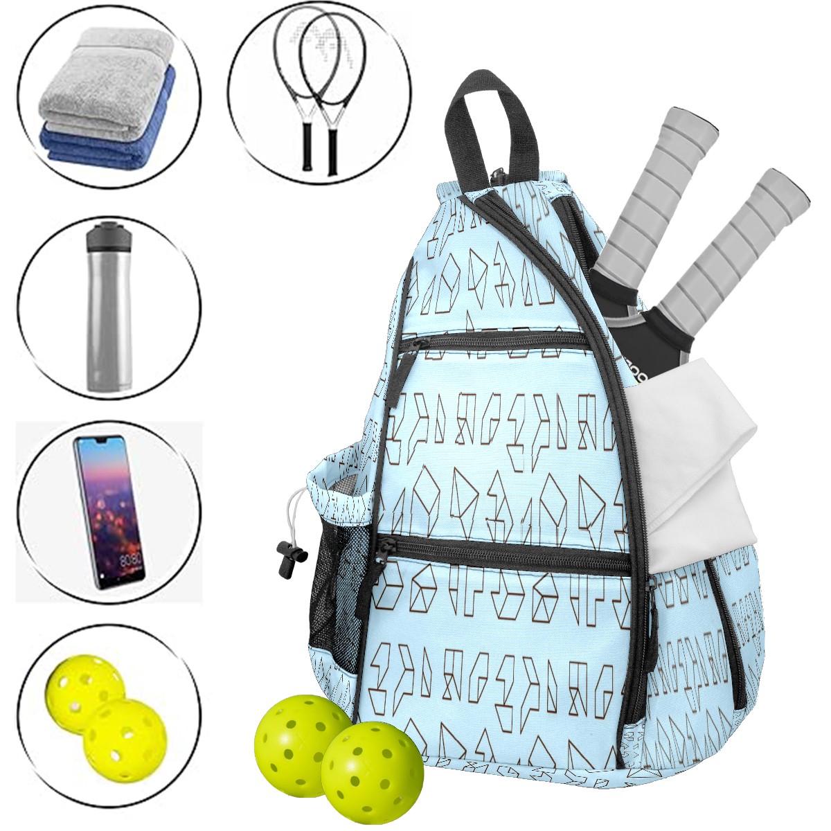 Multifunctional Pickleball Bag,Large Capacity Sports Pickleball Racket Bag, Water Bottle Holder and Fence Hook,Suitable for Both Men Women -Outline Geometric Blue