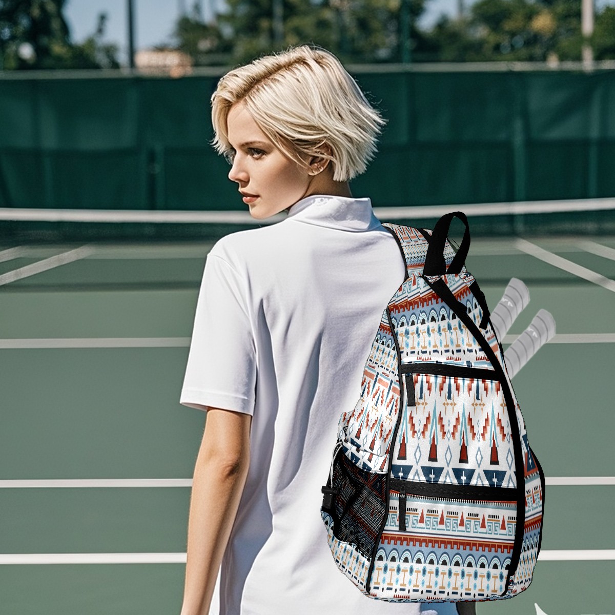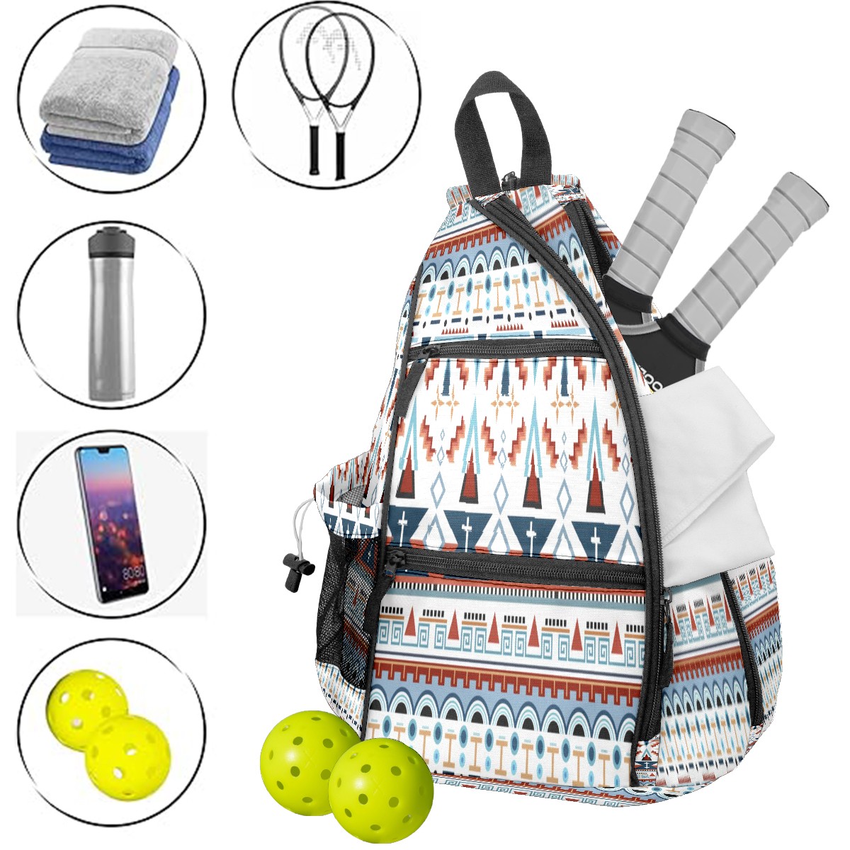 Multifunctional Pickleball Bag,Large Capacity Sports Pickleball Racket Bag, Water Bottle Holder and Fence Hook,Suitable for Both Men Women -Illustration Ethnic Geometric