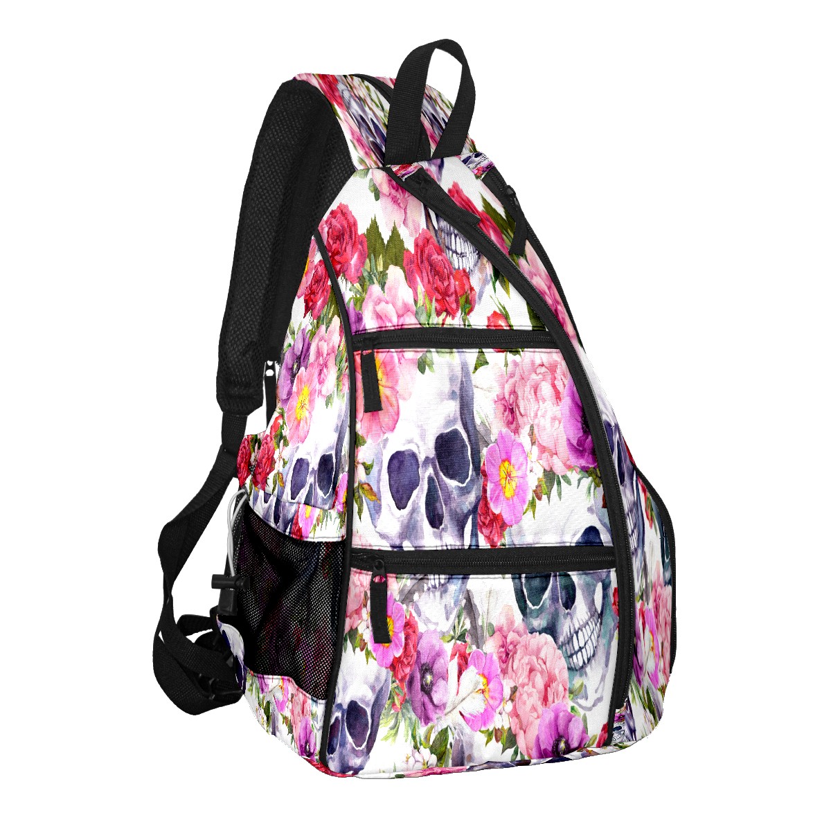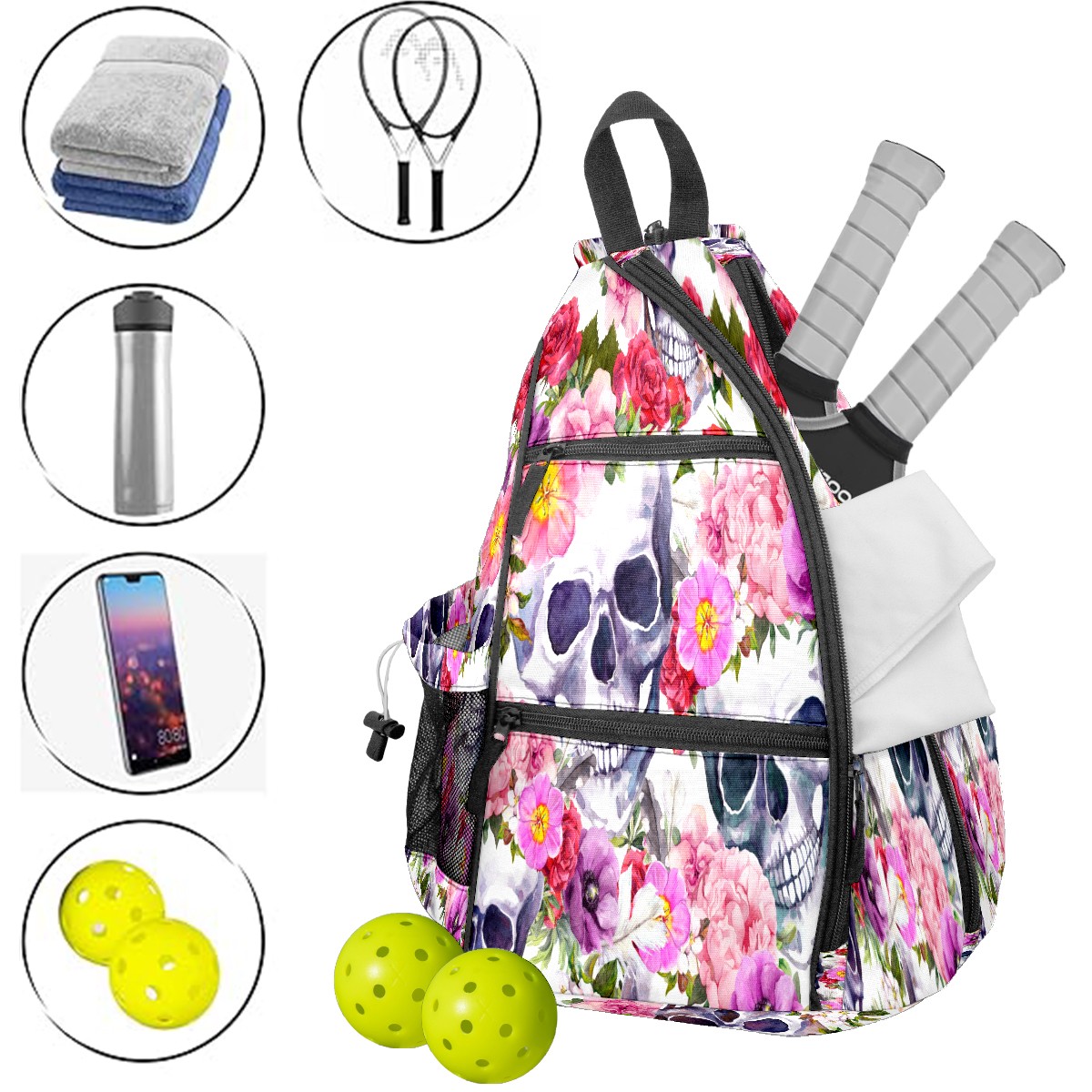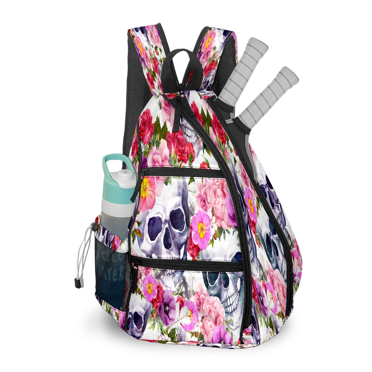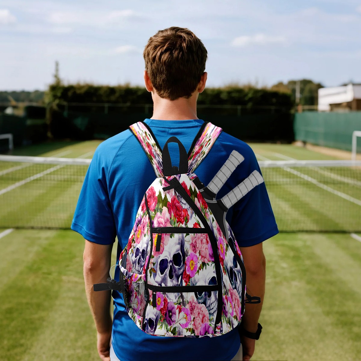 Multifunctional Pickleball Bag,Large Capacity Sports Pickleball Racket Bag, Water Bottle Holder and Fence Hook,Suitable for Both Men Women -Colorful Flowers And Skull Pattern