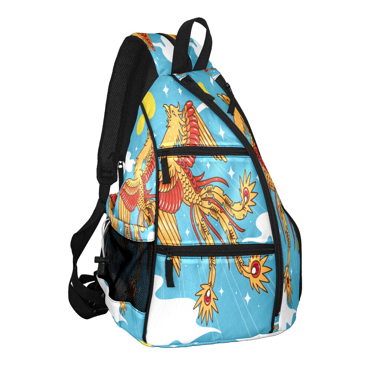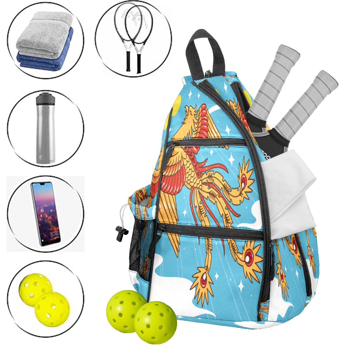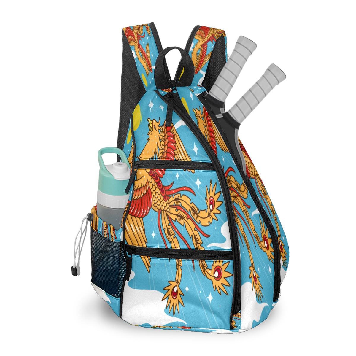 Multifunctional Pickleball Bag,Large Capacity Sports Pickleball Racket Bag, Water Bottle Holder and Fence Hook,Suitable for Both Men Women -Hand Drawn Phoenix Sky Sun
