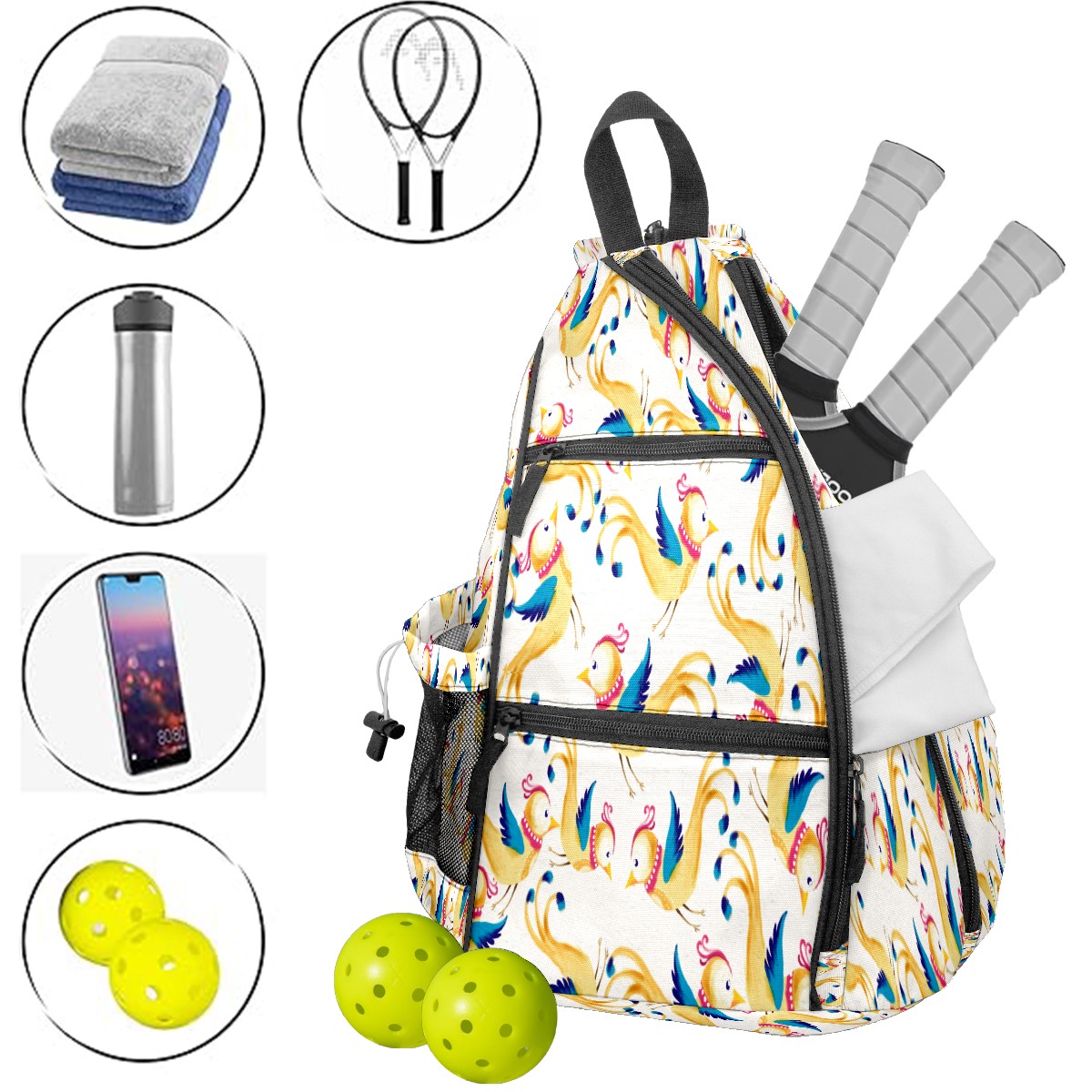 Multifunctional Pickleball Bag,Large Capacity Sports Pickleball Racket Bag, Water Bottle Holder and Fence Hook,Suitable for Both Men Women -Watercolor Cute Birds