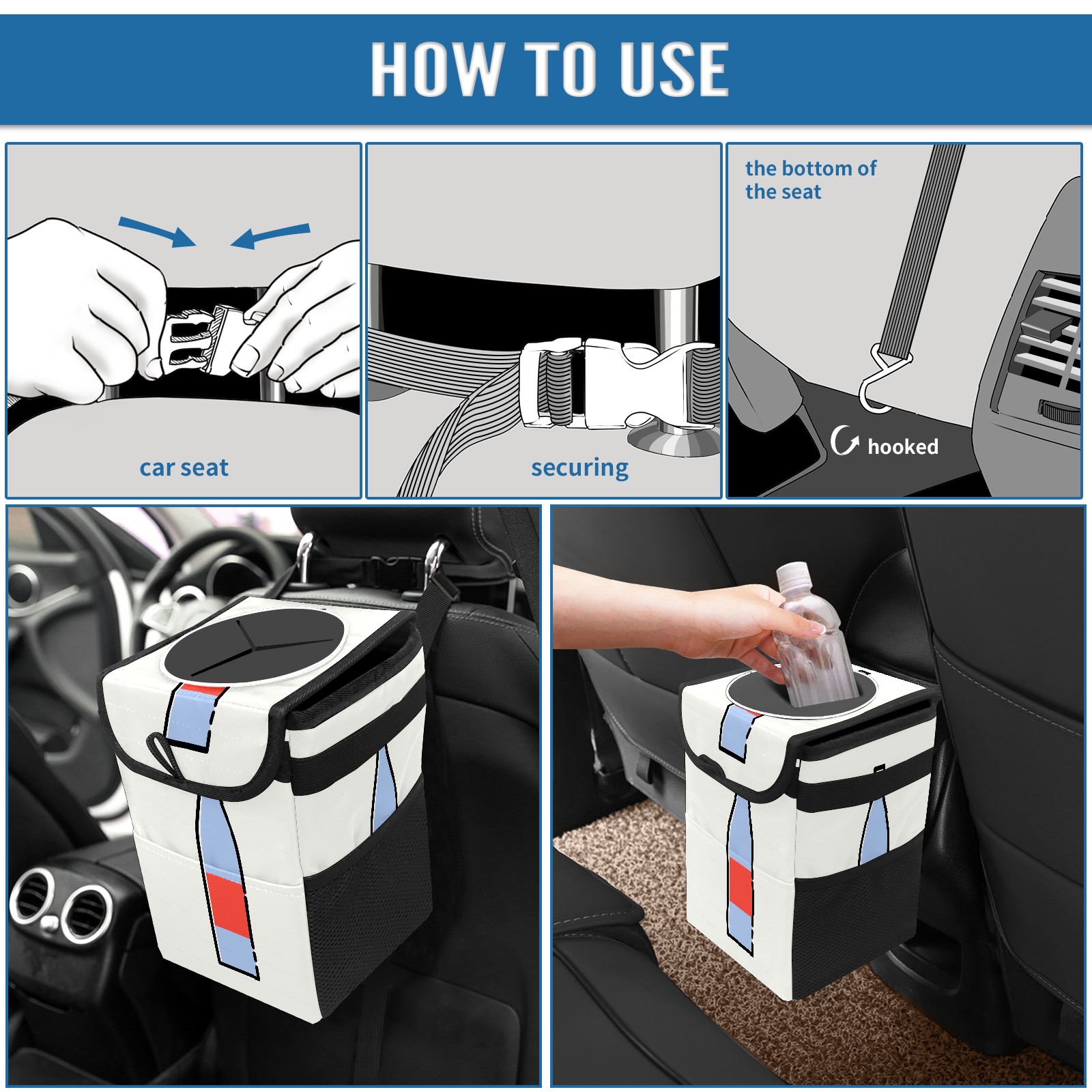 • <p>Keep your car neat with this practical car trash can—built for durability, versatility, and on-the-go convenience! Crafted from quality twill fabric with a waterproof lining, it prevents leaks, keeping seats/floors clean. Clean easily: empty directly or secure a disposable bag with side clips. Adjustable pull cord fits floor, seat, or headrest. 9.5x6.3x6.7 inches, ample space for daily trash, folds flat for storage. More than a trash can, it doubles as a storage bag for cups, toys, docs, and small gadgets—must-have car interior accessory. Installs in seconds on seats, console, or gear shift; adjustable straps keep it stable, no slipping on bumpy roads. Perfect gift for new car owners!</p>
